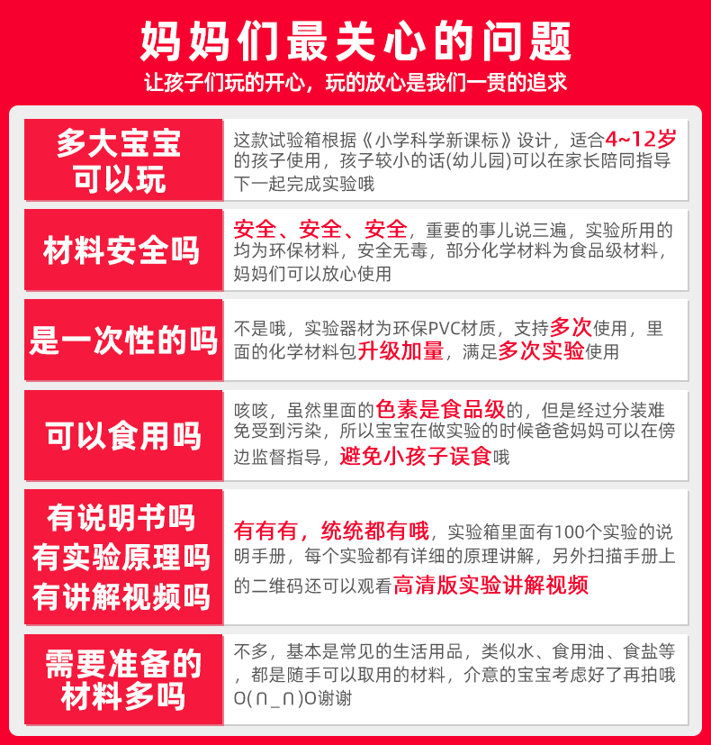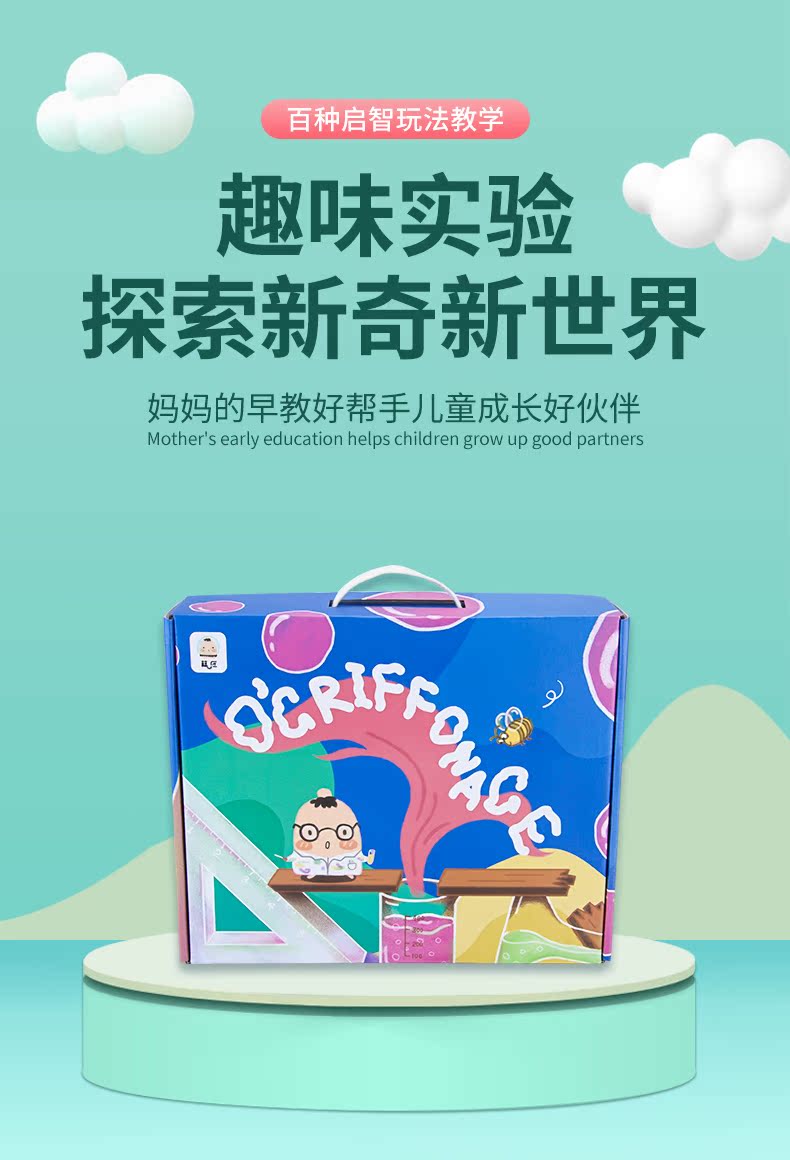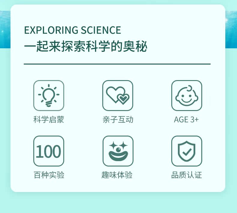 安全环保,食品级原材料,实验数量多,材料丰富,趣味性强,促进亲子互动,让孩子远离电子游戏,培养学习兴趣,锻炼动手能力,挖掘科学天赋,每个孩子都梦想成为一名科学家!