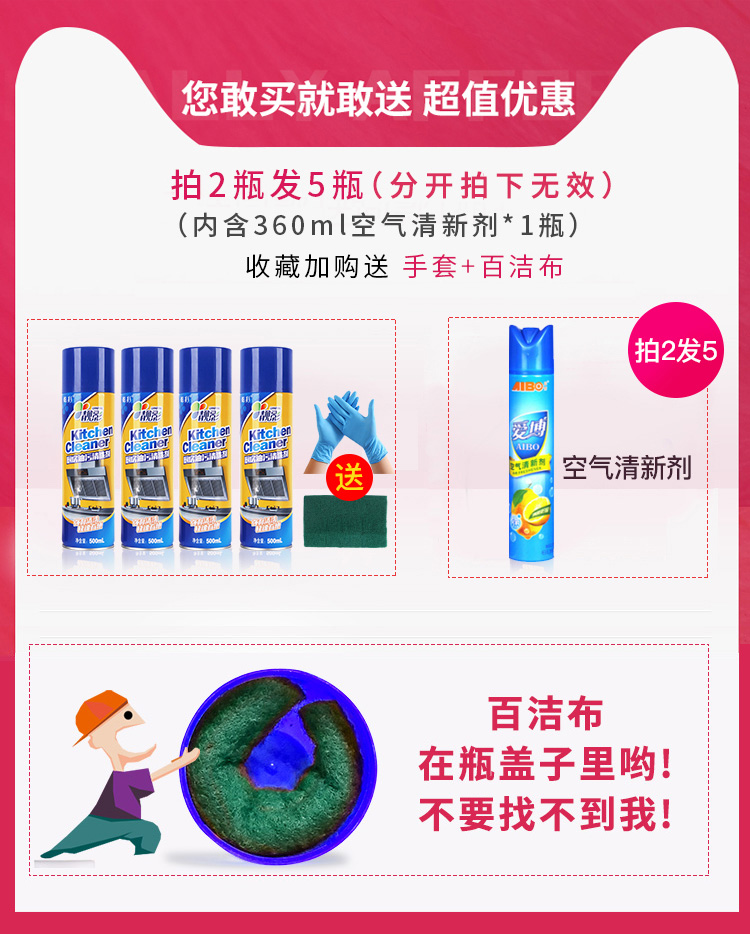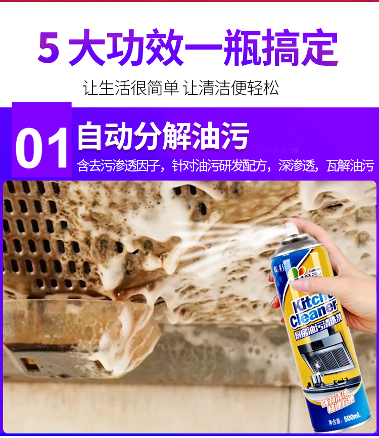 【拍2发5】厨房强力去油污神器,泡沫丰富渗透力强,5大功效,轻松瓦解重油污,360度旋转喷头,安全环保,无毒无害~母婴可用,快速溶解一喷/一擦,还您干净漂亮厨房~~买就送手套+百洁布【赠运费险】