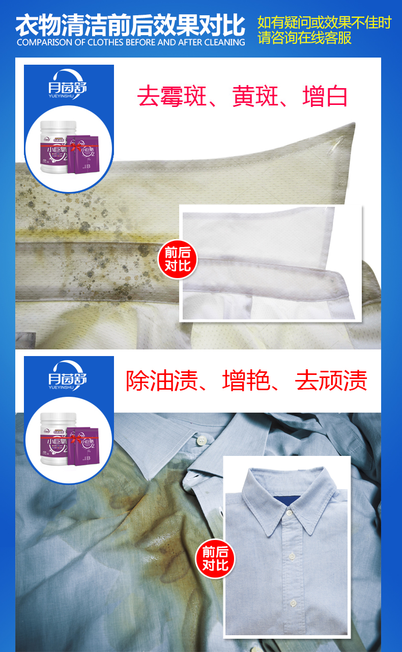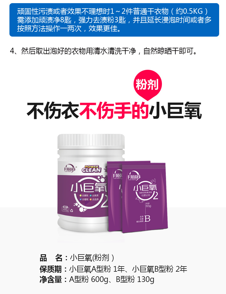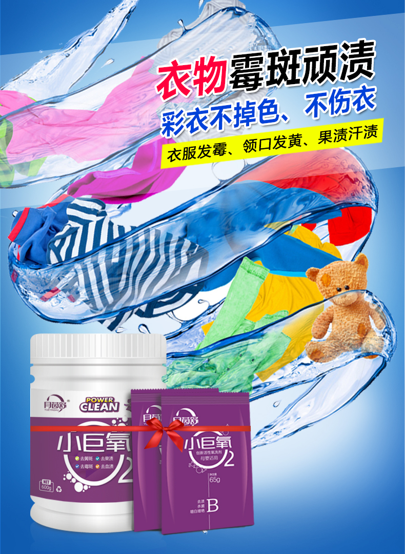 选用粉剂小巨氧,不伤衣,不伤手,不让衣服掉色,去霉斑,除油渍,去果渍等衣服污渍问题,家用衣物清洁神器,居家必备~