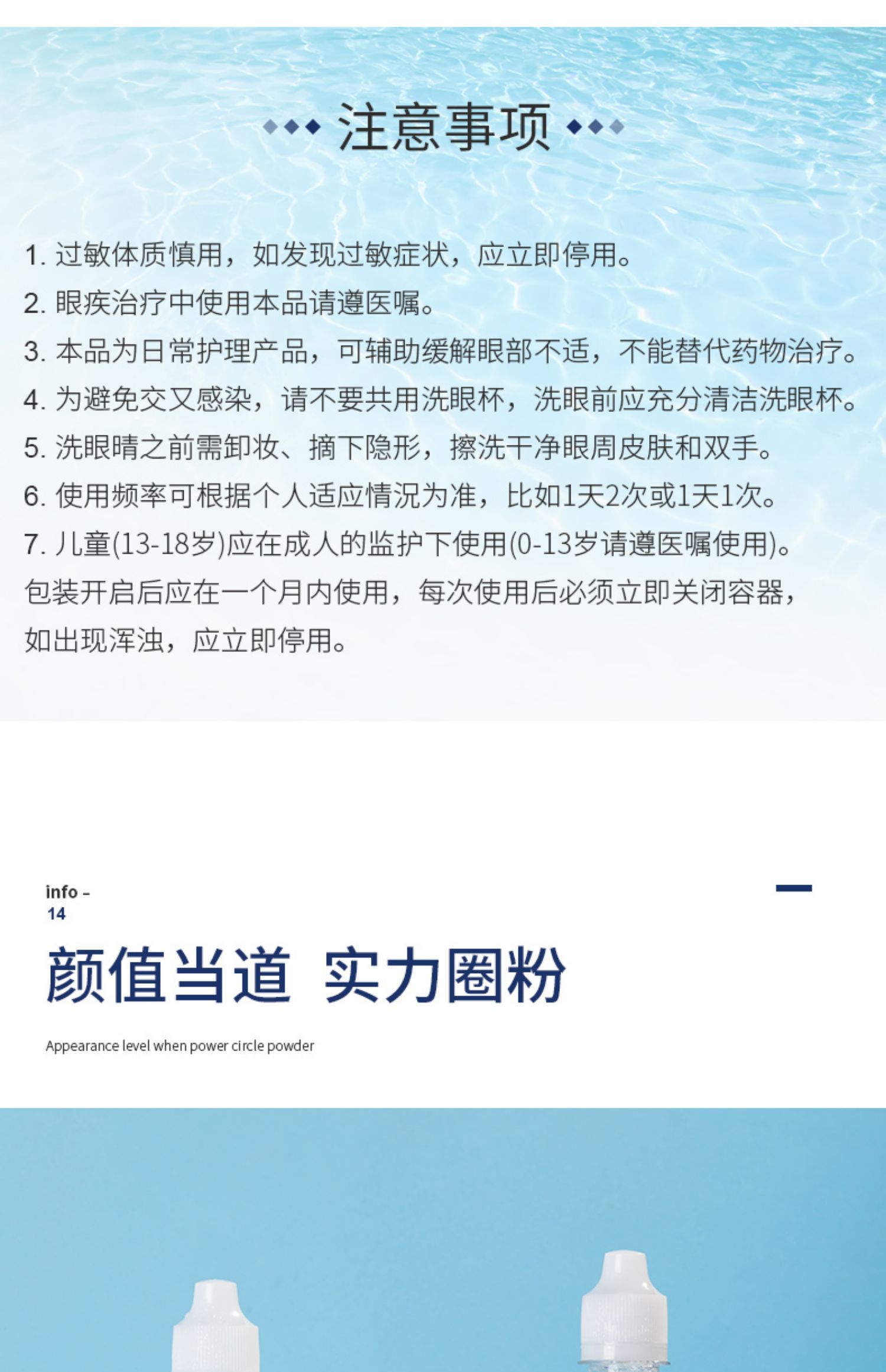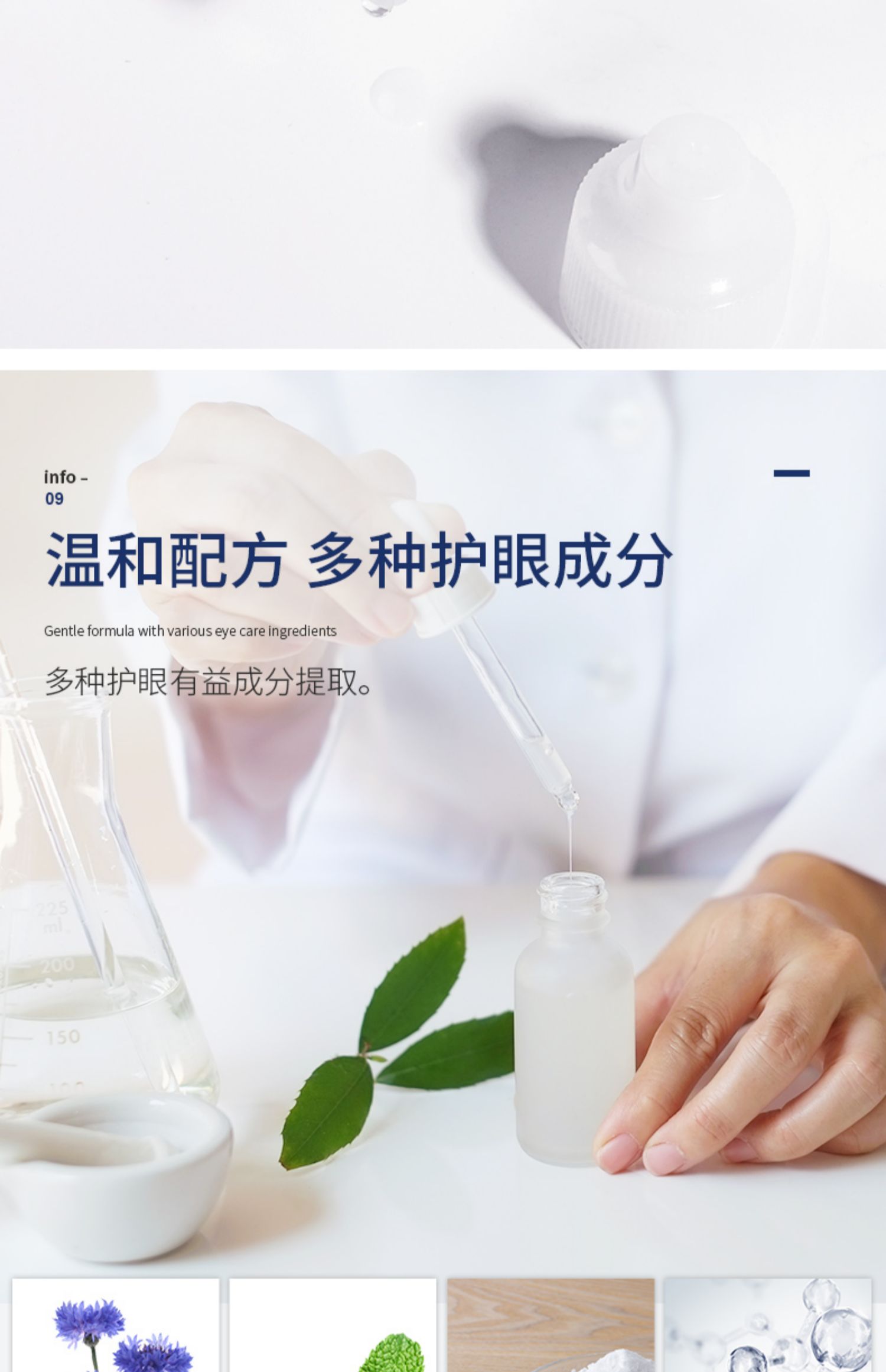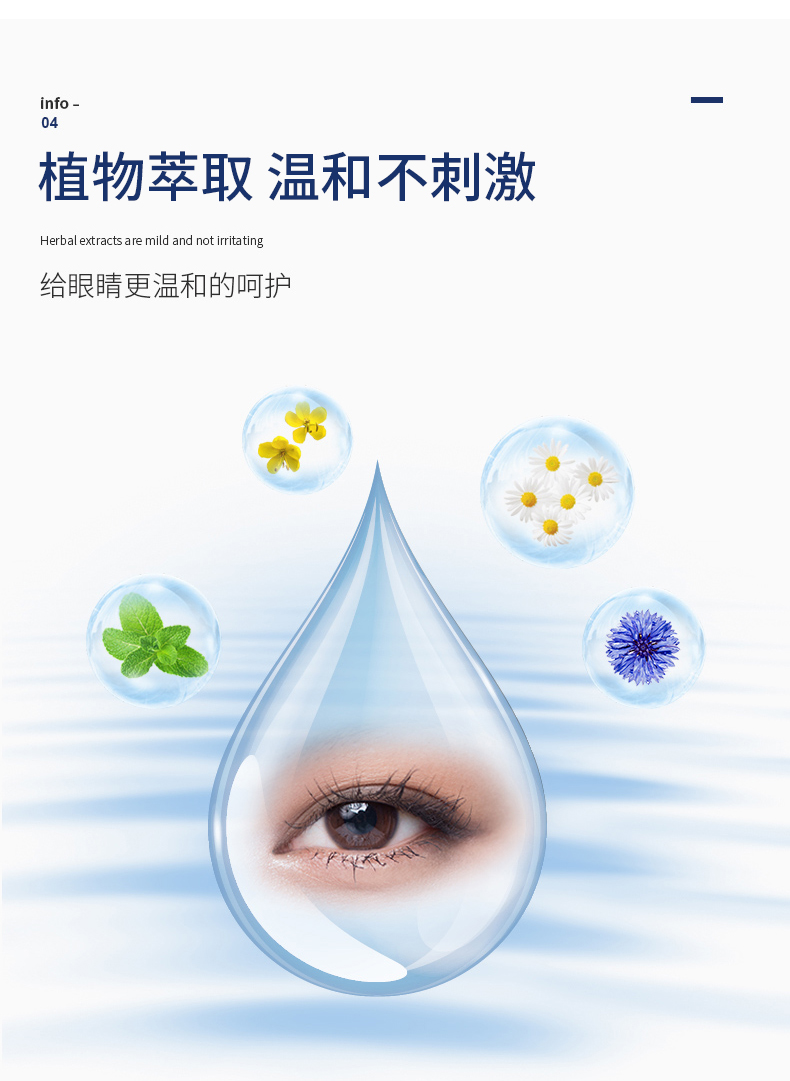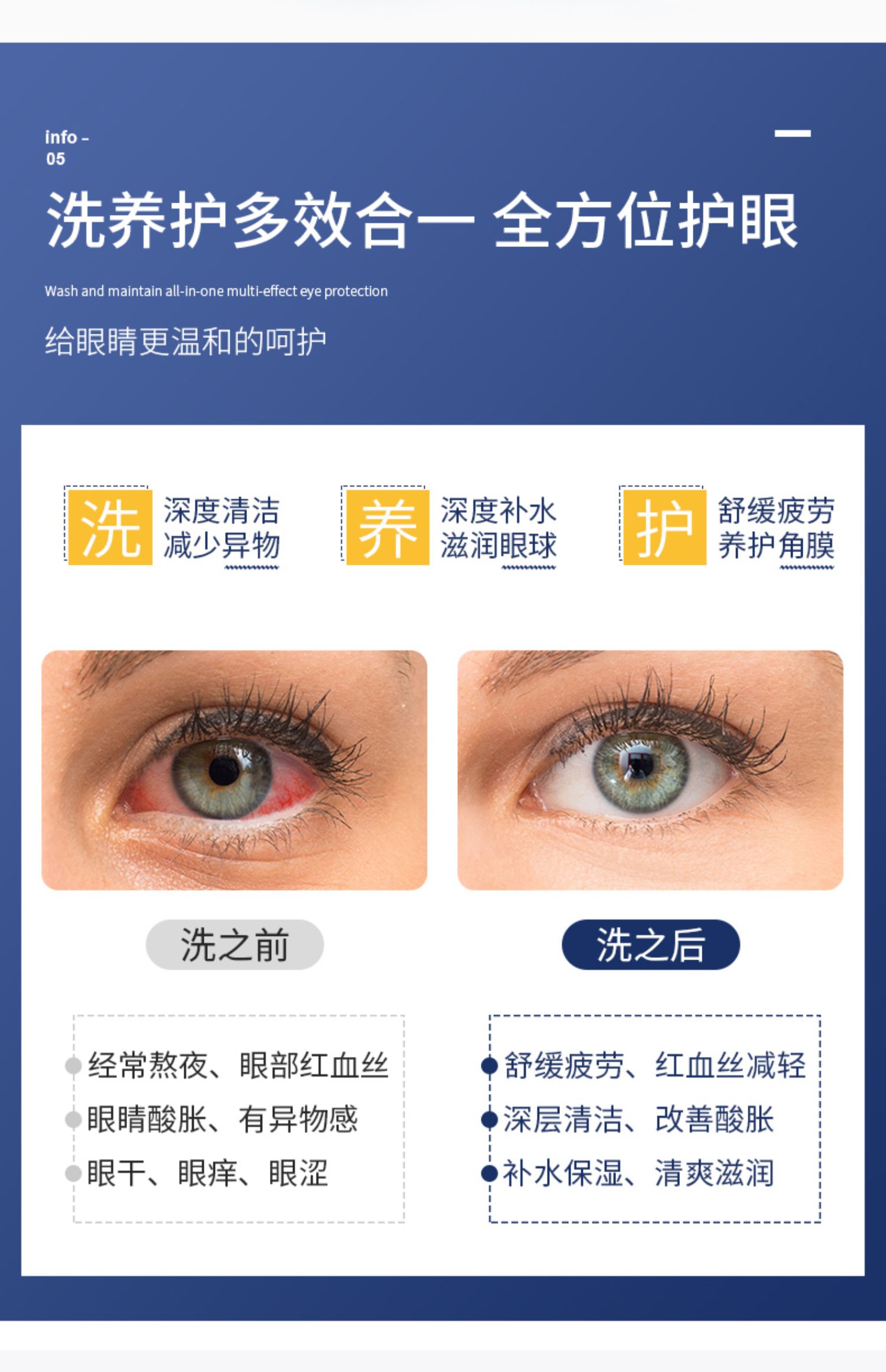 科学配方,清洁明目,润目保湿,保护角膜。缓和眼干眼氧,抵御蓝光,补充眼睛所需维生素,缓解畏光,一洗一敷,灵动你的双眼,开启护眼新境界!