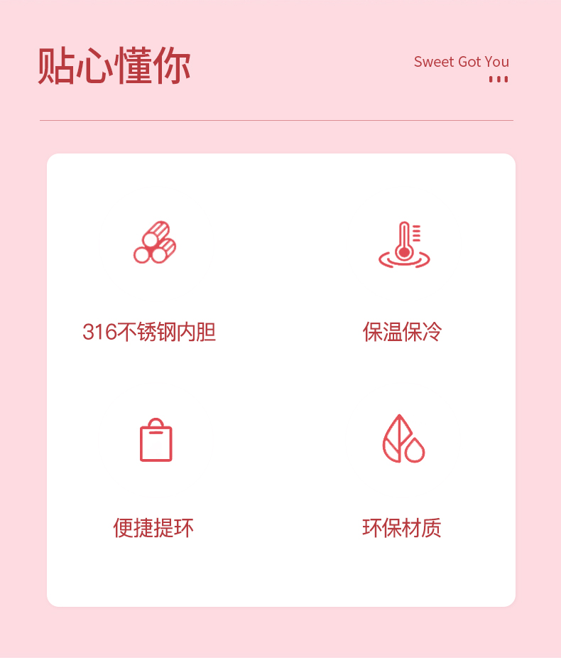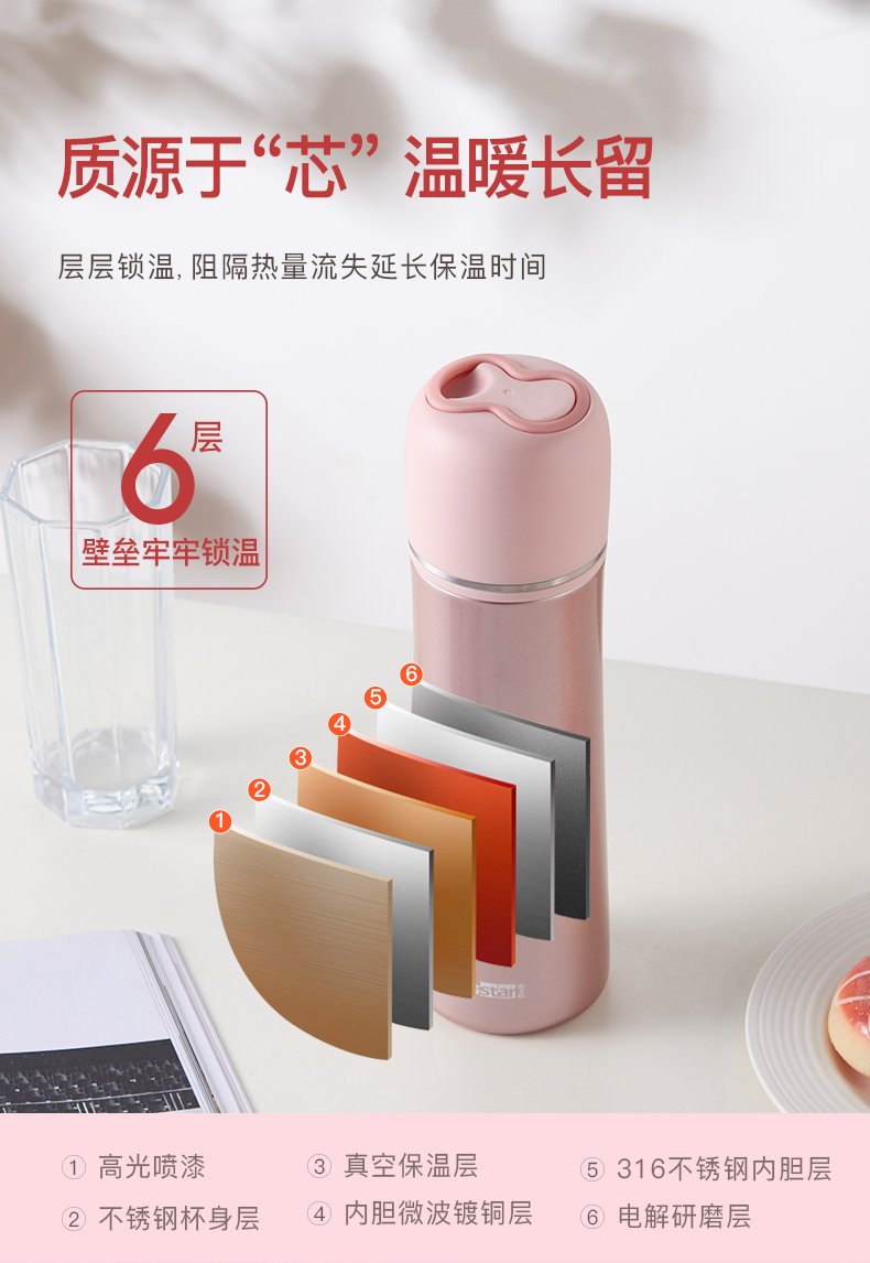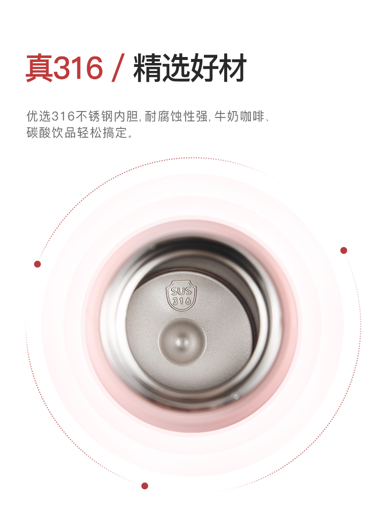 一杯两用,实力暖心派~精选316不锈钢内胆,环保材质,保暖保冷,耐腐浊性强,6层锁温,隐藏式提绳设计,结实耐用舒适轻巧!
