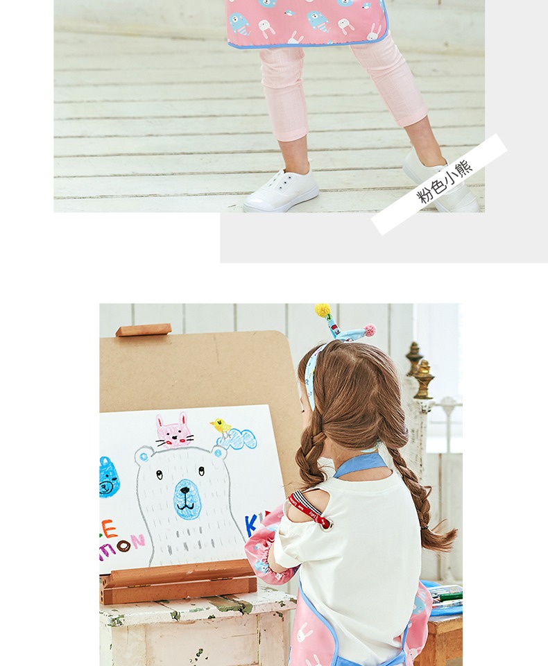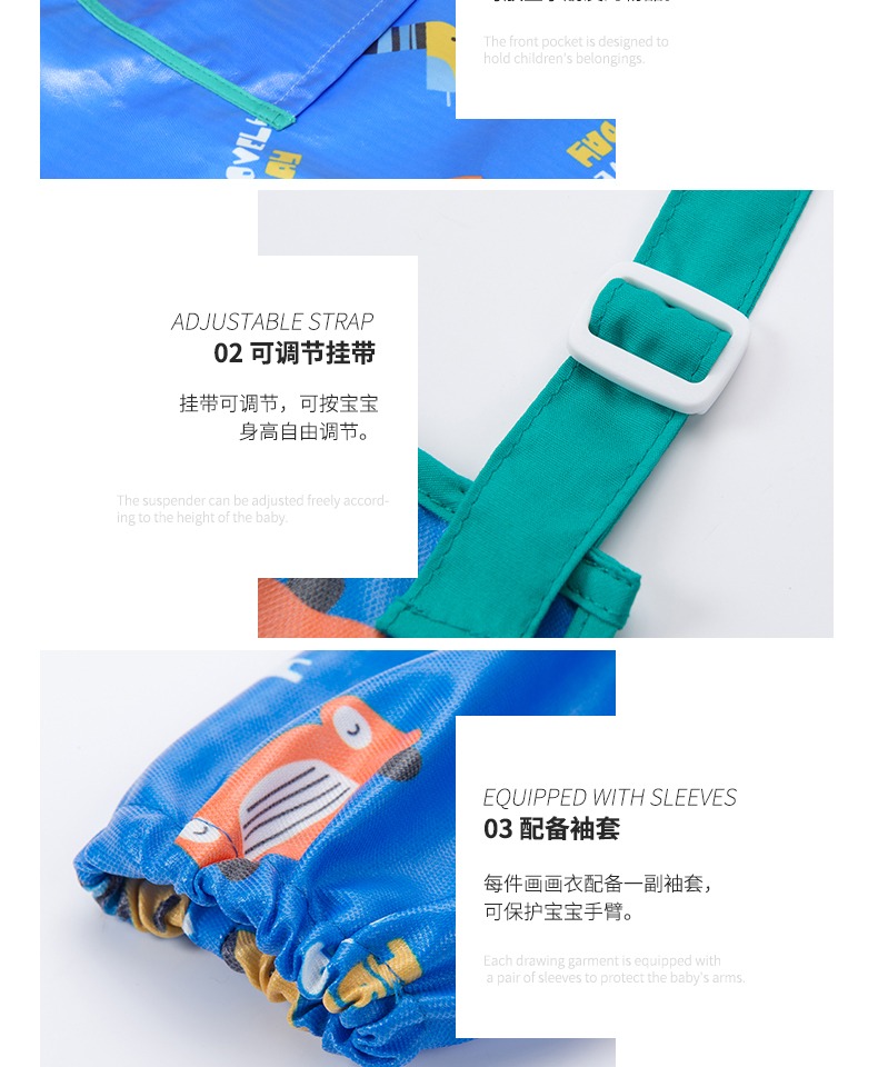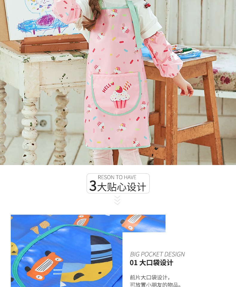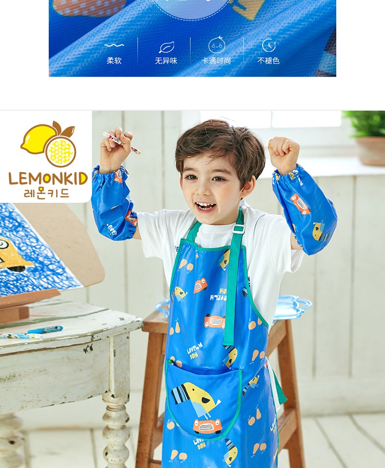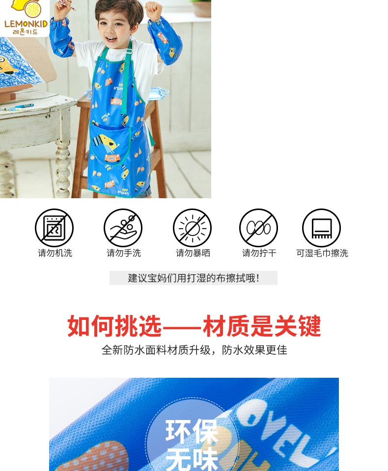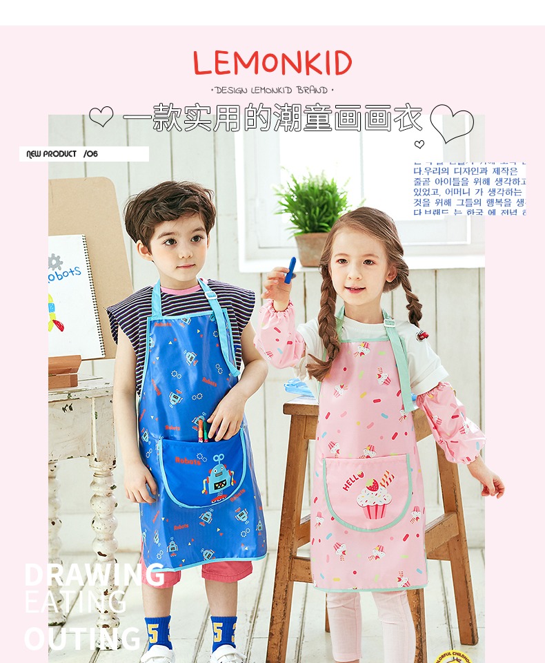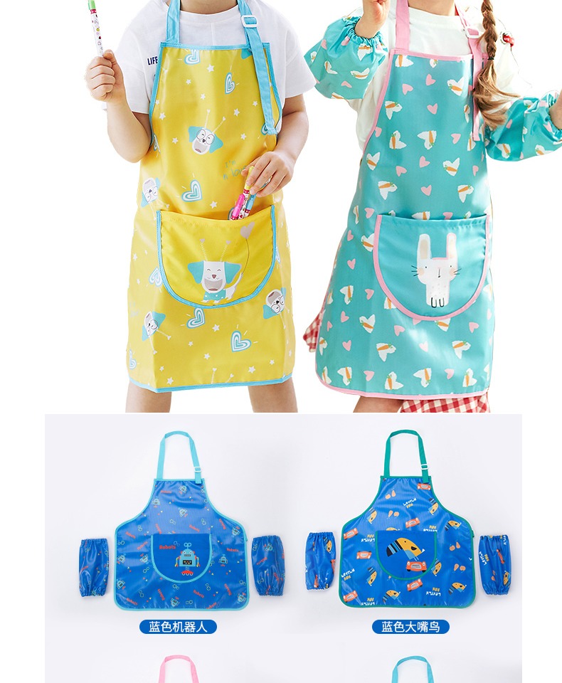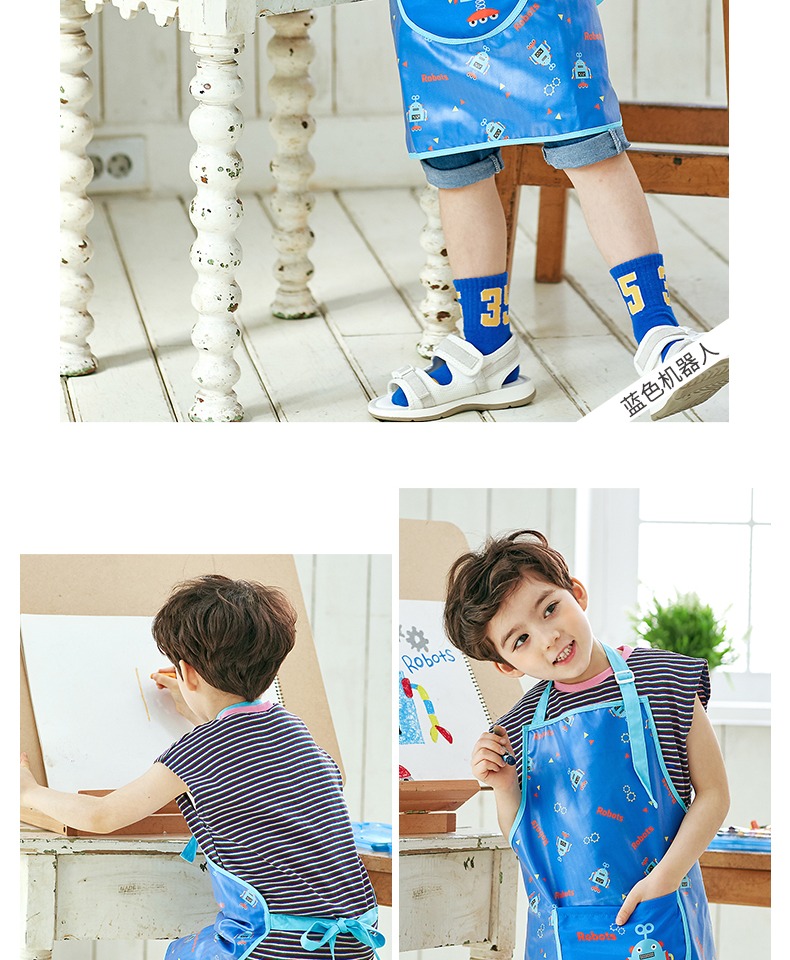 一款实用的潮童画画衣,全新防水面料材质升级,防水效果更佳,无异味,卡通时尚,不褪色,前片大口袋设计,可调节挂带,配备袖套,妈妈好帮手。