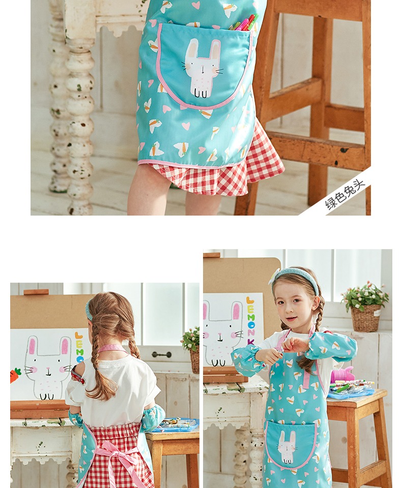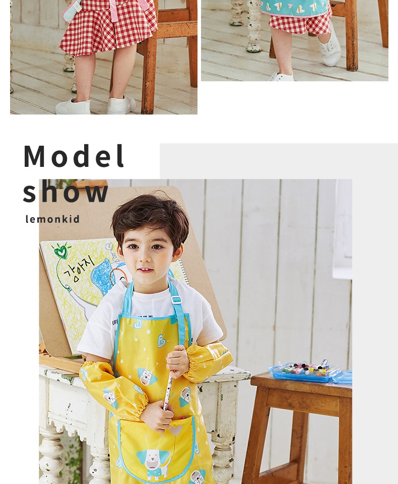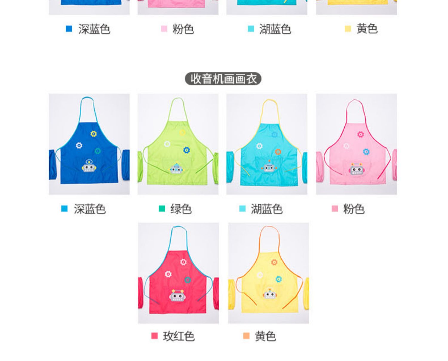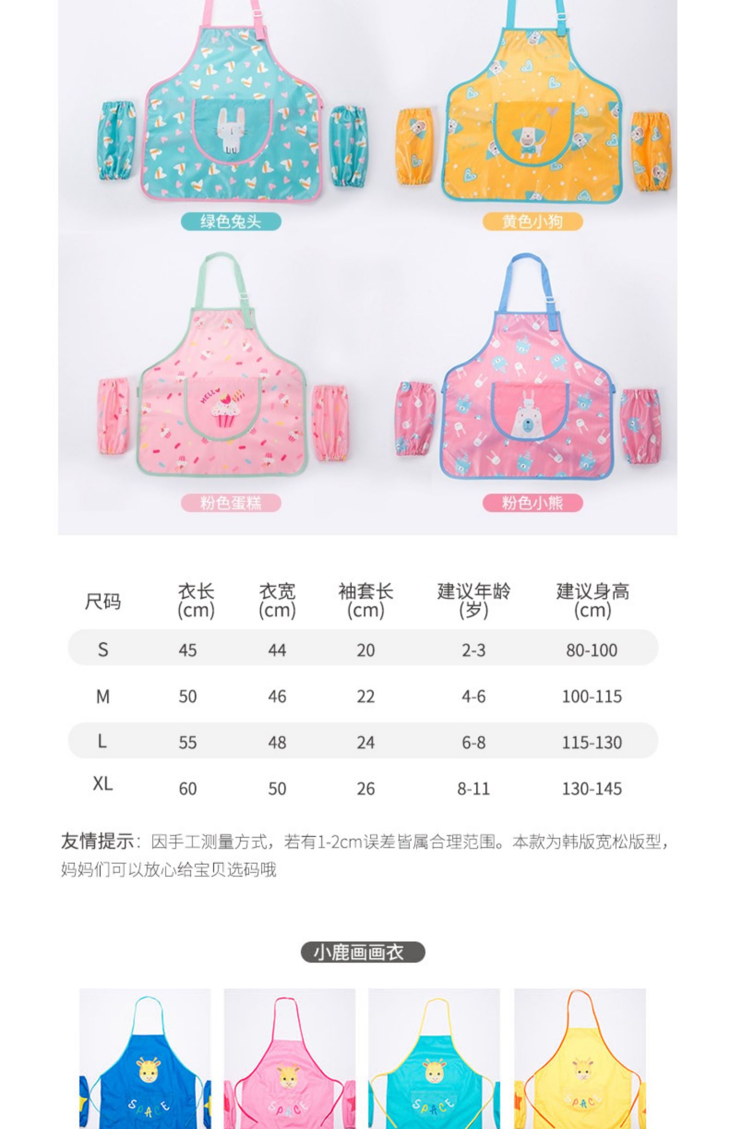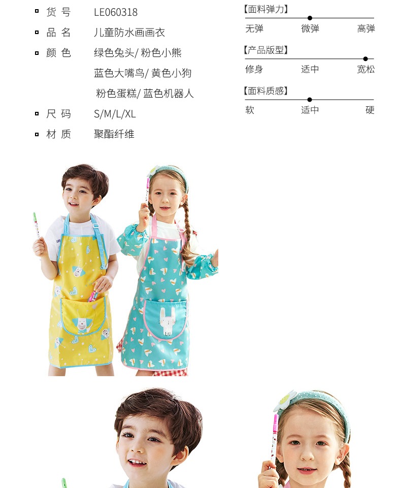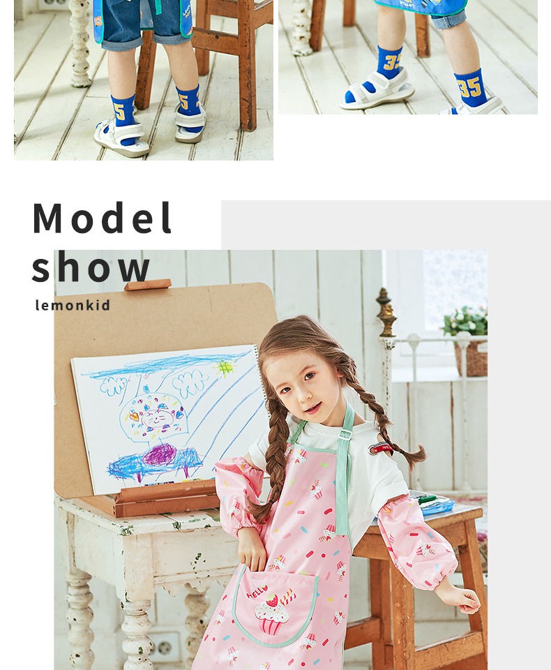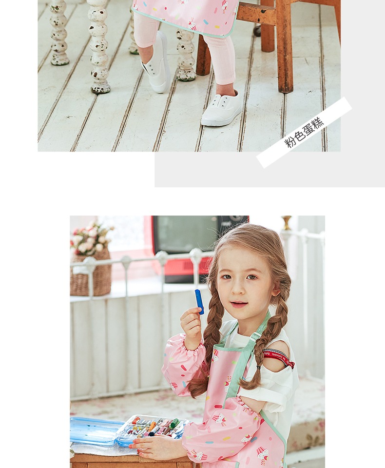 一款实用的潮童画画衣,全新防水面料材质升级,防水效果更佳,无异味,卡通时尚,不褪色,前片大口袋设计,可调节挂带,配备袖套,妈妈好帮手。