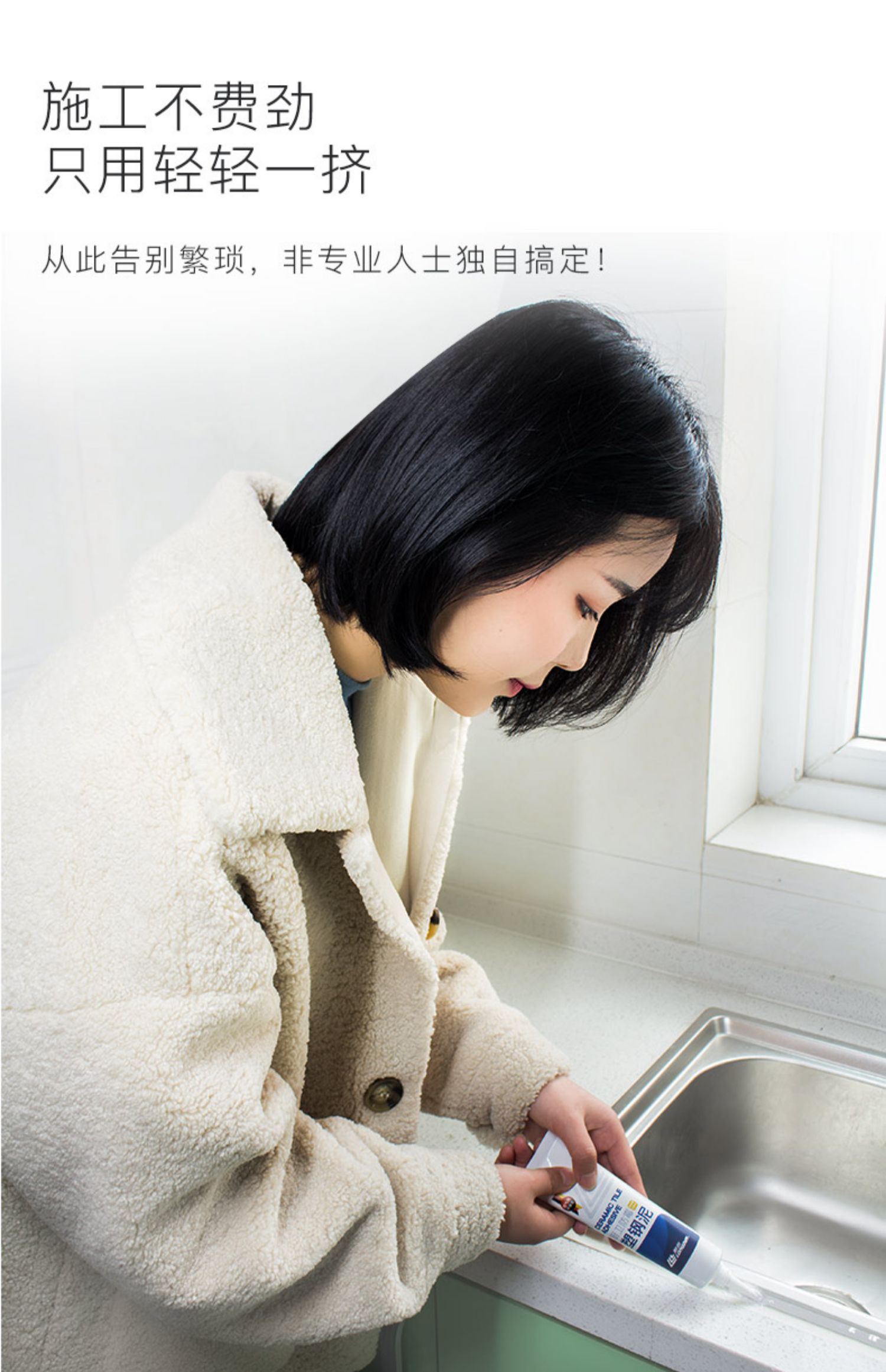 厨卫防霉,防水,光亮如瓷,施工不费劲,只用轻轻一挤,无惧油污,无惧严寒酷热。