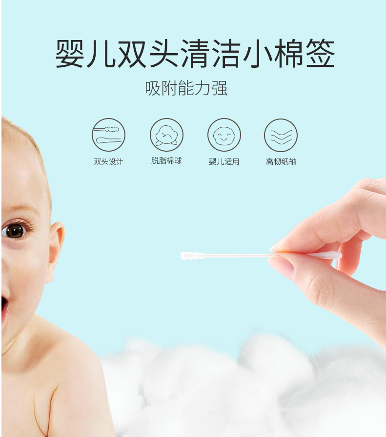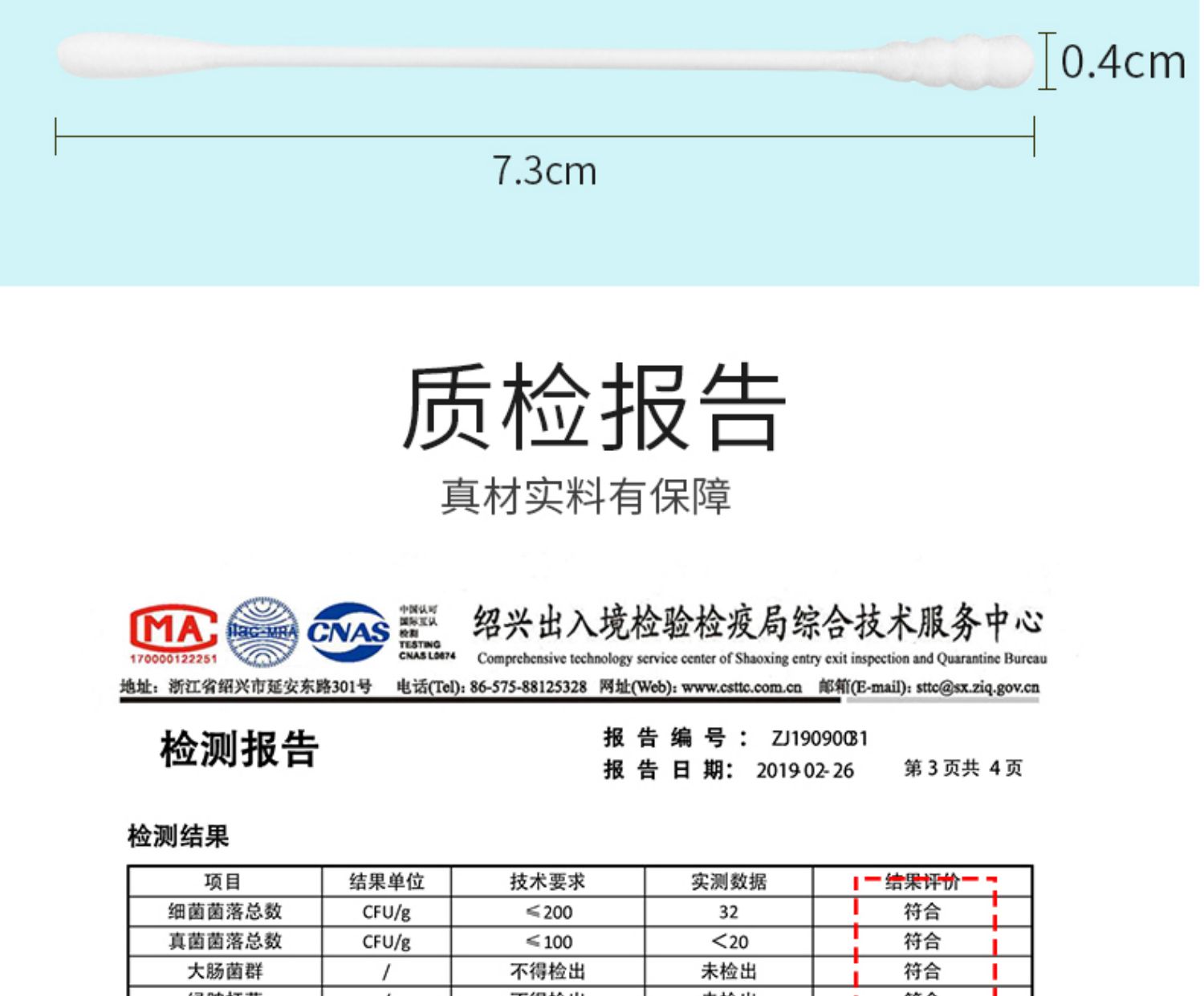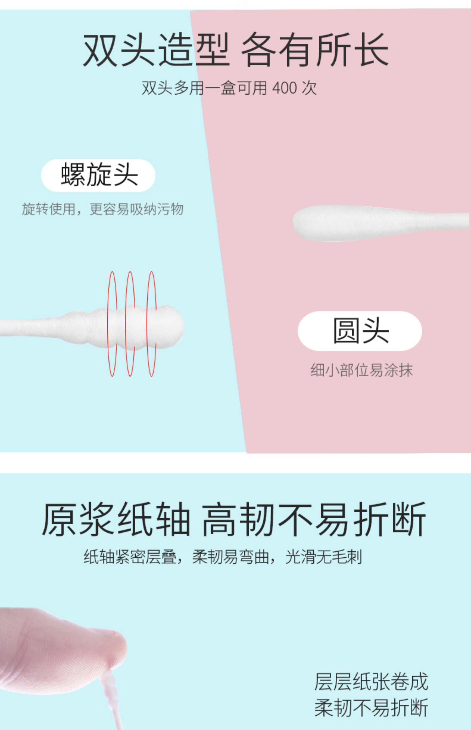 精选优质天然棉品,色泽洁白手感柔软,双头造型一头螺旋,旋转使用更易吸纳污物,一头细圆细小部位易涂抹,原浆纸轴高韧不断,小宝宝清理粑粑,大宝宝美妆修容,双头200支能用400次