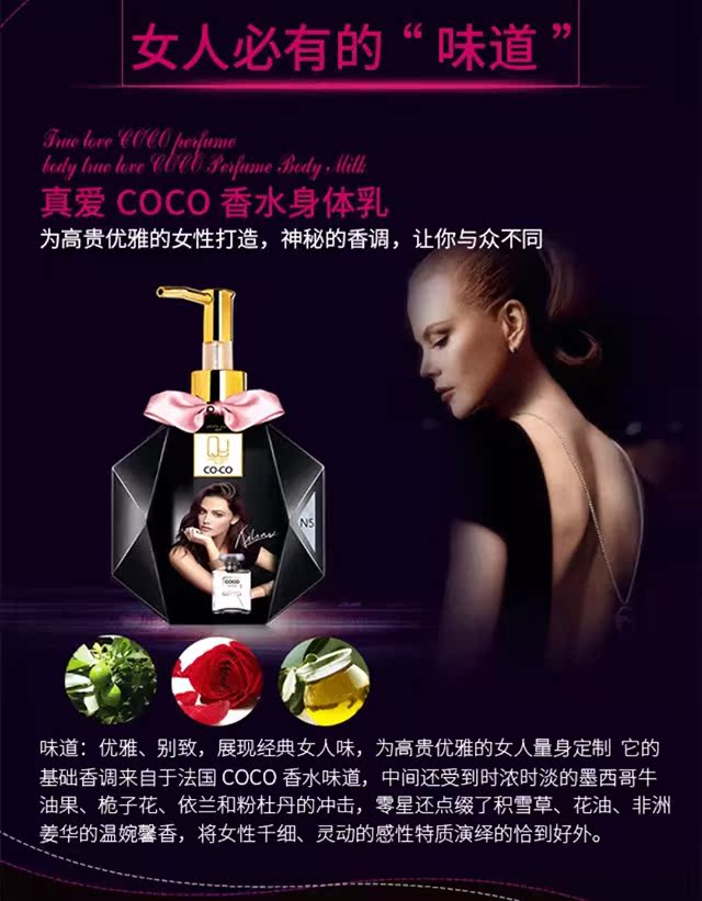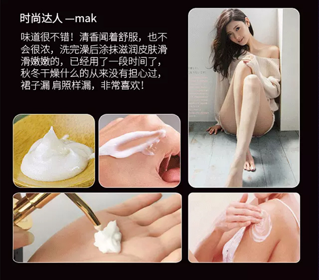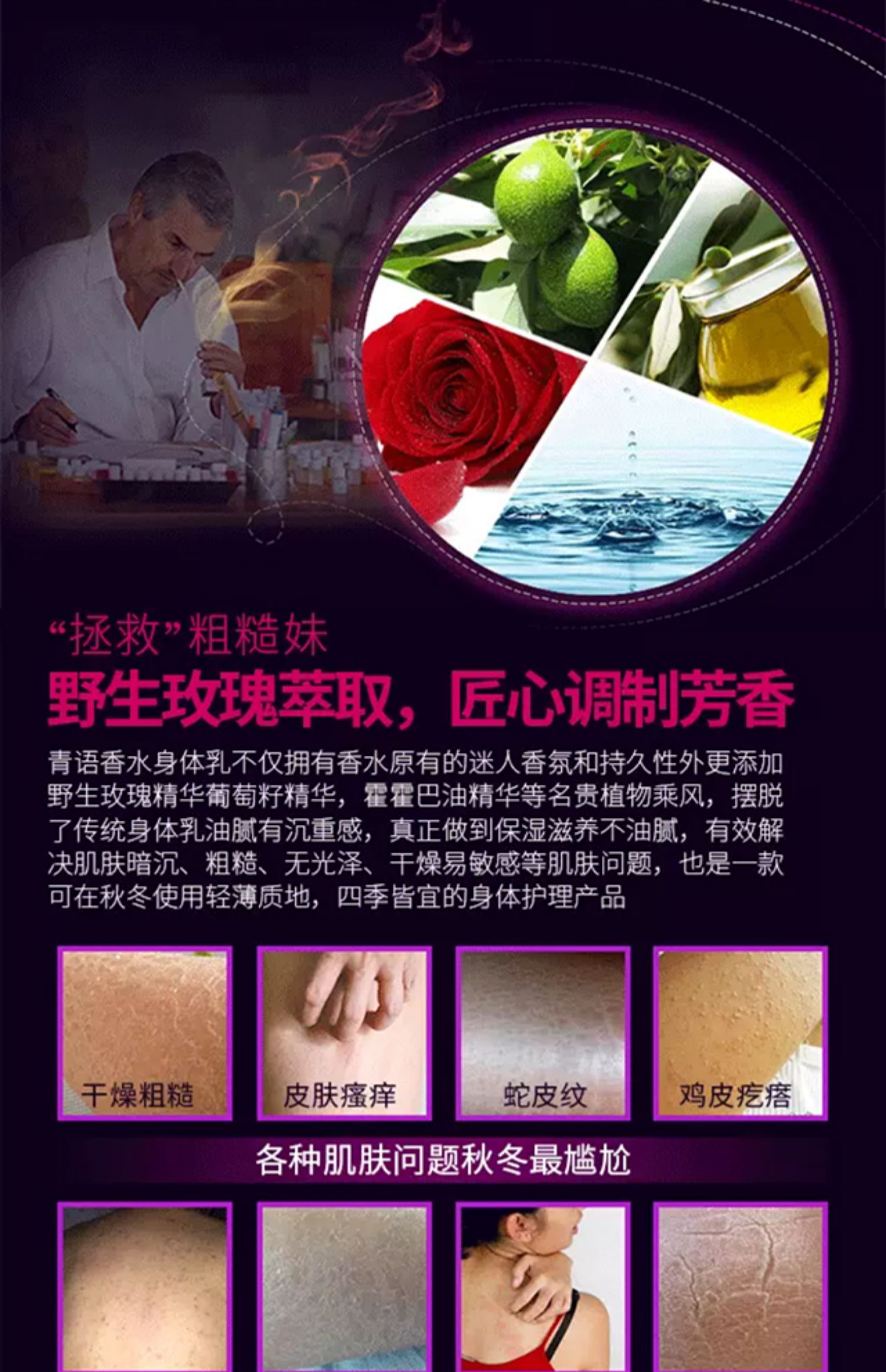300ml润肤乳,魅惑香型,提升肌肤柔滑度,减少肌肤色素沉着,长效保湿润泽肌肤,持久留香,让你与众不同。