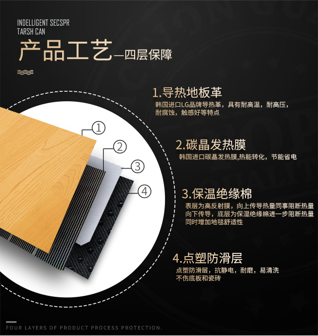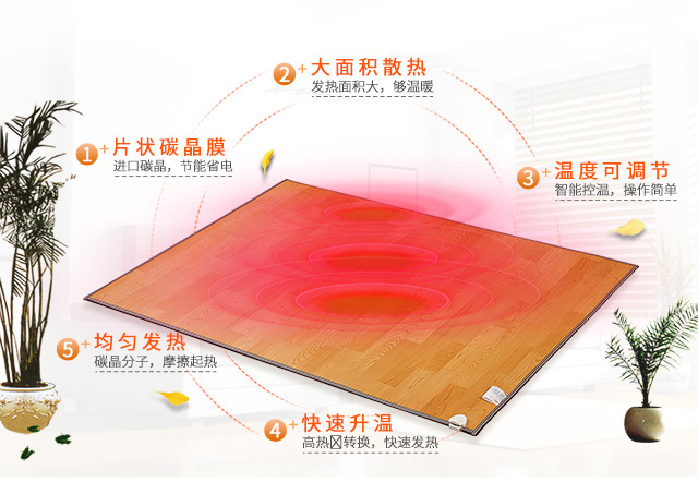 采用进口碳晶制热,4层保障,导热地板革,耐高温耐高压,耐腐蚀触感好,多种控制操作,升温快不干燥,保温绝缘棉,点塑防滑层,耐磨易清洗,优雅圆润直角包边,冬日居家取暖必备!~