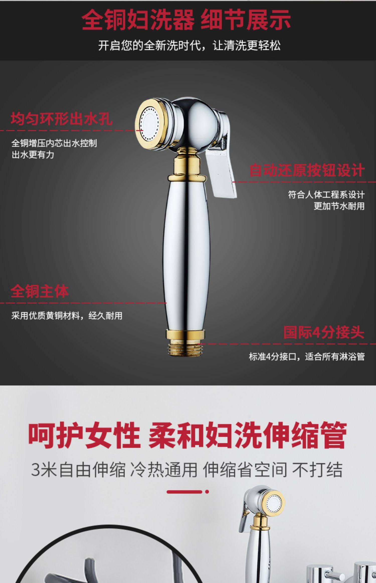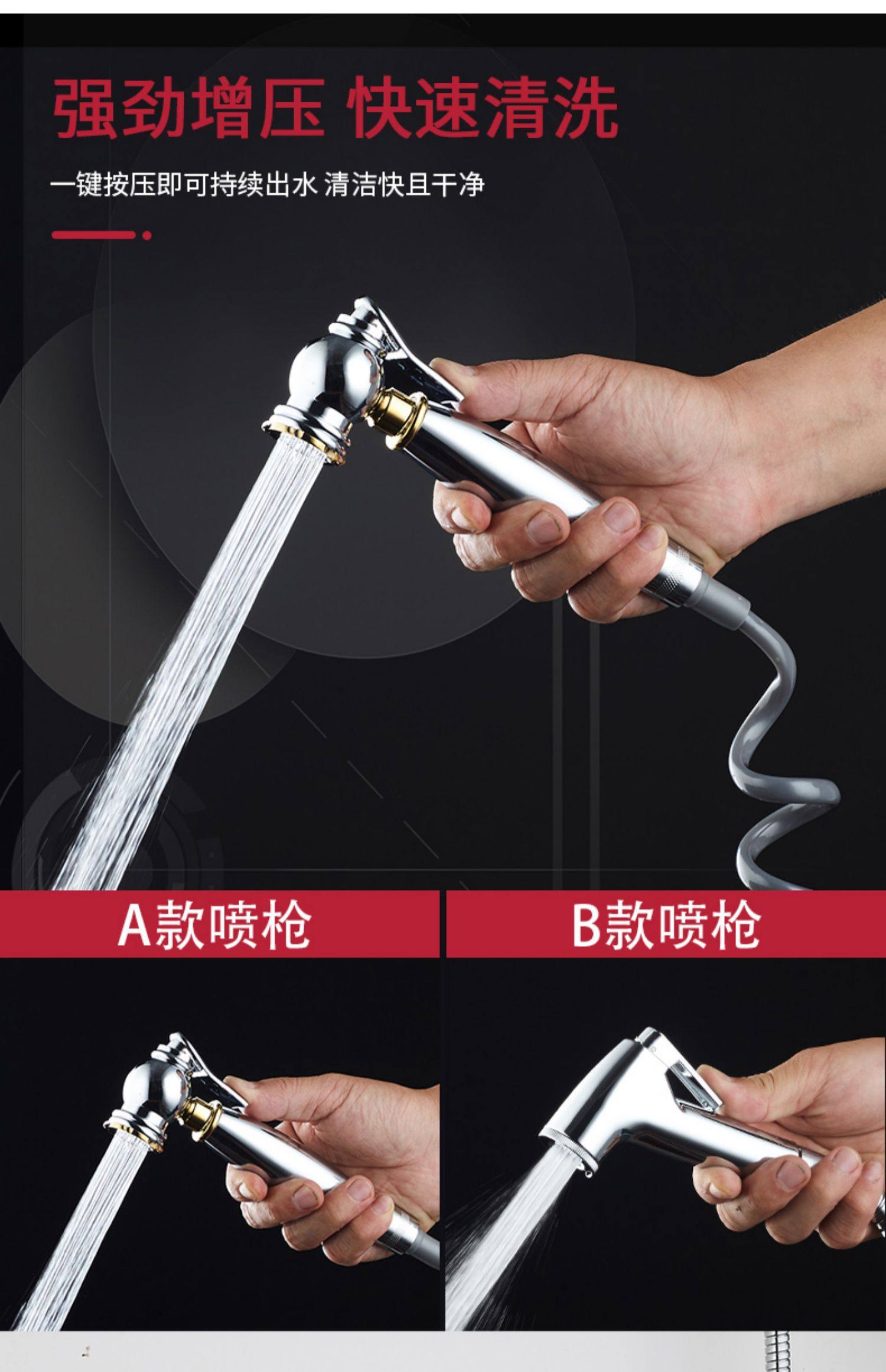 精铜打造,强劲增压设计,便携通用安装,一键出水,多种出水效果,舒服妇洗,解放双手,快速清洗,空气增压,弹簧软管,省力方便,妇洗、家务清洁更省力!