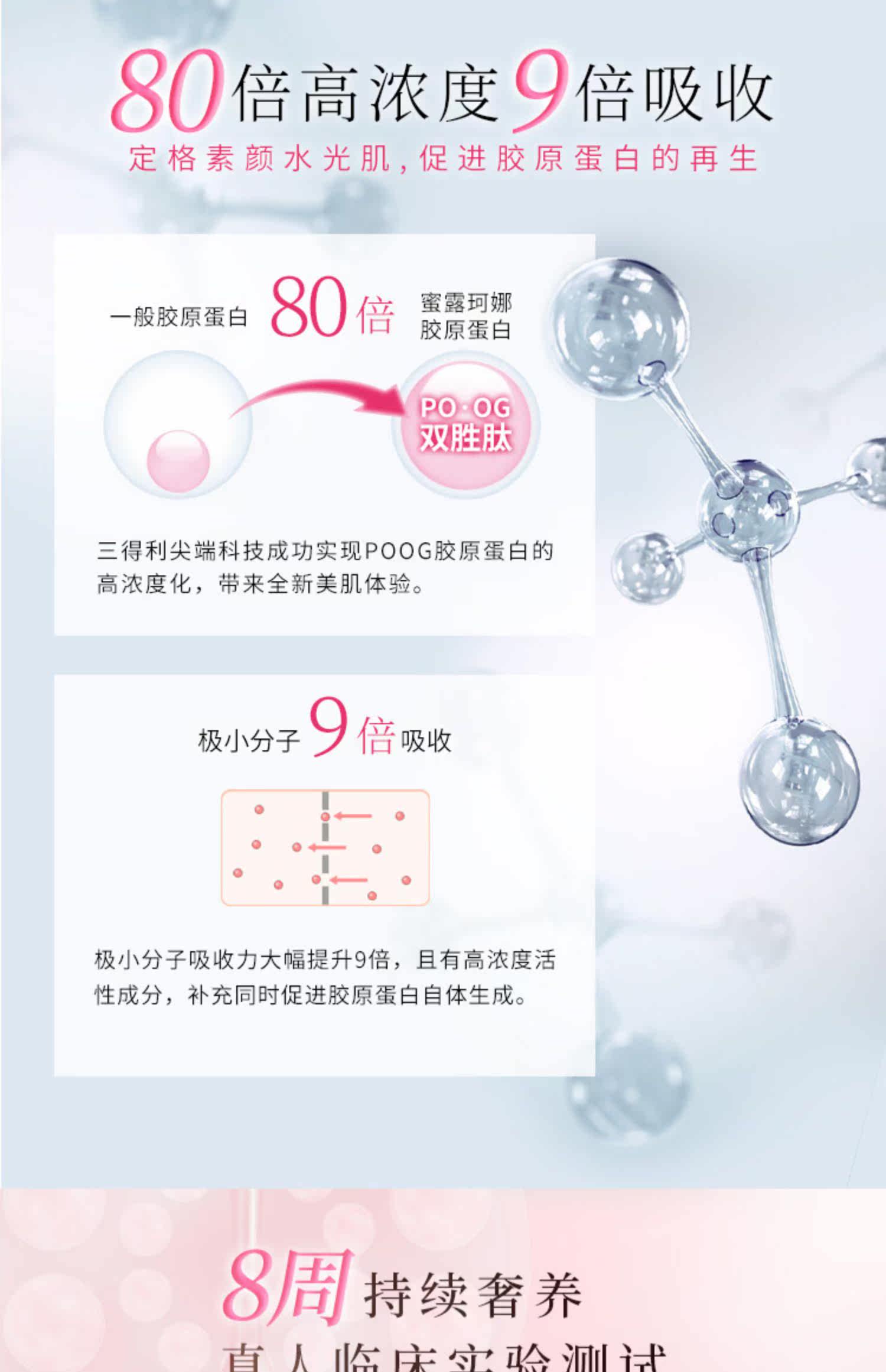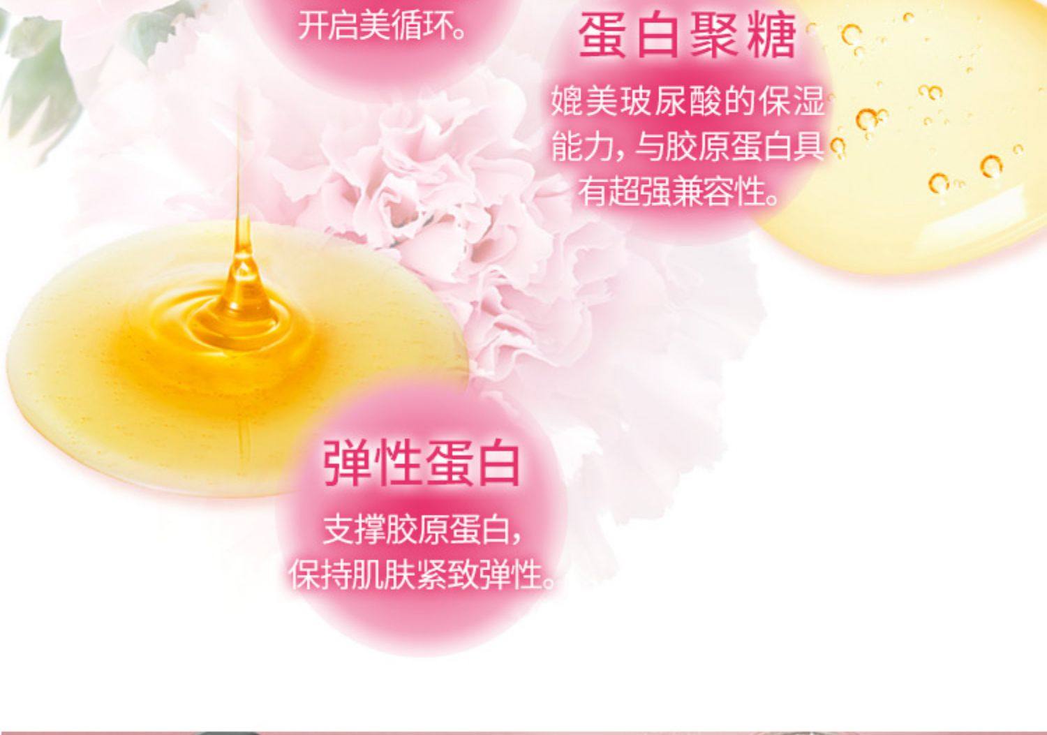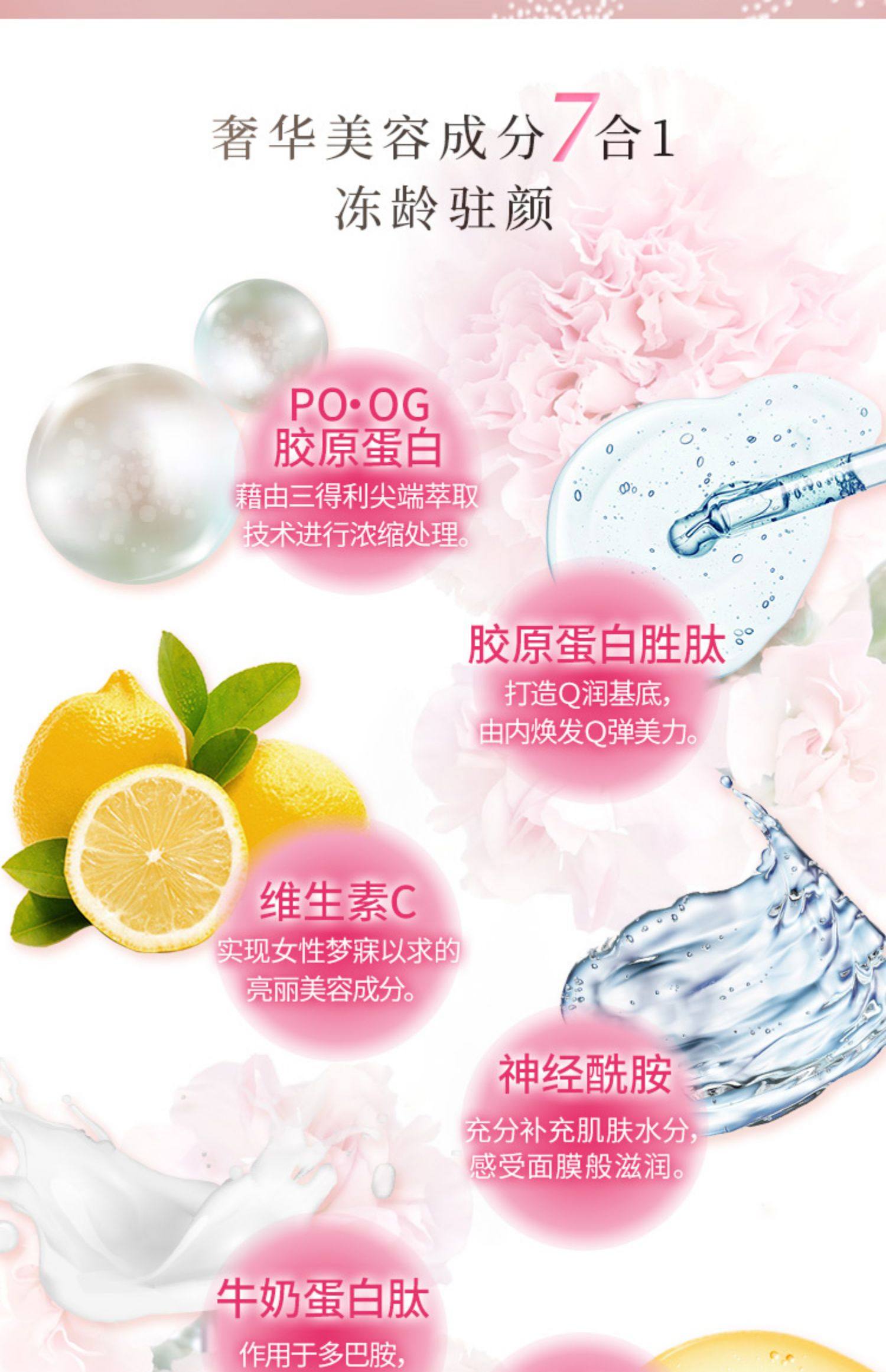 7种活颜成分,亮白肤色,提拉紧致,新生嫩滑,Q弹水润,光彩美白,水漾清透