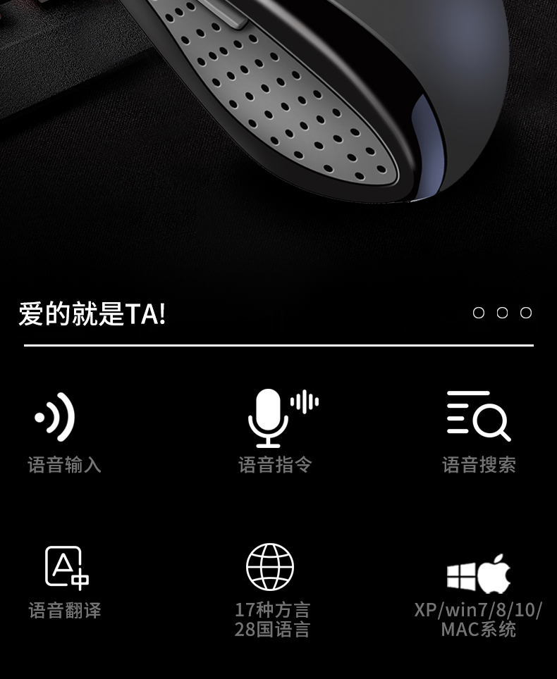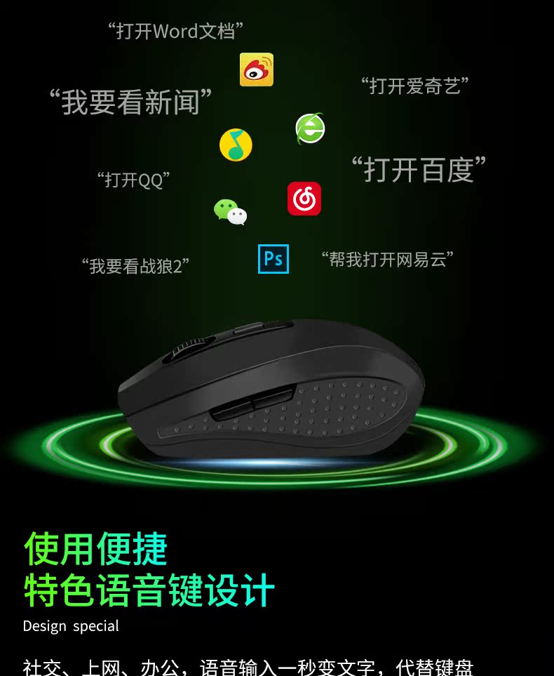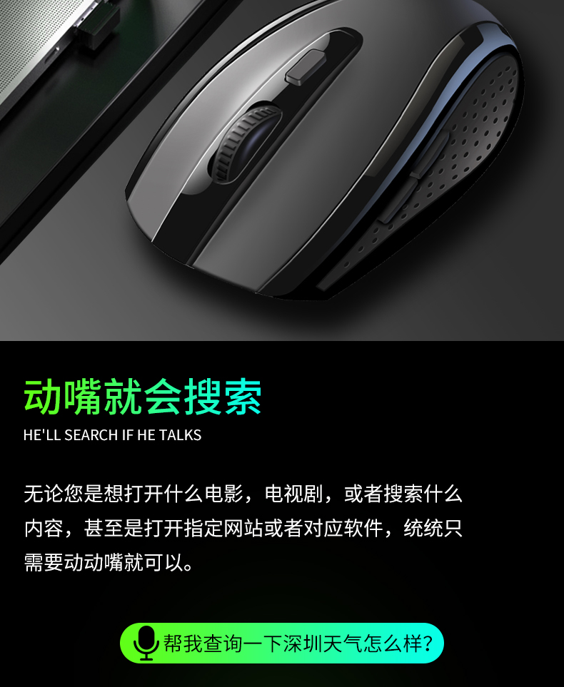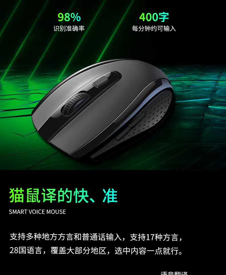超强国货来袭!智能语音鼠标,办公游戏利器!双声控输入,语音打字,比传统打字节约了太多时间!支持各地方言和26国语言,超强大的智能语音识别,超出色的手感体验,还不快pick它!
