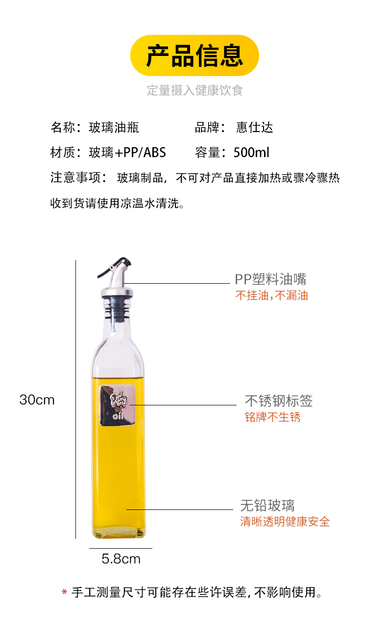 大容量500ml,高标准生产,精致透亮,现代简约设计,无铅也能做到薄轻透,单手按压式开合,不滴不挂更方便,标签辨别设计,液体收纳更有序【赠送运费】