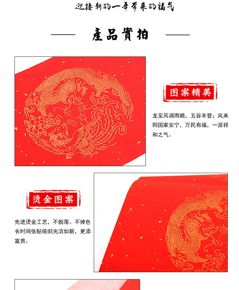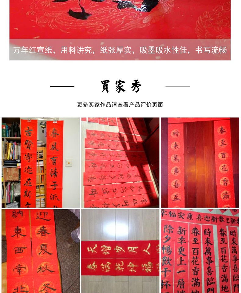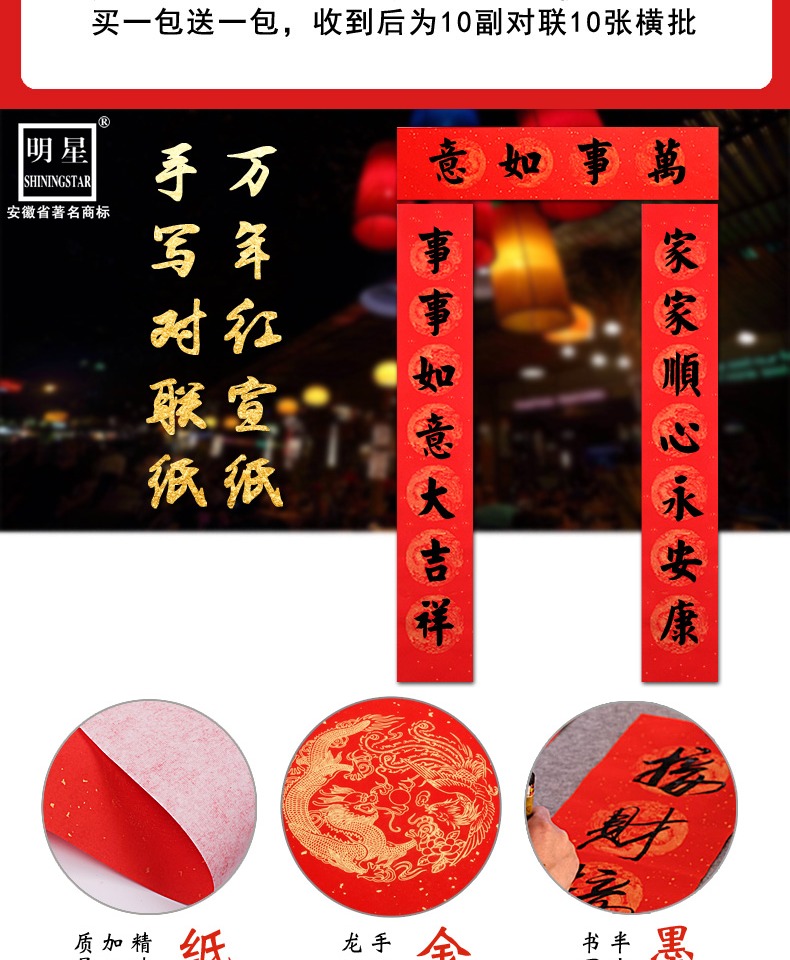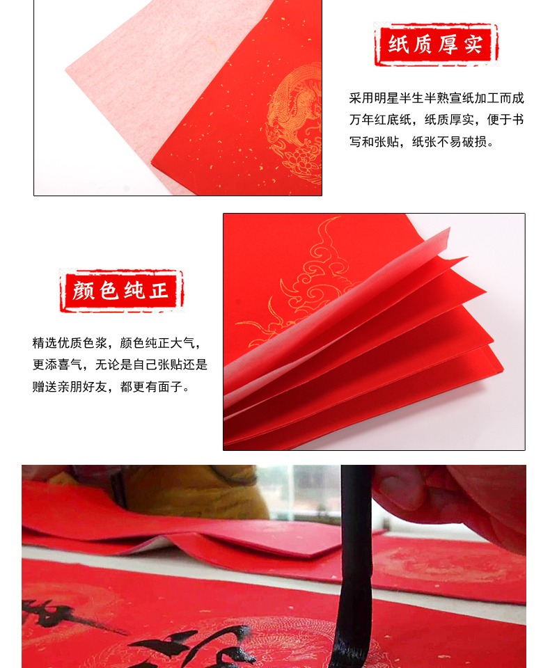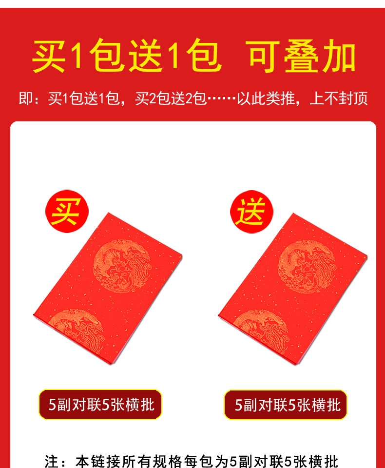 买一送一,多买多送,多规格可选,手写对联纸,万年红宣纸,纸张加厚,书写流畅,烫金图案,用料讲究,用心书写给春节增添心意。