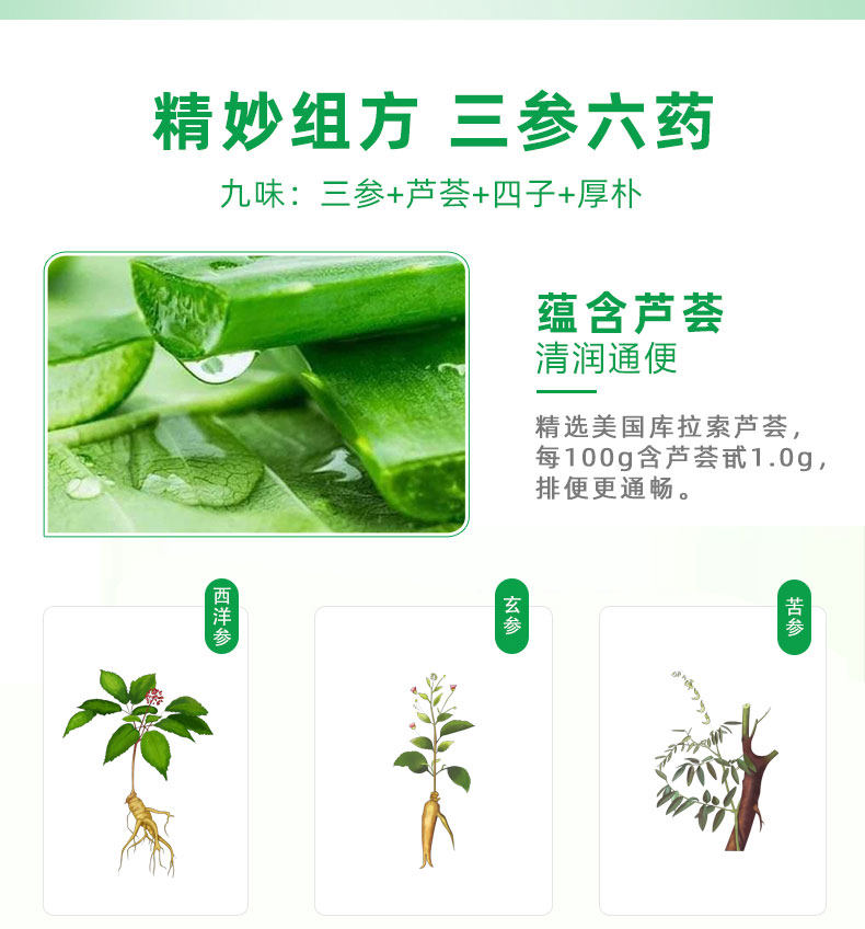 有效润肠通便,改善便秘、排出宿便、调整胃肠功能紊乱,芦荟+三参+四子+厚朴,中草药提取,九味大组方,还你健康好气色!