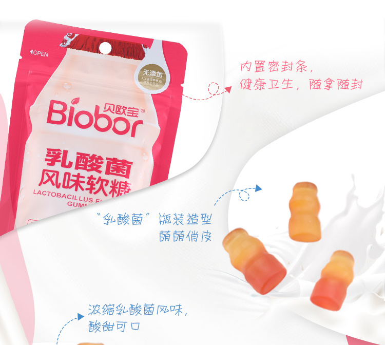 【第二件7.9!拍两件更划算!】大牌贝欧宝乳酸菌风味软糖!嚼着吃的乳酸菌,Q弹Q弹的超级好吃,乳酸菌味儿很浓,健康无添加,Q瓶造型,小巧可爱,轻松入袋!赶快抢购吧,晚了就没有了哦~