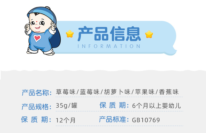 健康辅食,多种谷物。可爱造型,宝宝喜欢。无盐无糖,清淡低钠。不易上火,入口即化。多种口味,挑你喜欢。非油炸工艺,宝妈更放心。70年品牌保证,给宝贝好的呵护。【赠运费险】
