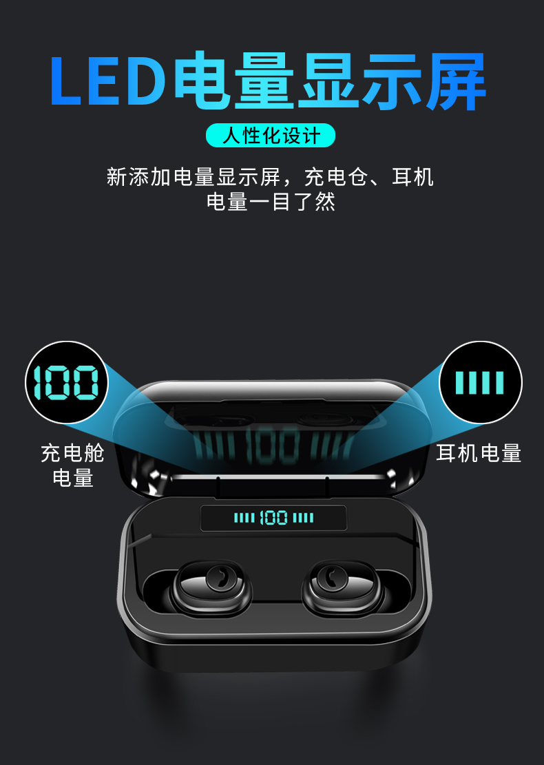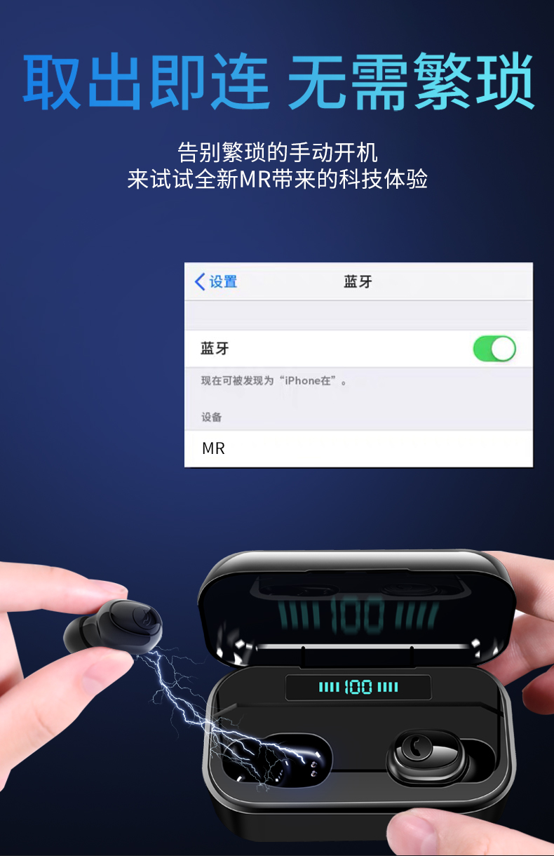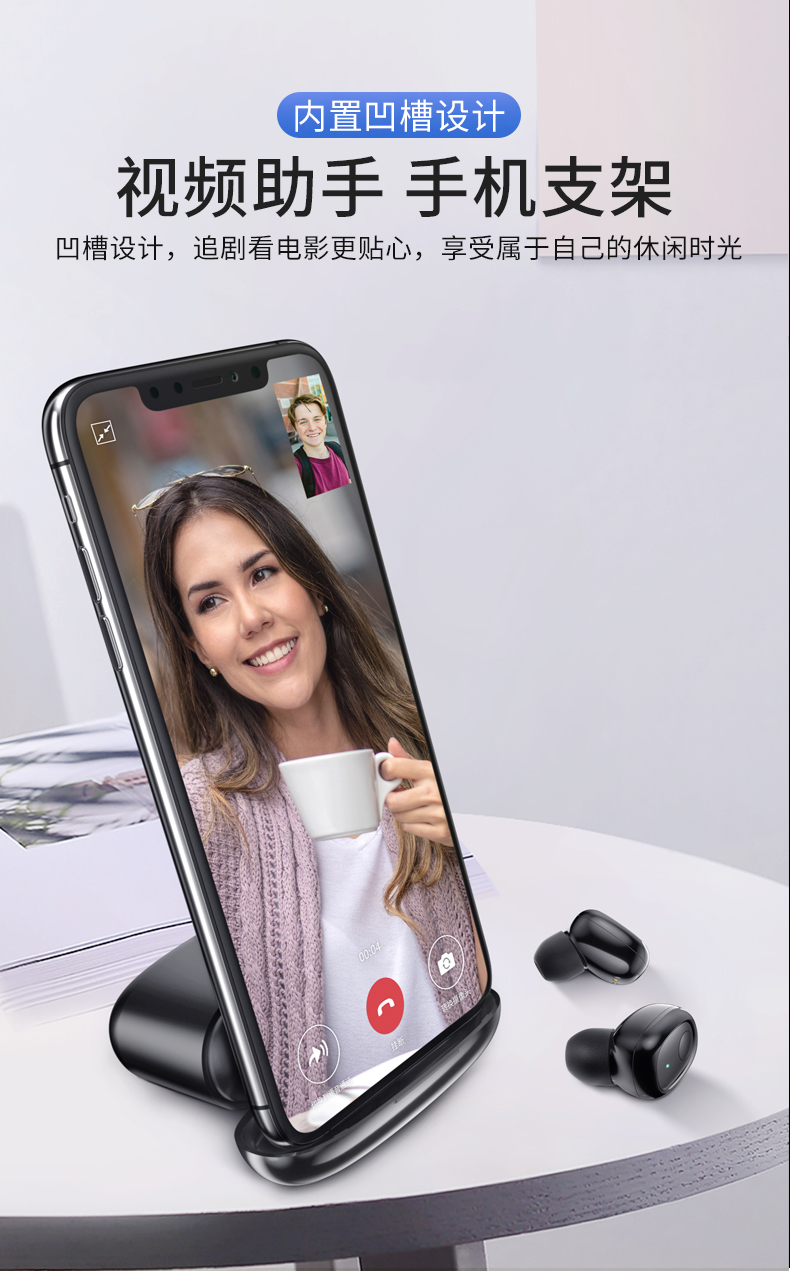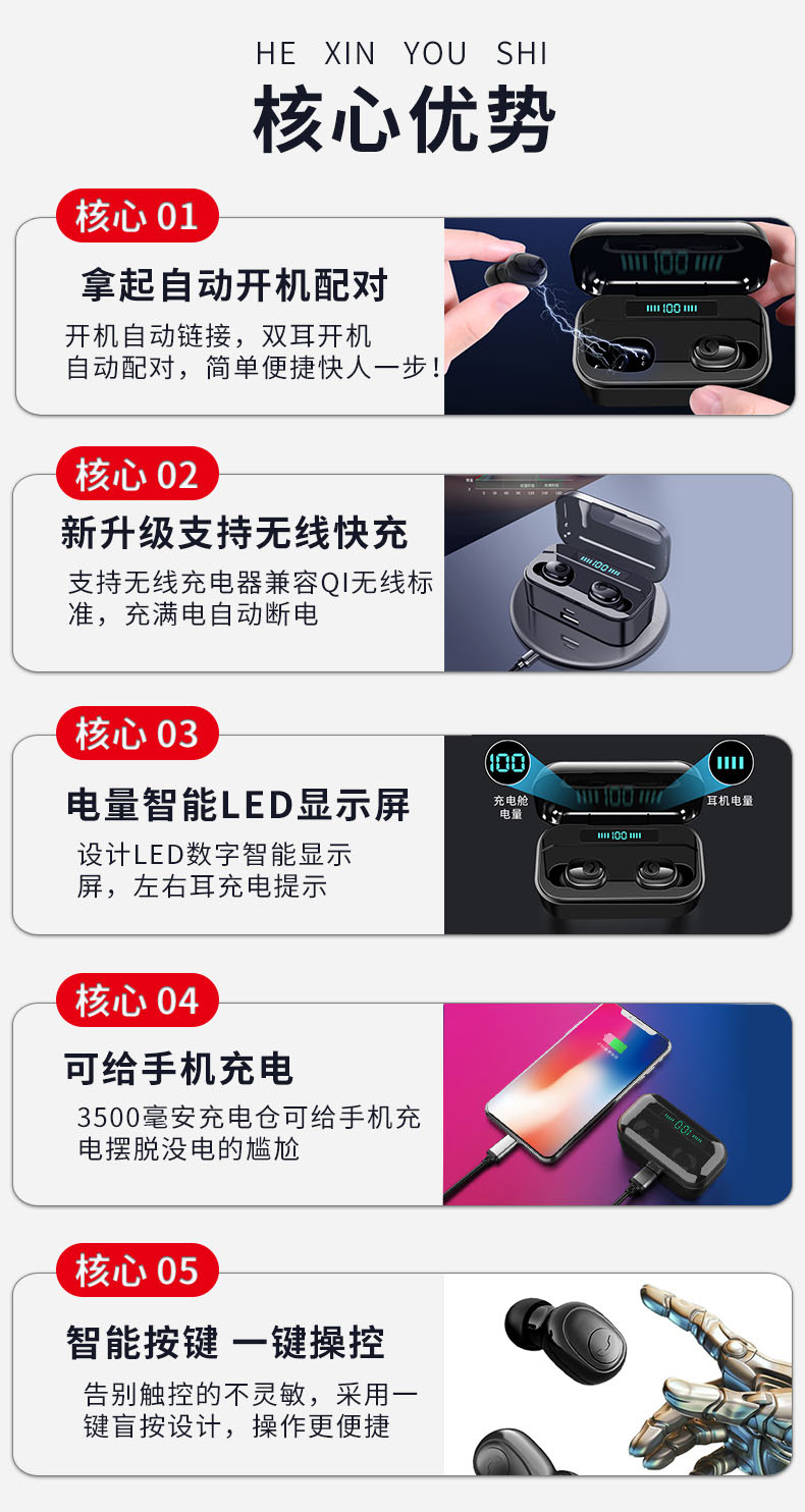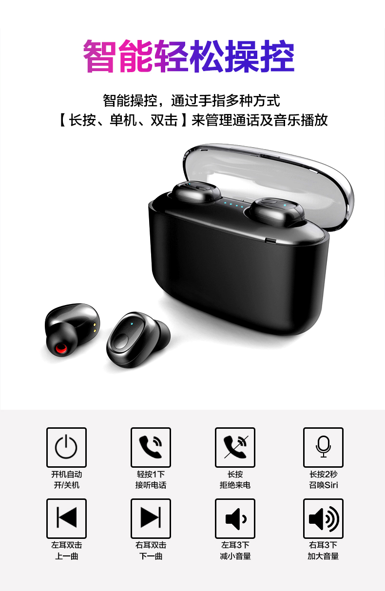 蓝牙耳机5.0,自动开机配对,一键切换上下曲,调节音量,唤醒Siri,8D立体环绕音效,多功能LED充电舱,既可为手机应急充电,还可当手机支架看电影