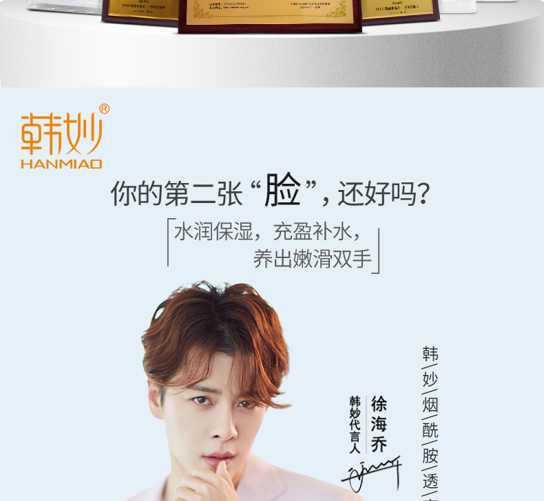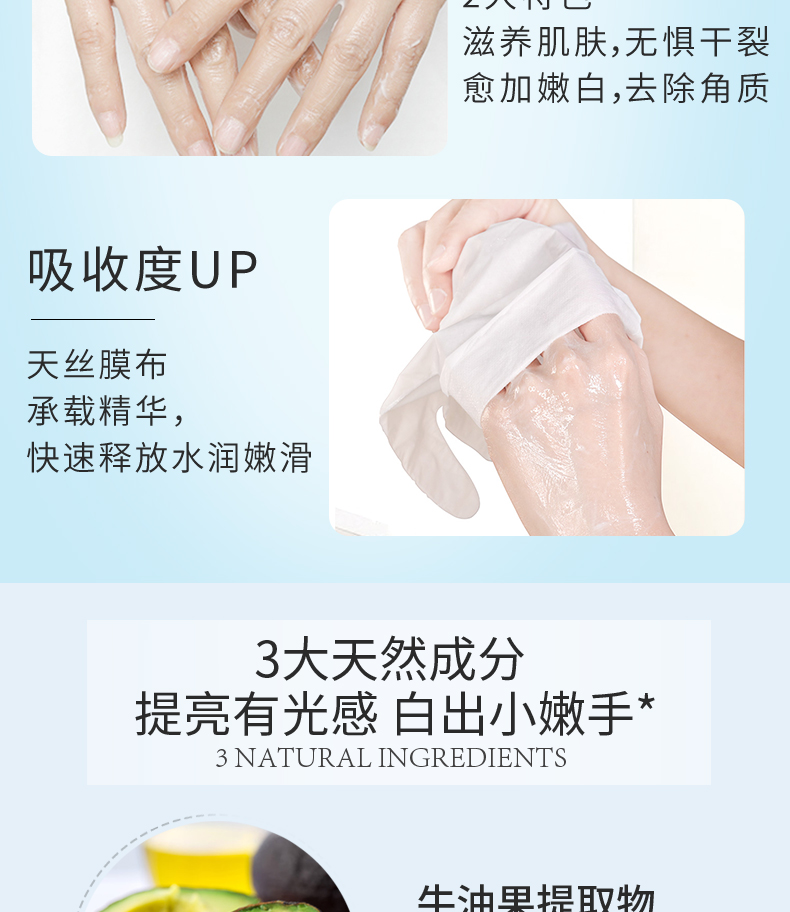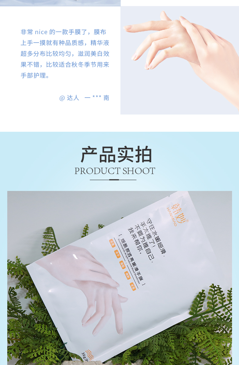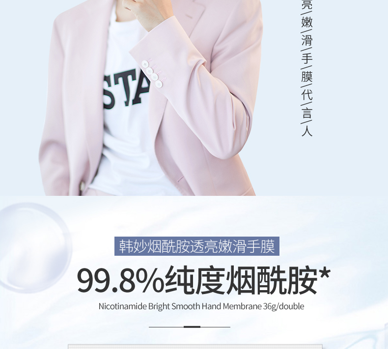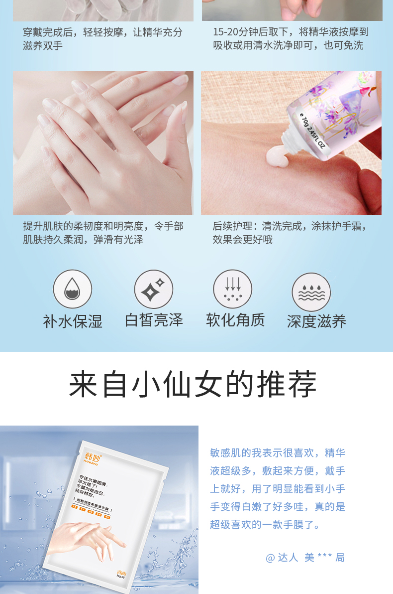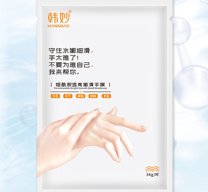 韩妙烟酰胺透亮嫩滑手膜,有效改善肤色不均现象,白皙保湿补水手部护理,淡化细纹,令双手透亮有光泽;用后手部更水润,更透亮柔嫩,为您细心呵护手部养护