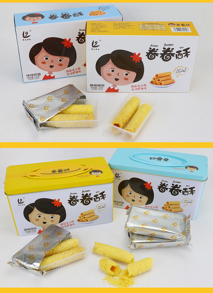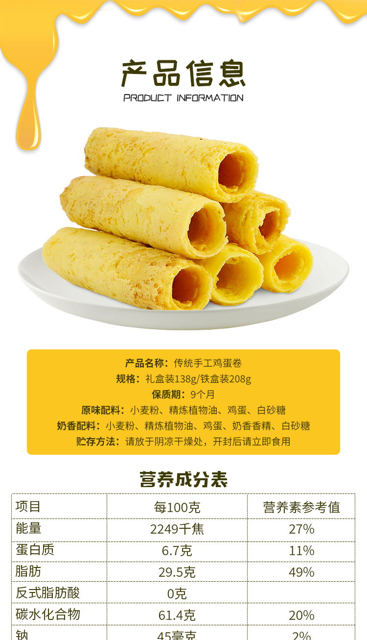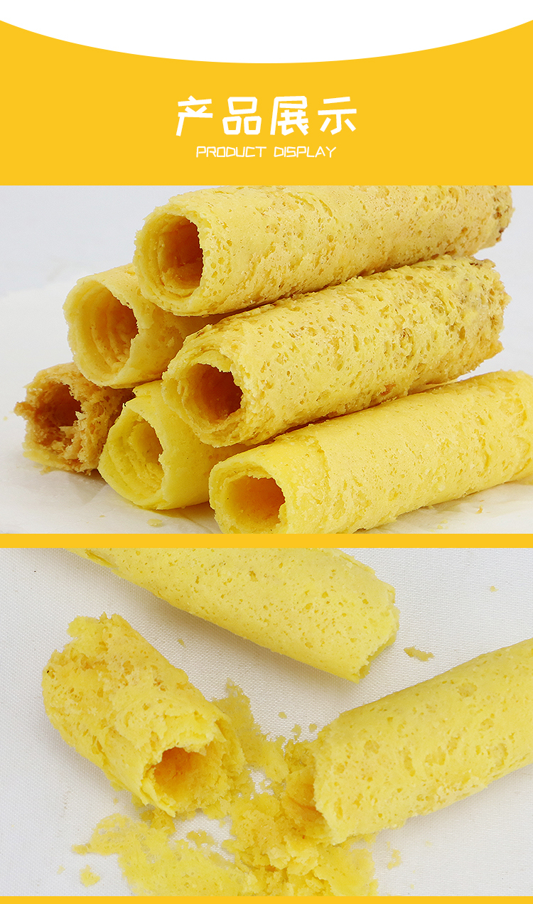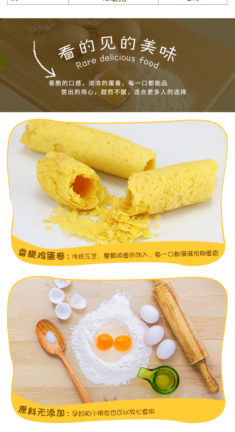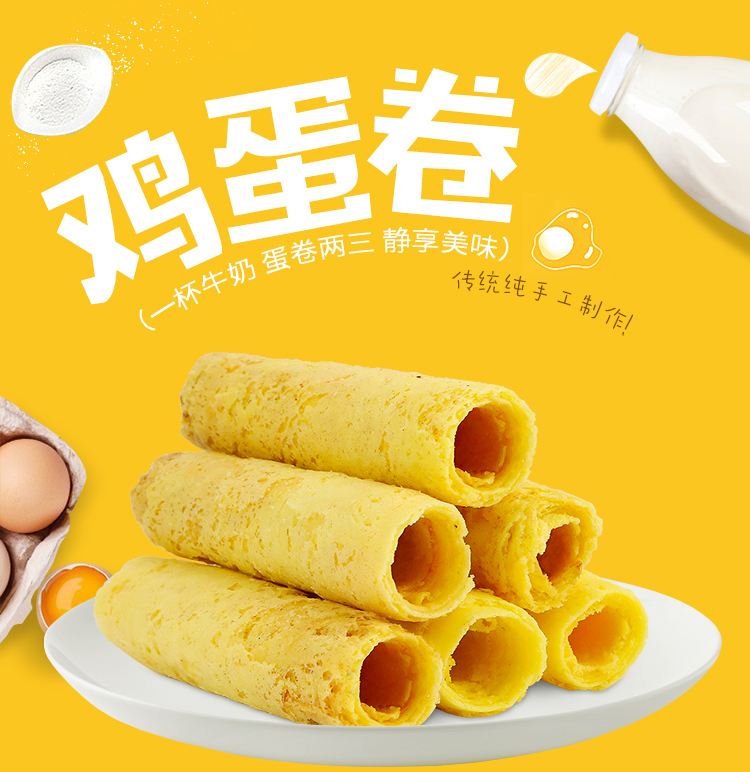 纯手工鸡蛋卷,传统工艺,原料无添加,天然健康,口感纯正,蛋香浓郁,做真正的鸡蛋卷,还原小时候的味道