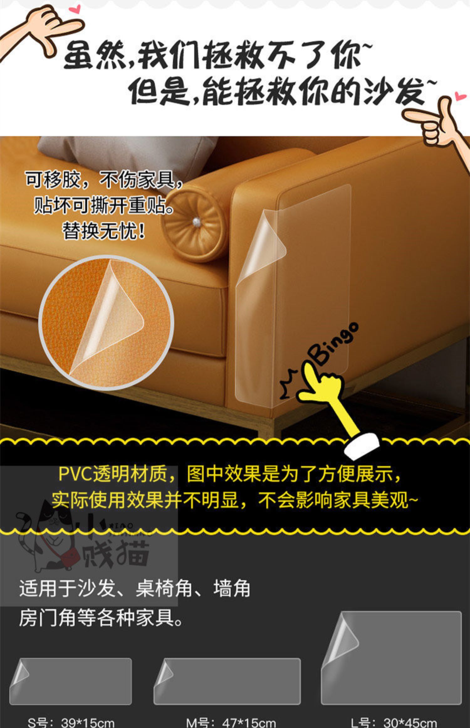 防猫抓沙发保护贴,可移胶,不伤家具,贴坏可撕开重贴,适用于沙发、桌椅角、墙角、房门等各种家具,贴上后再也不怕抓了。