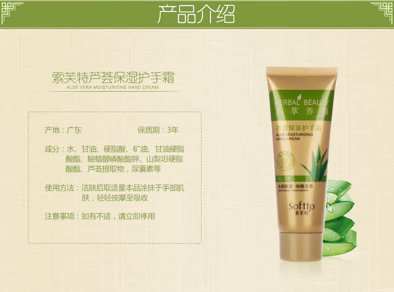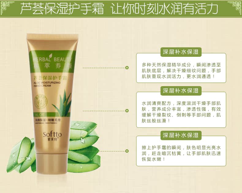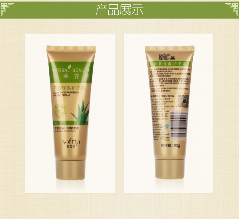 【索芙特】芦荟护手霜,补水滋润,保湿嫩肤,防冻防裂,水漾细滑手部肌肤;亦可给干燥部位,膝盖、手肘等部位以滋润呵护;滋润保湿配方,特含芦荟精华,改善皮肤干燥和粗糙等问题~