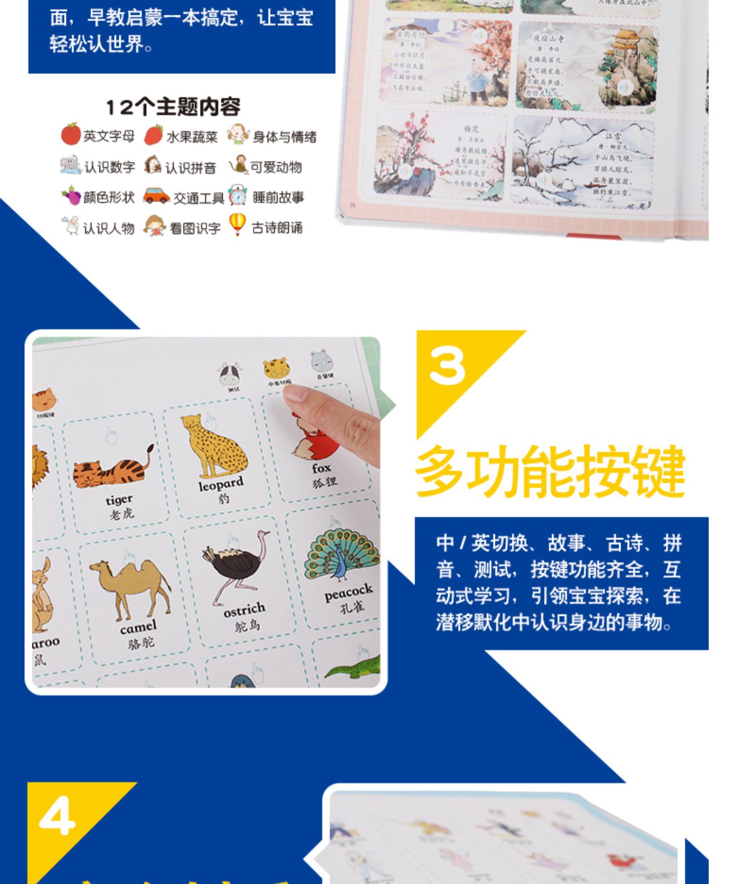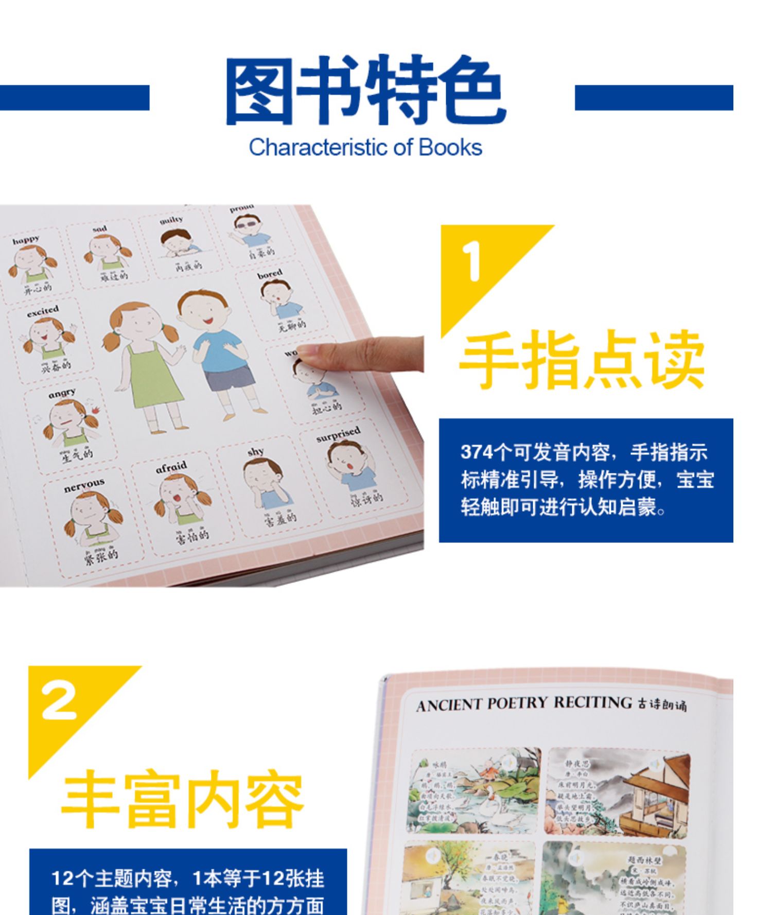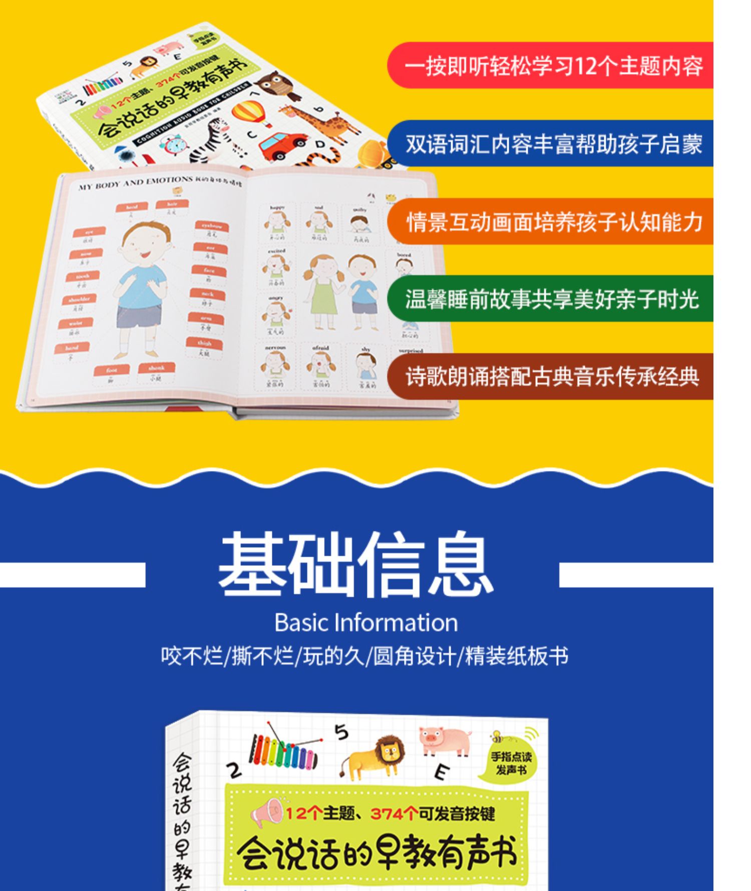 会说话的早教有声书,24个认知主题,374个发声点,一按即听轻松学习,双语词汇帮助孩子启蒙,情景互动画面培养孩子认知能力!