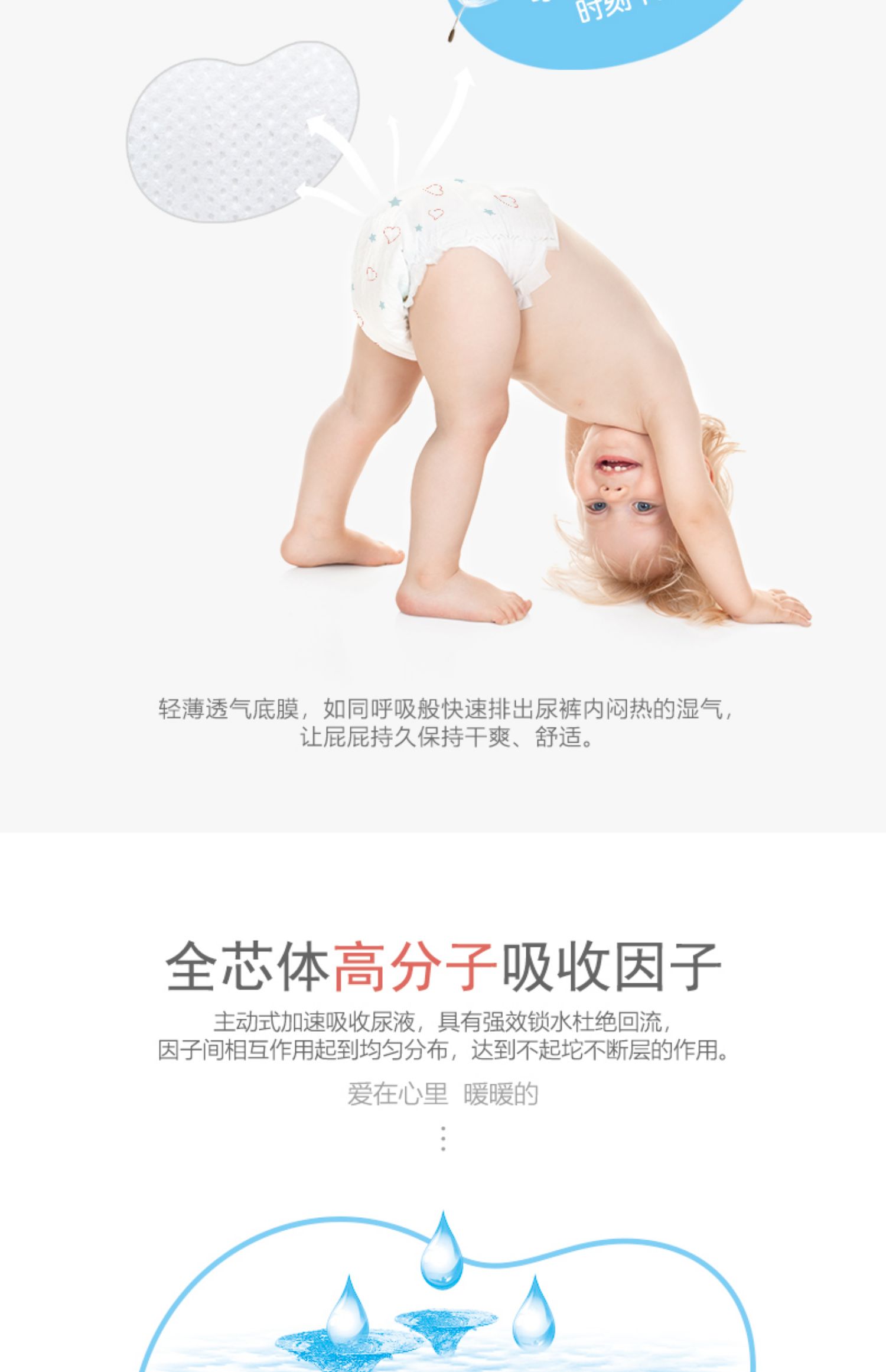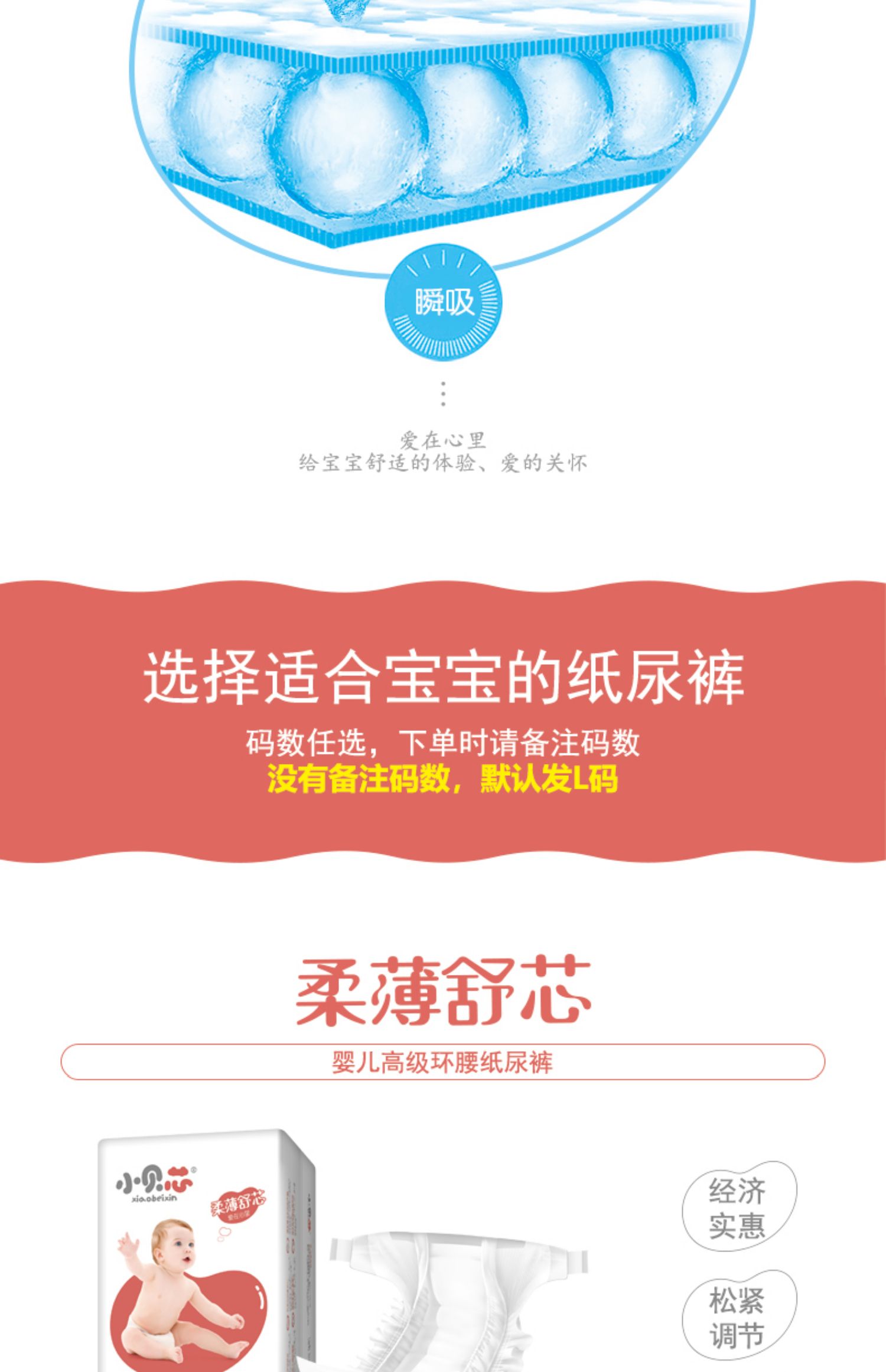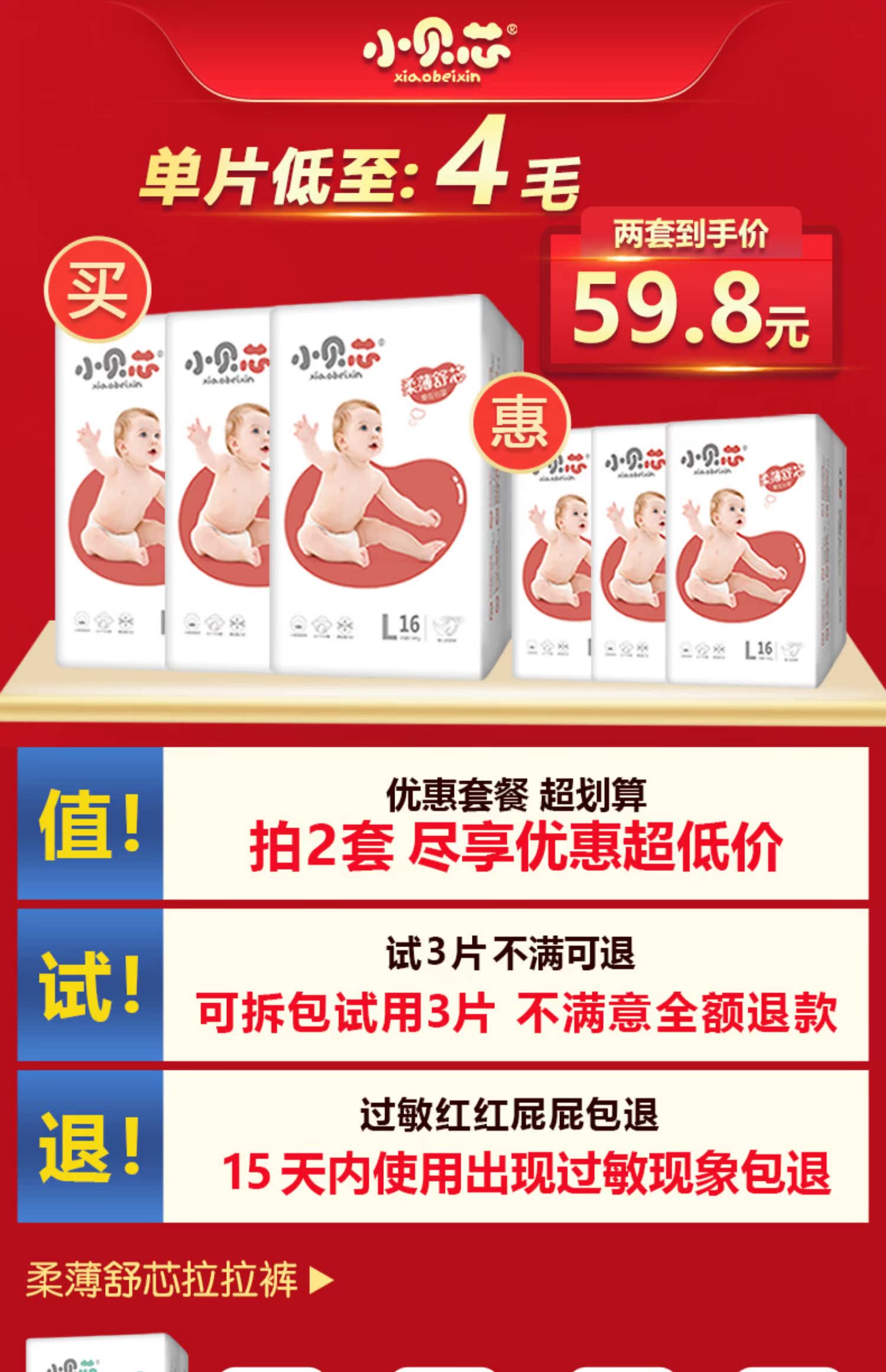 【小贝芯旗舰店】限时秒杀!66片装,码数可选,一片0.35元,全新工艺,超薄透气,不起坨,不断层,柔软舒适,瞬间超快吸收,不红pp。立体防漏侧边,干爽更舒适!纸尿裤和拉拉裤三码任选。