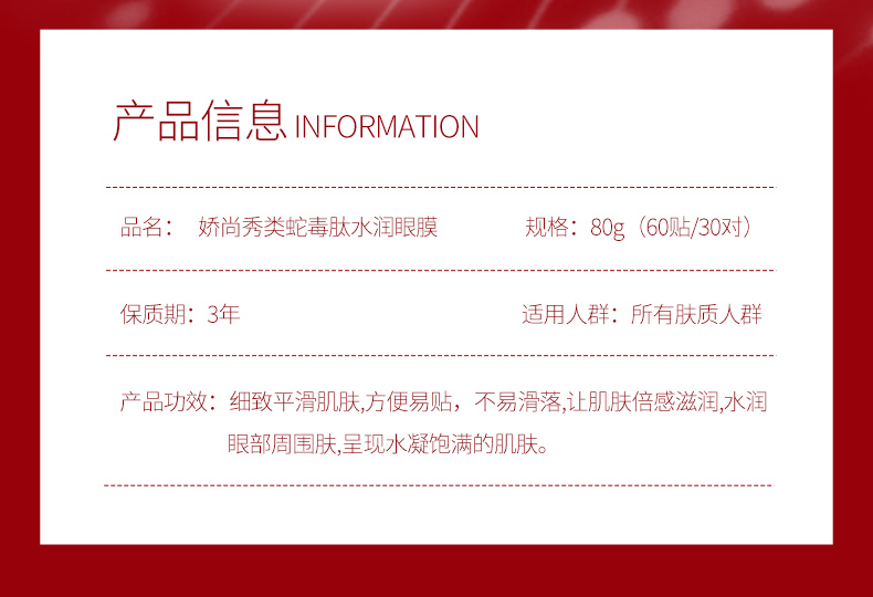 【拍两件更划算,第二件10元】经常加班,熬夜追剧,黑眼圈、小细纹都出来了,瞬间老了10岁,娇尚秀类蛇毒肽水润眼膜!修复眼周受损肌肤,嫩滑眼周肌肤,抗氧化,低敏温和营养,一贴多用~【过敏包退】