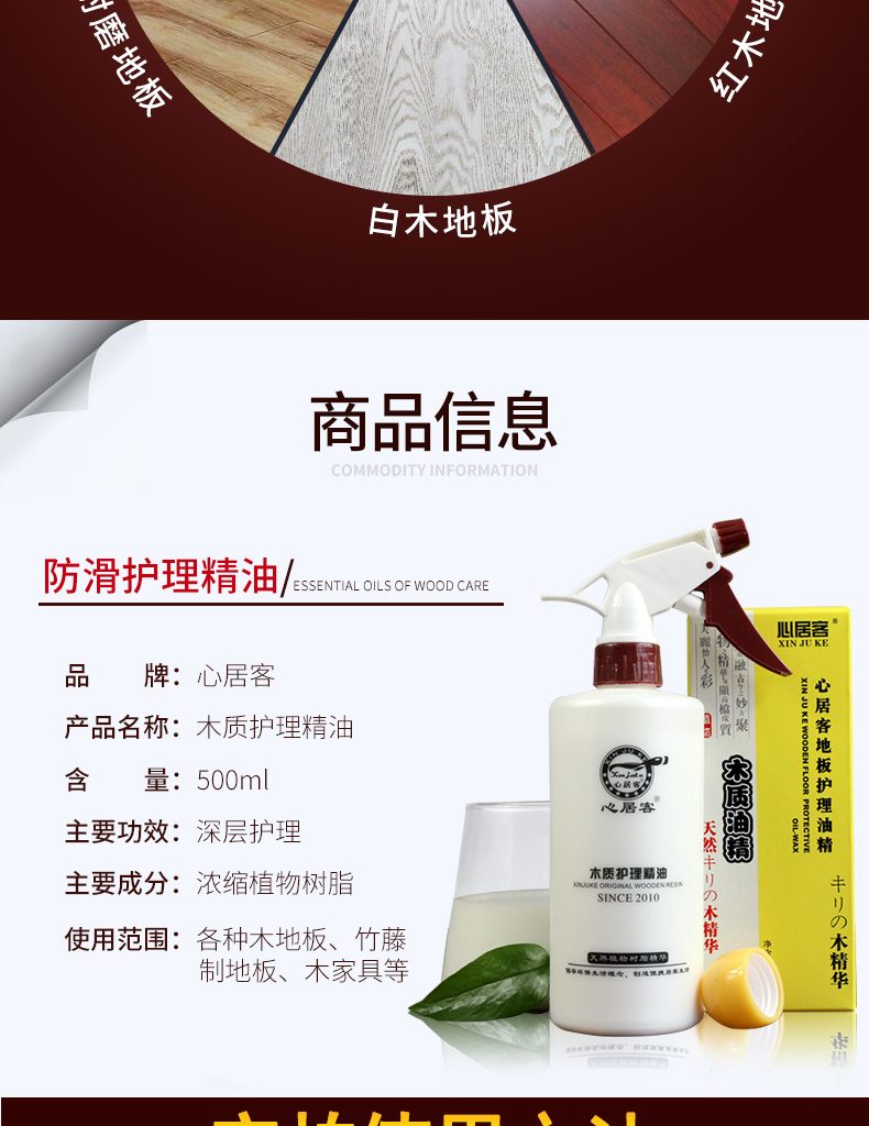 【心居客实木复合保养液体打蜡护理精油】采用纯天然树脂精华,无异味,快速易吸收,不油腻,不沾灰,安全健康,防潮防霉,防干裂,滋养光亮,气味芬芳,给你清新健康居家生活,去污活性分子,去污看得见。