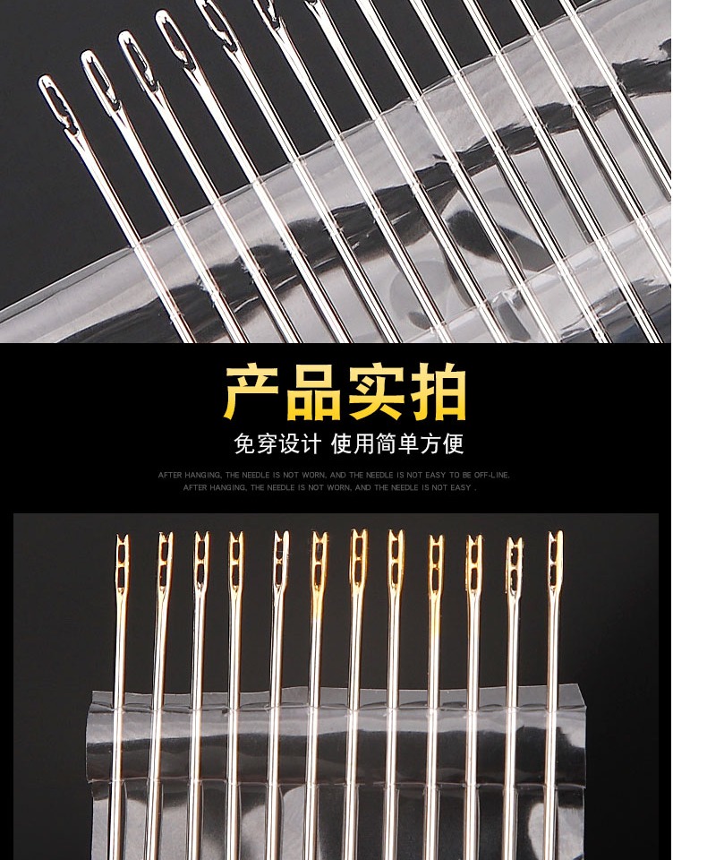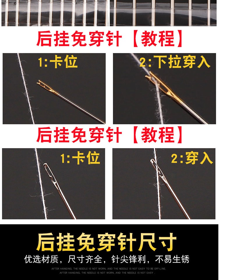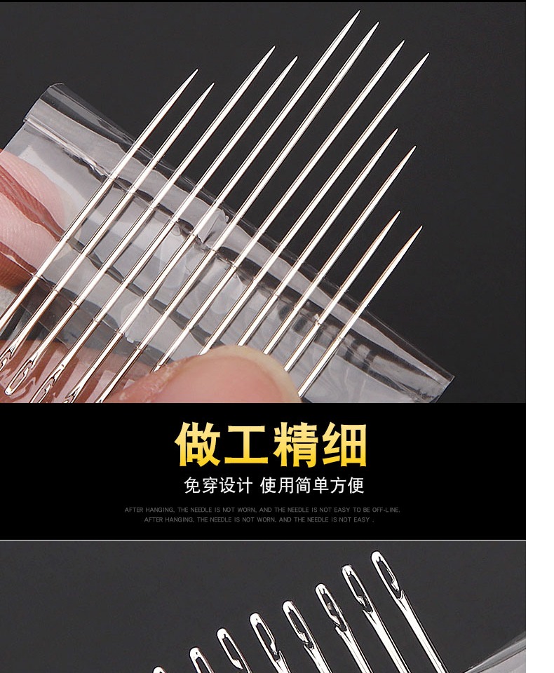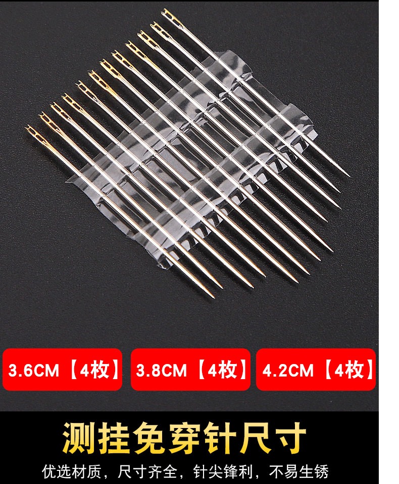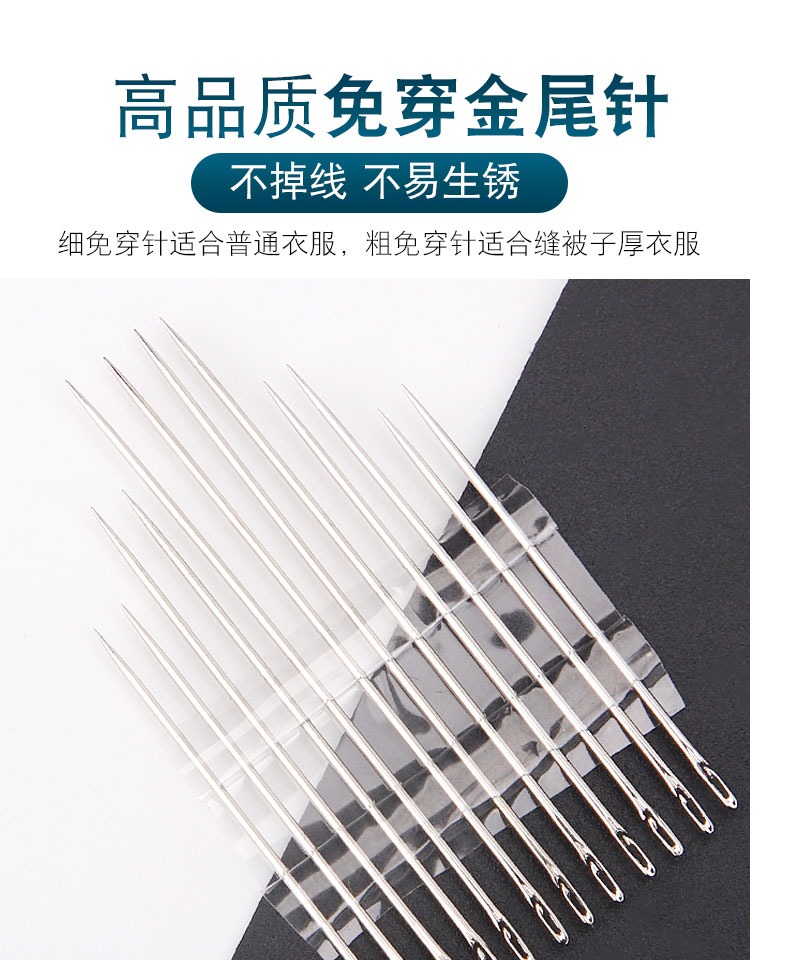 不用穿线的针,高品质免穿金尾针,不掉线,不易生锈,细针缝普通衣服,粗针缝被子和厚衣服,优选材质使用方便,老人和盲人都可用。