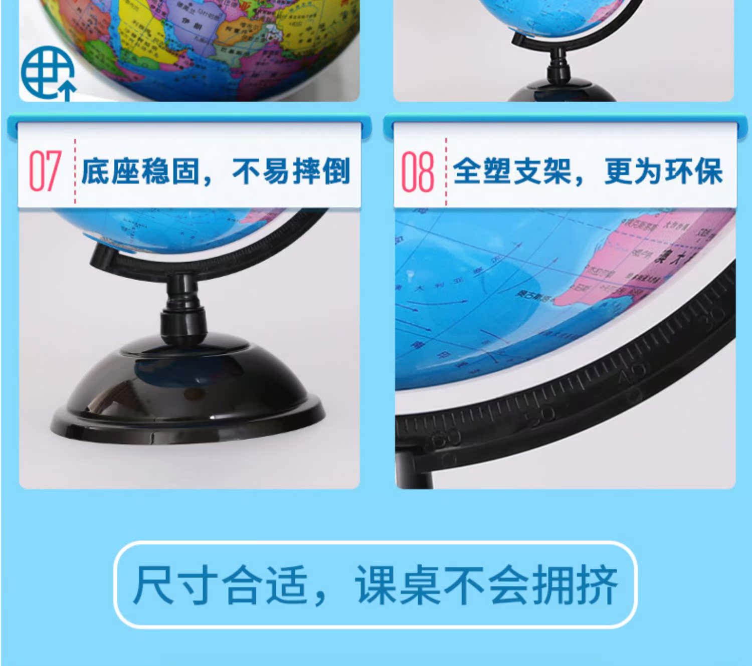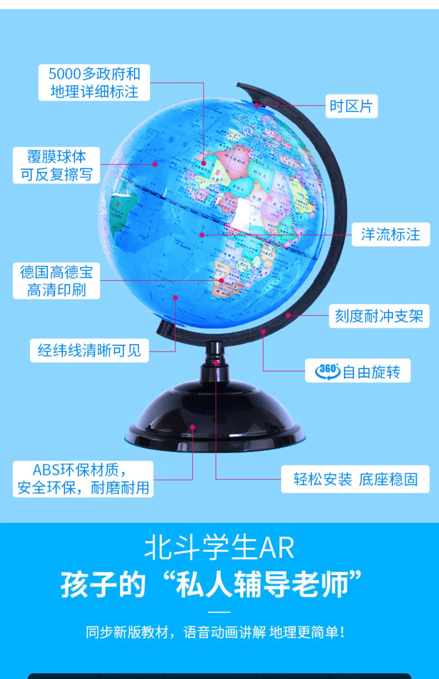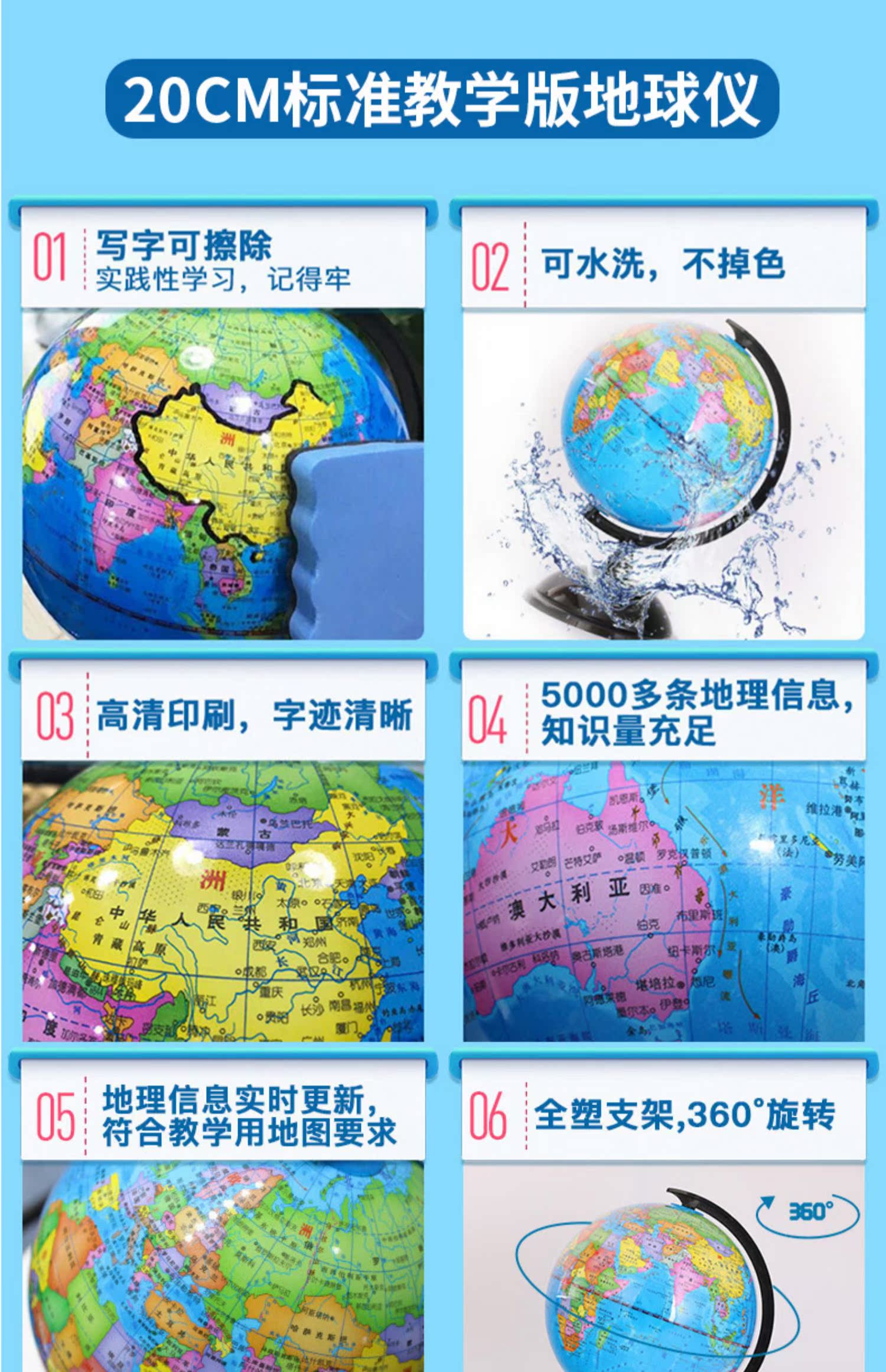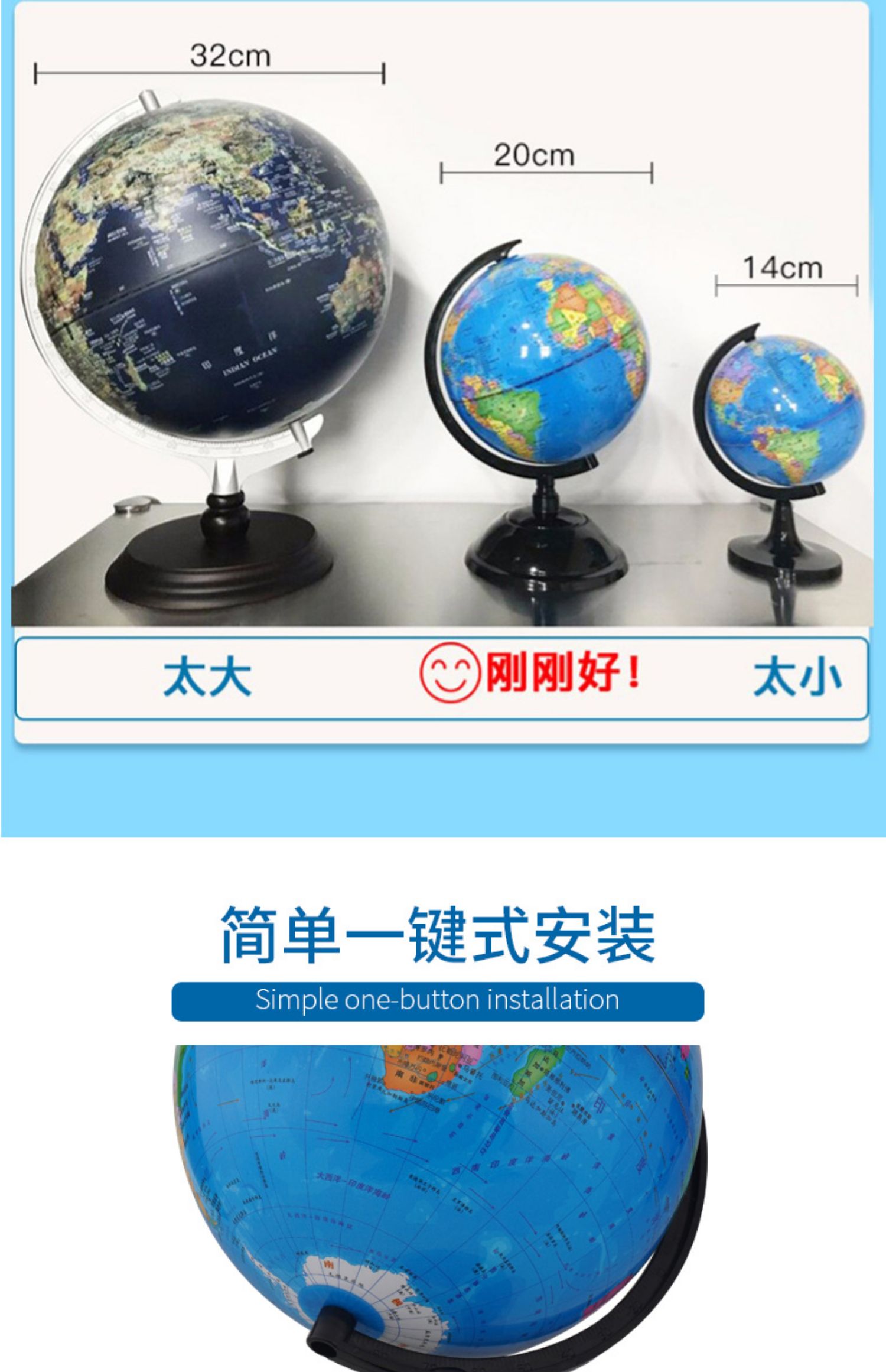 全国中小学教育局地球仪指定品牌,环保材料,旋转支架,360度全方位旋转,中英双语,高清地理信息,再细微的岛屿也能找到,小巧便携,学生学习,教师教学的专业选择。