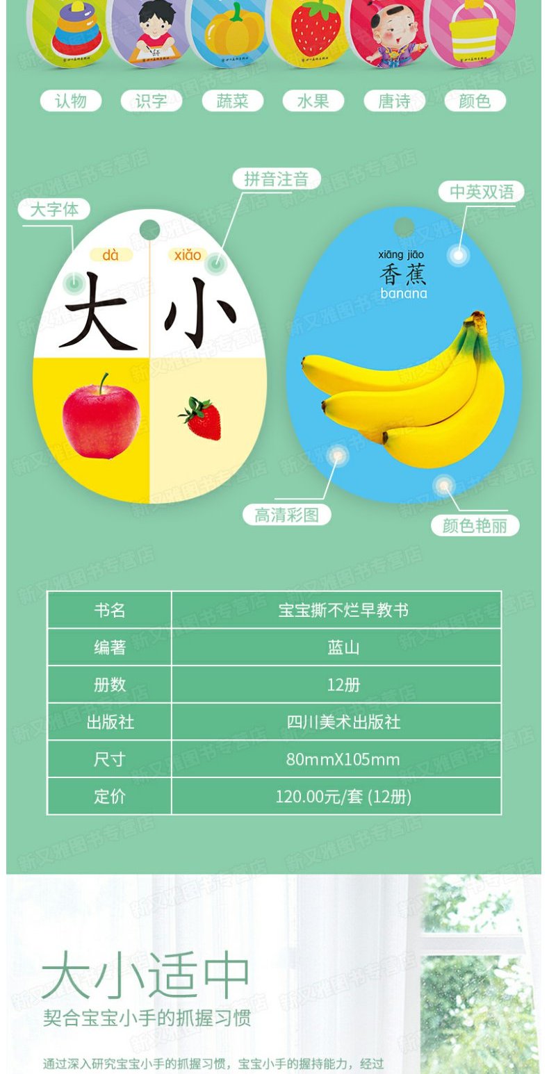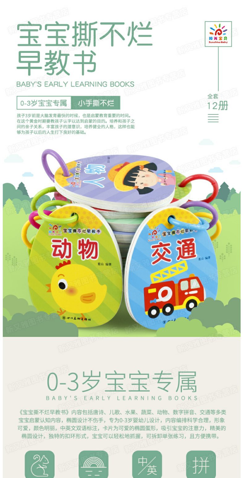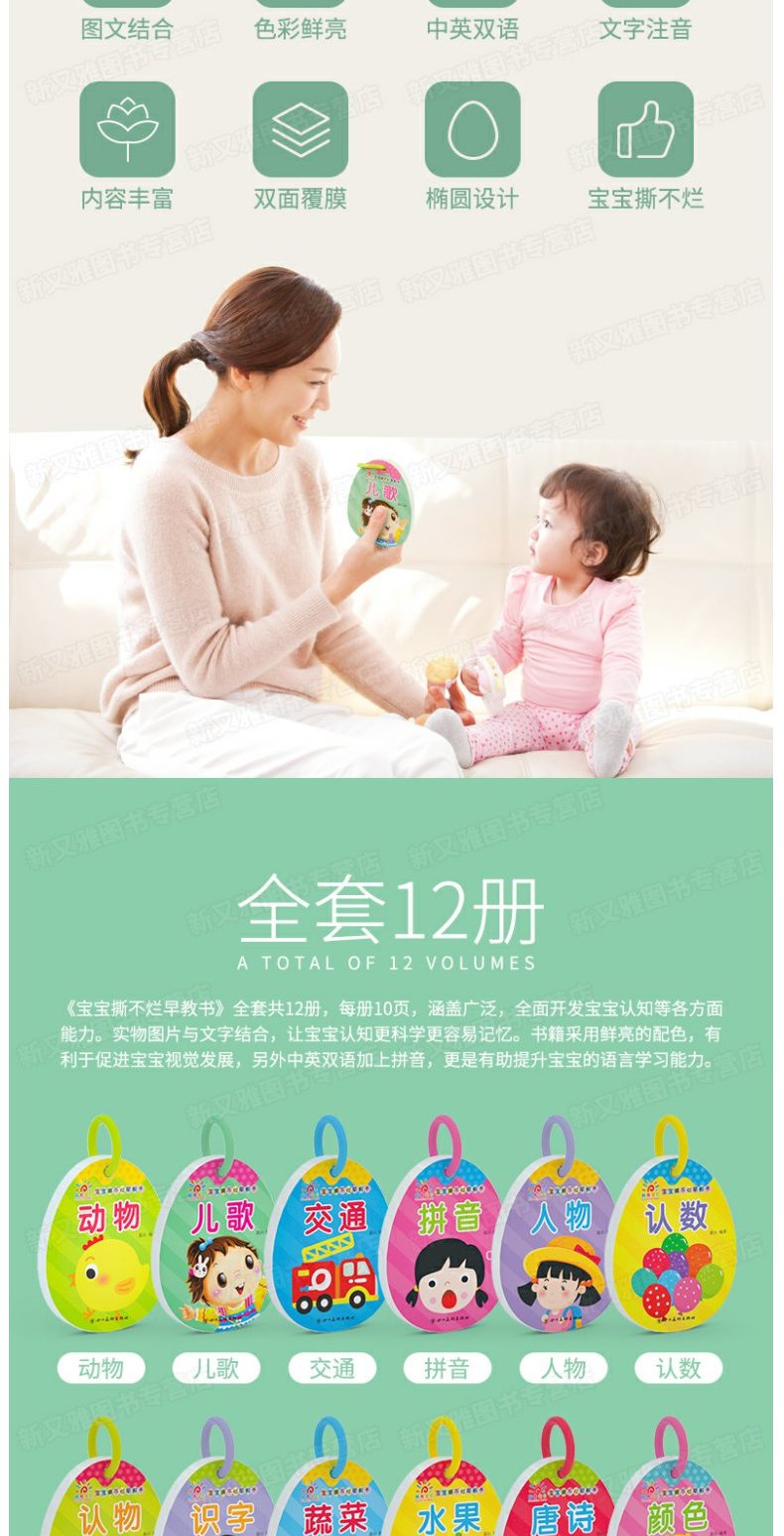 全套12本,张张都是银行卡厚度,宝宝不易撕烂,图片鲜艳,安全无毒,内容丰富,书卡两用,圆角无边不伤手,防水防污,专为婴幼儿做的启蒙书!