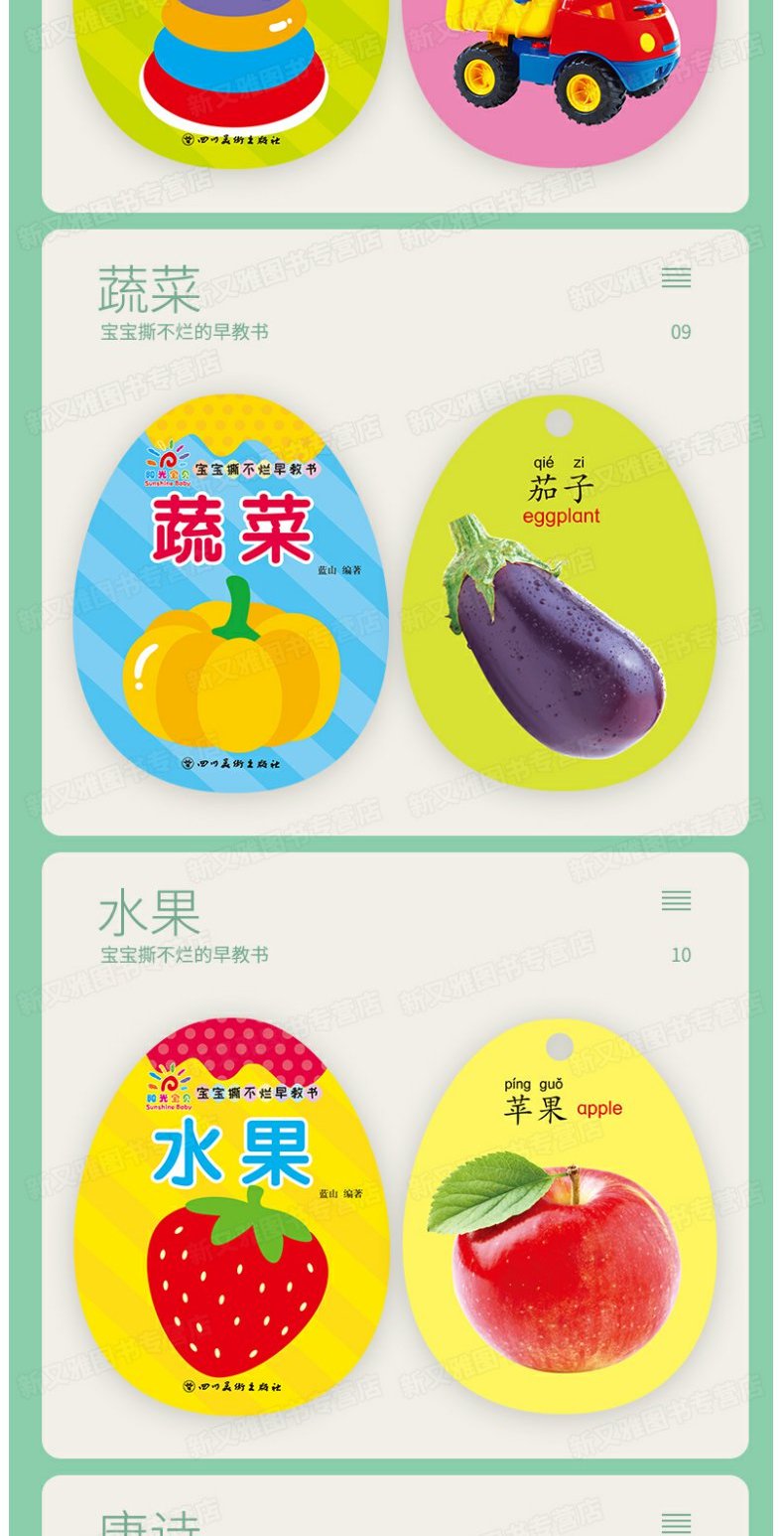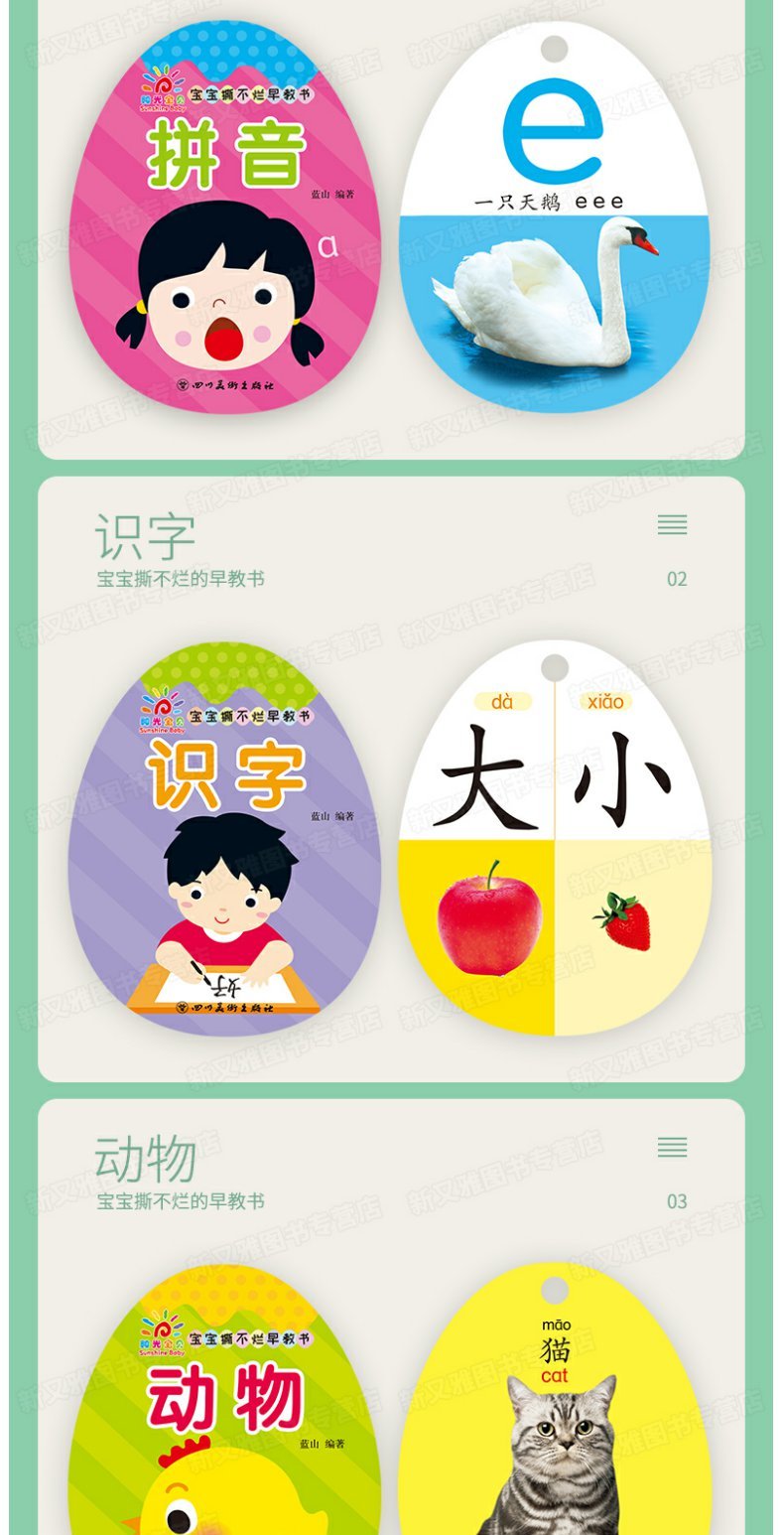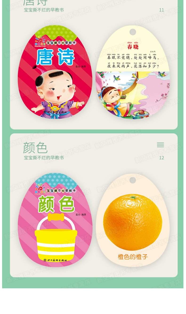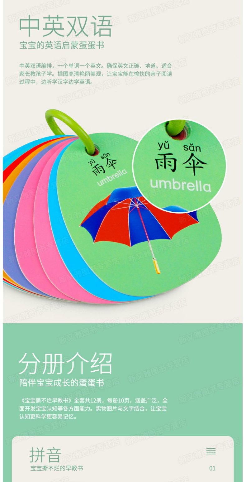 全套12本,张张都是银行卡厚度,宝宝不易撕烂,图片鲜艳,安全无毒,内容丰富,书卡两用,圆角无边不伤手,防水防污,专为婴幼儿做的启蒙书!