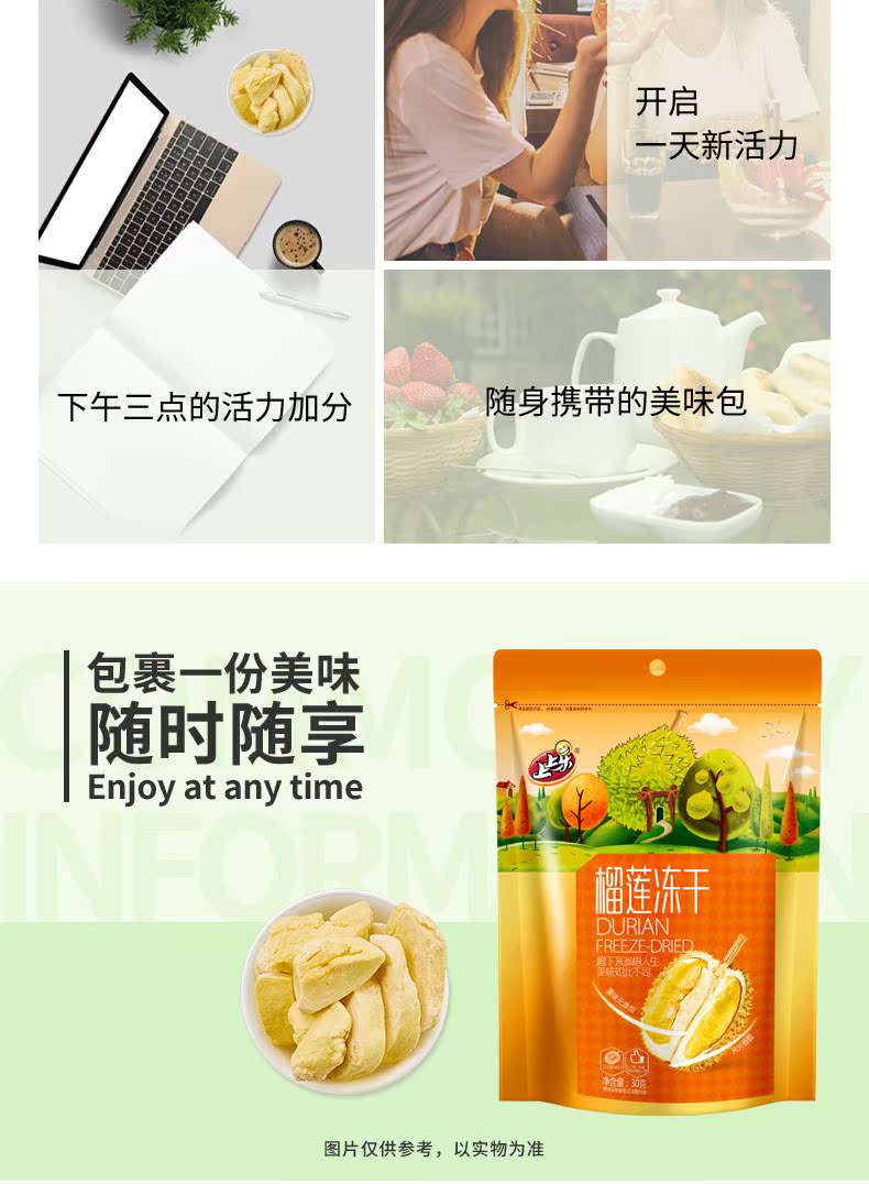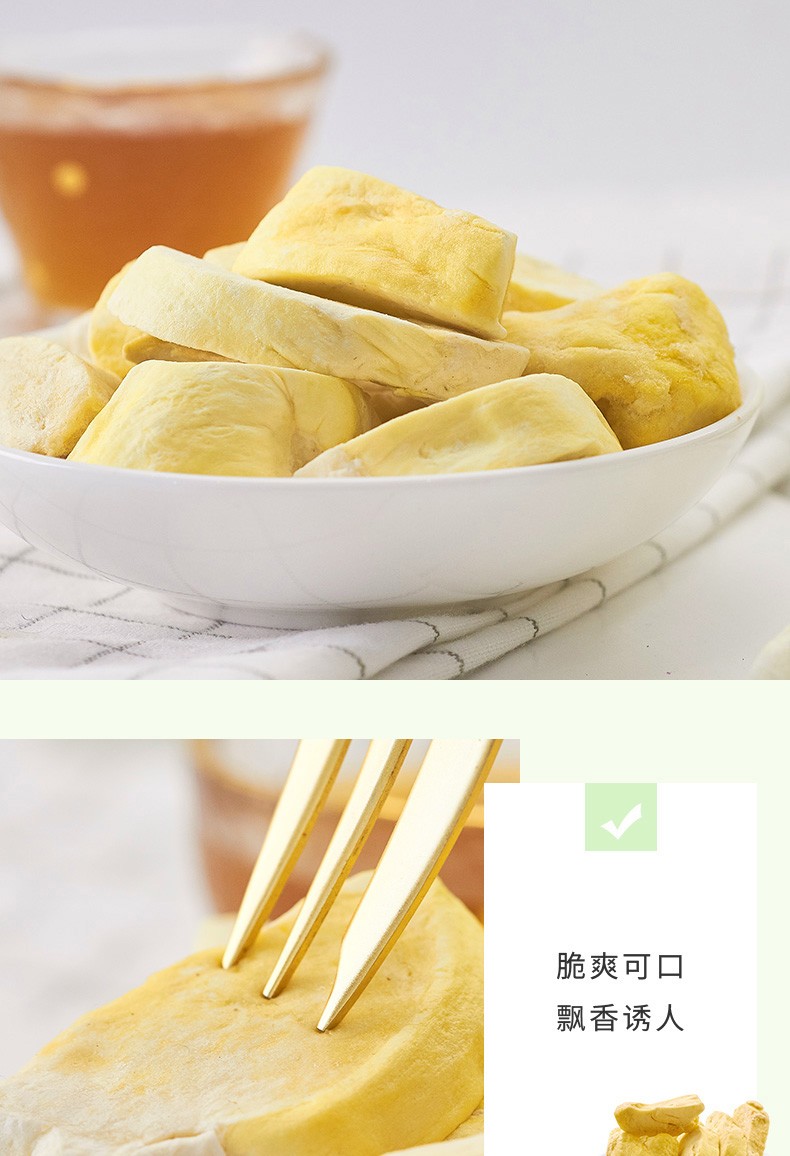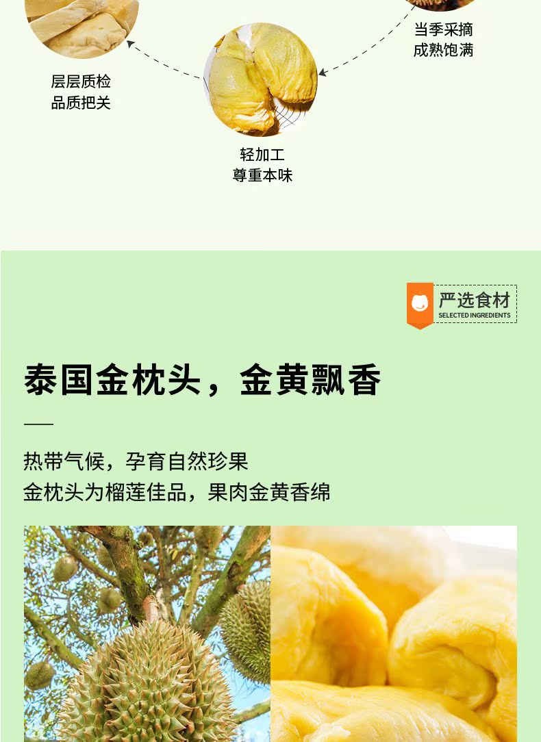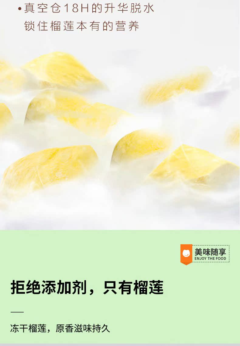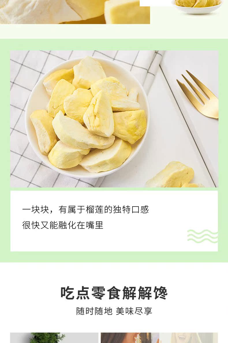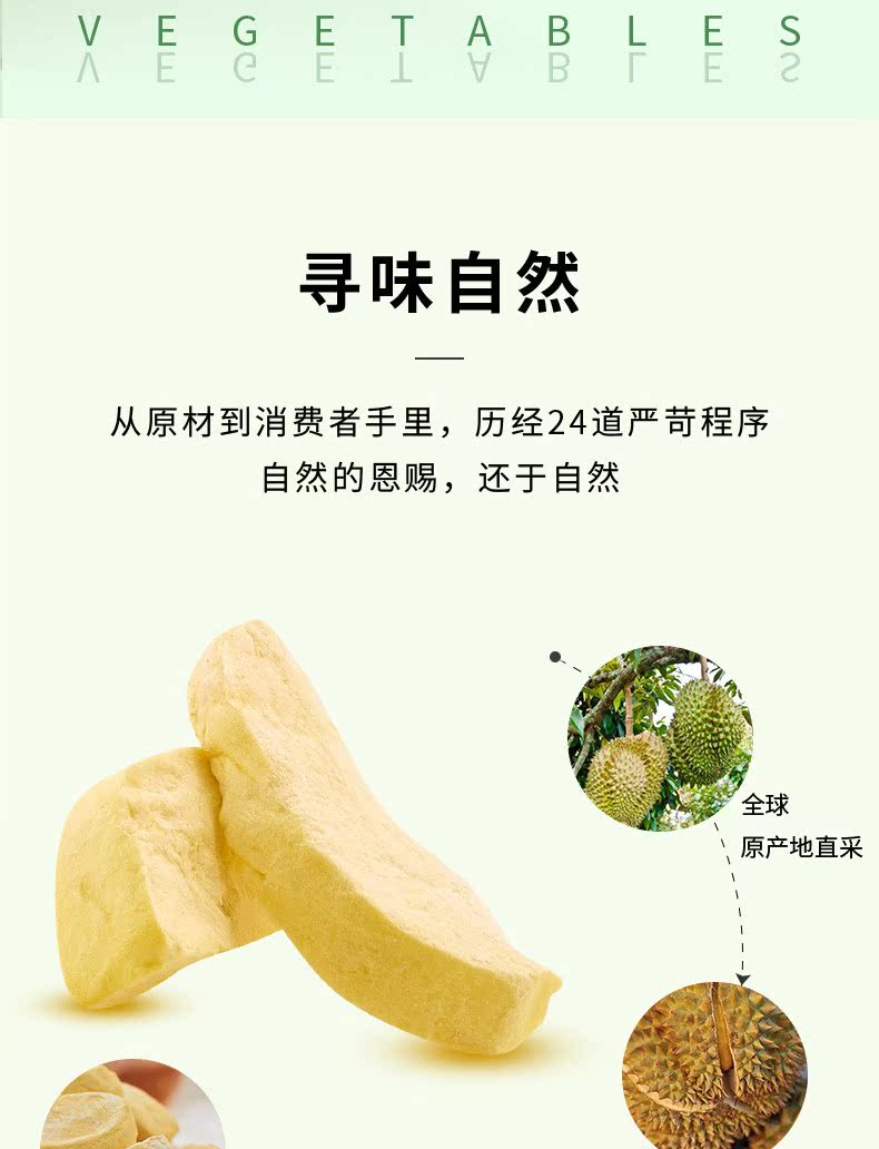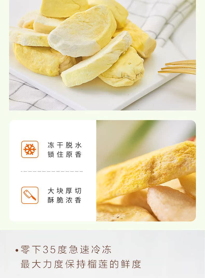 精选泰国优质金枕榴莲,合理配比,0添加,非油炸,非膨化,冻干工艺,浓缩风味,酥脆爽口甜而不腻,干燥脱水保持营养。