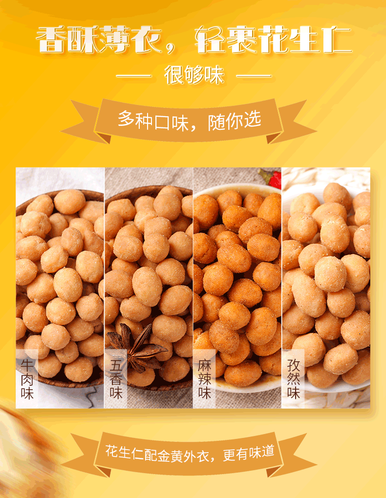 多味花生酥脆好吃,回忆童年的味道。香脆可口,休闲时刻少不了的零食,喝酒时少不了的下酒菜。