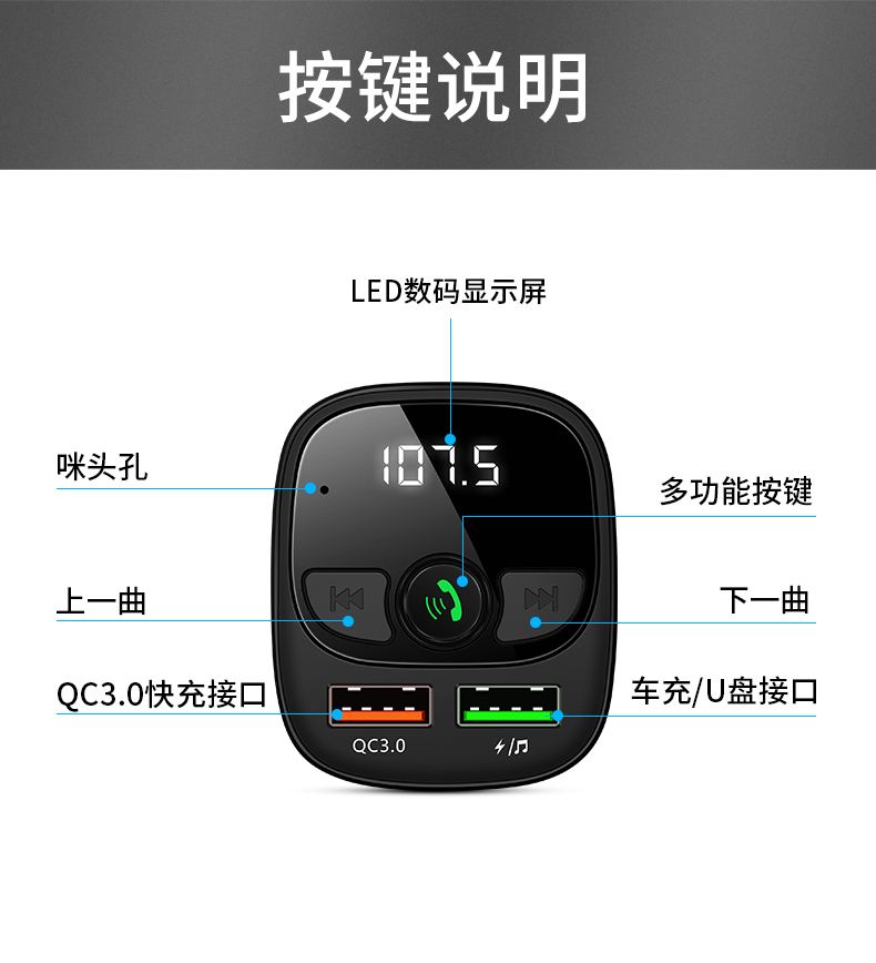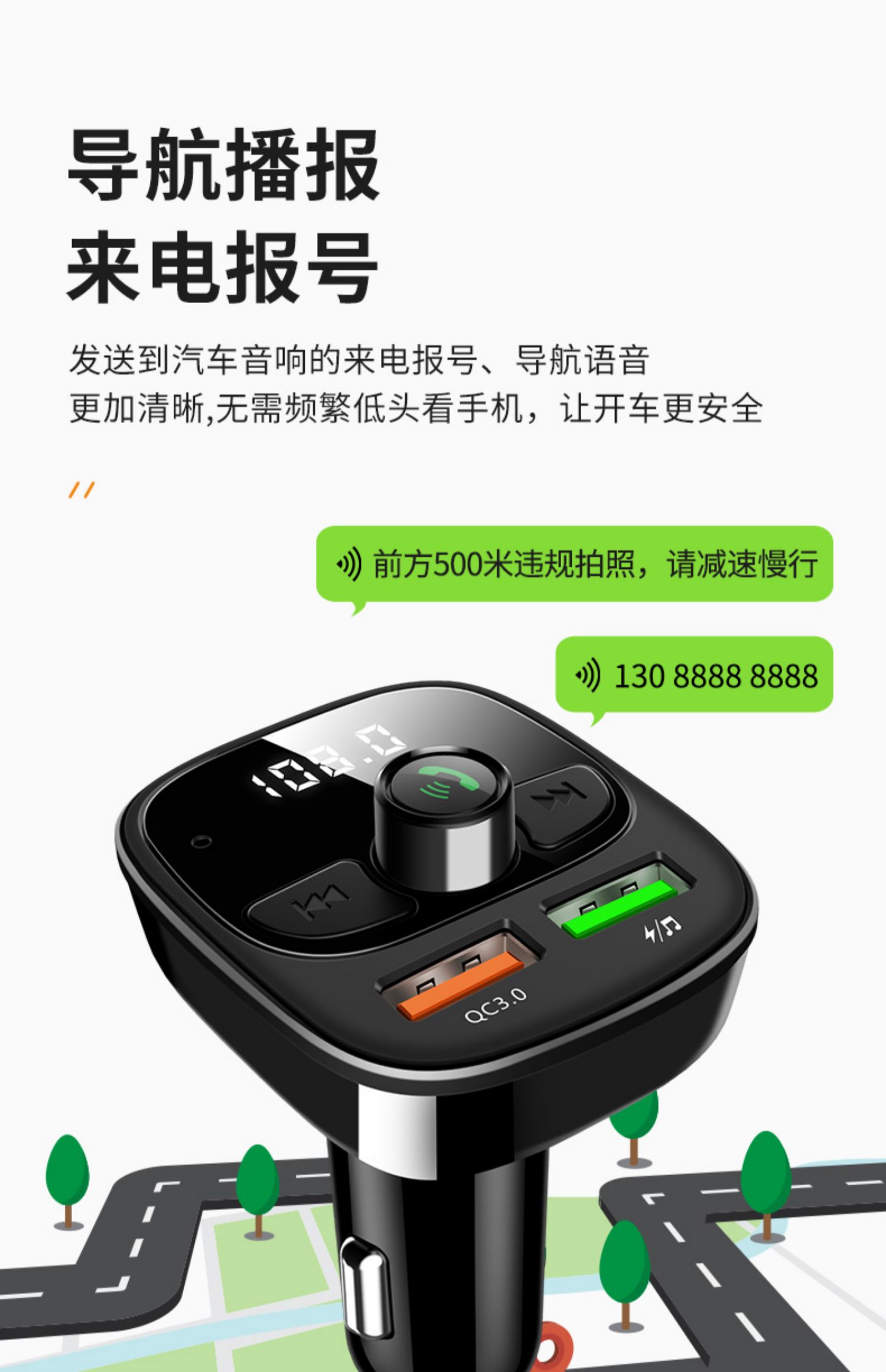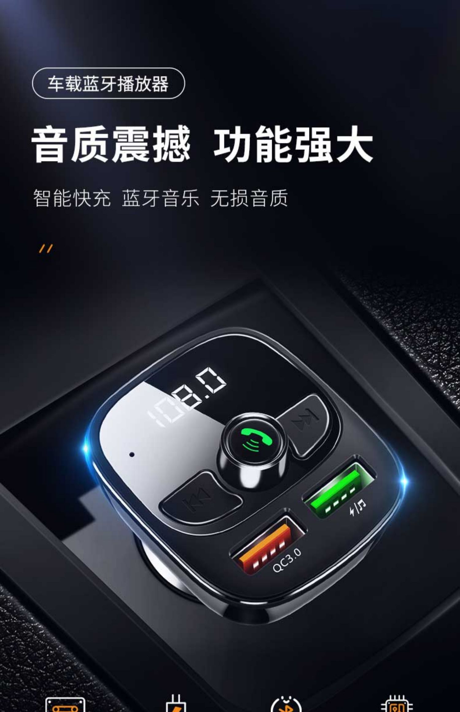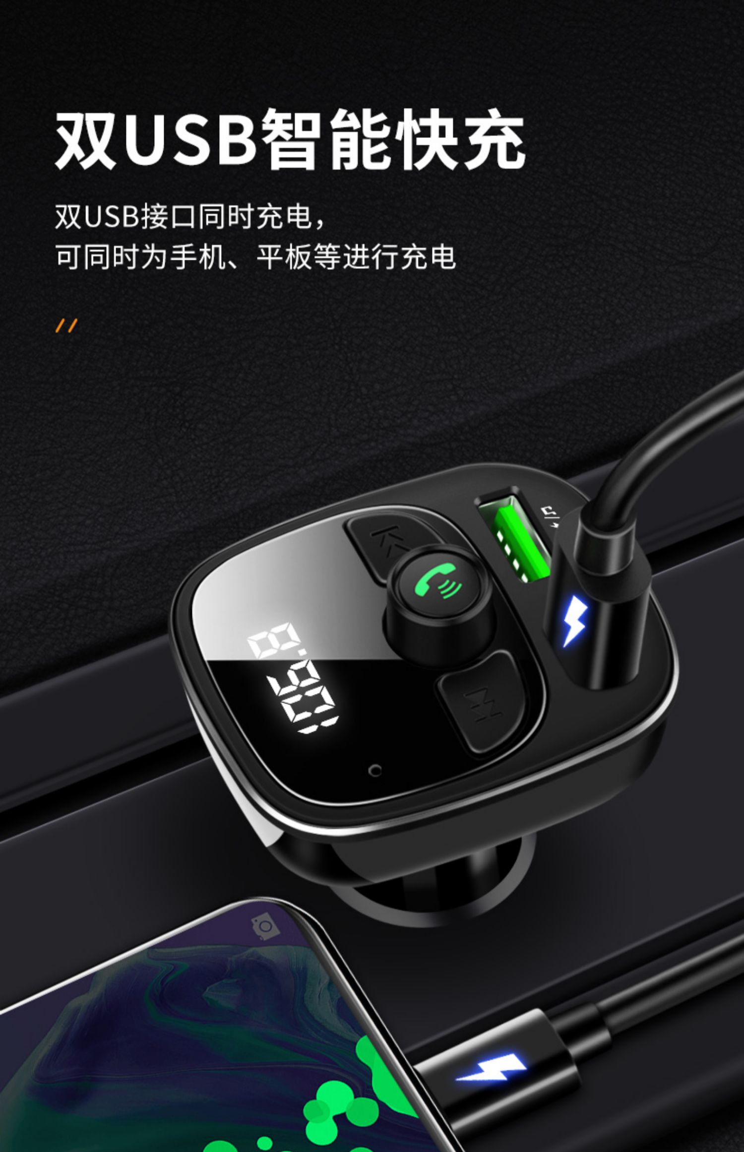 送二合一快充线!!双USB智能快充,手机蓝牙播放,U盘/tf卡播放,接听电话,电压检测,只需轻轻一按,方便自如,一键搞定车生活,不限车型!【赠运费险】