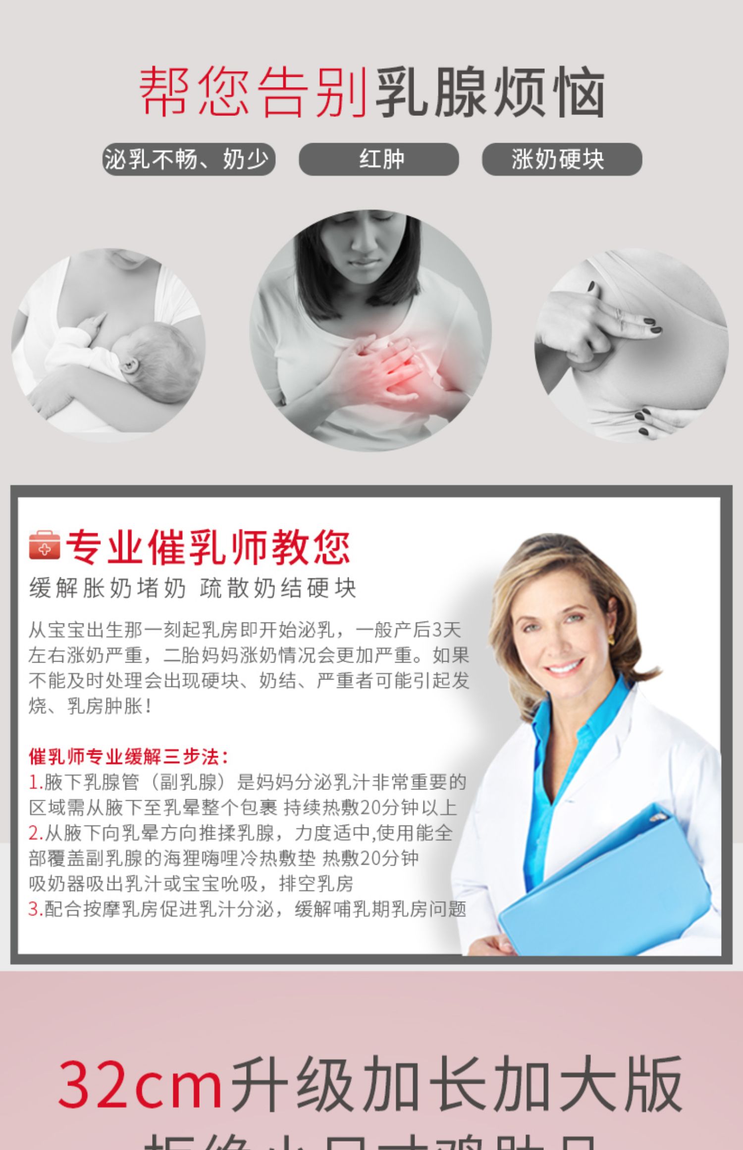 帮助哺乳期妈妈开奶催奶的,增加泌乳量,因为产后妈妈都会发生涨奶,或者奶少,热敷帮助疏通乳腺,帮助开奶下奶,乳腺炎或日常的乳房护理也能用。【赠运费险】