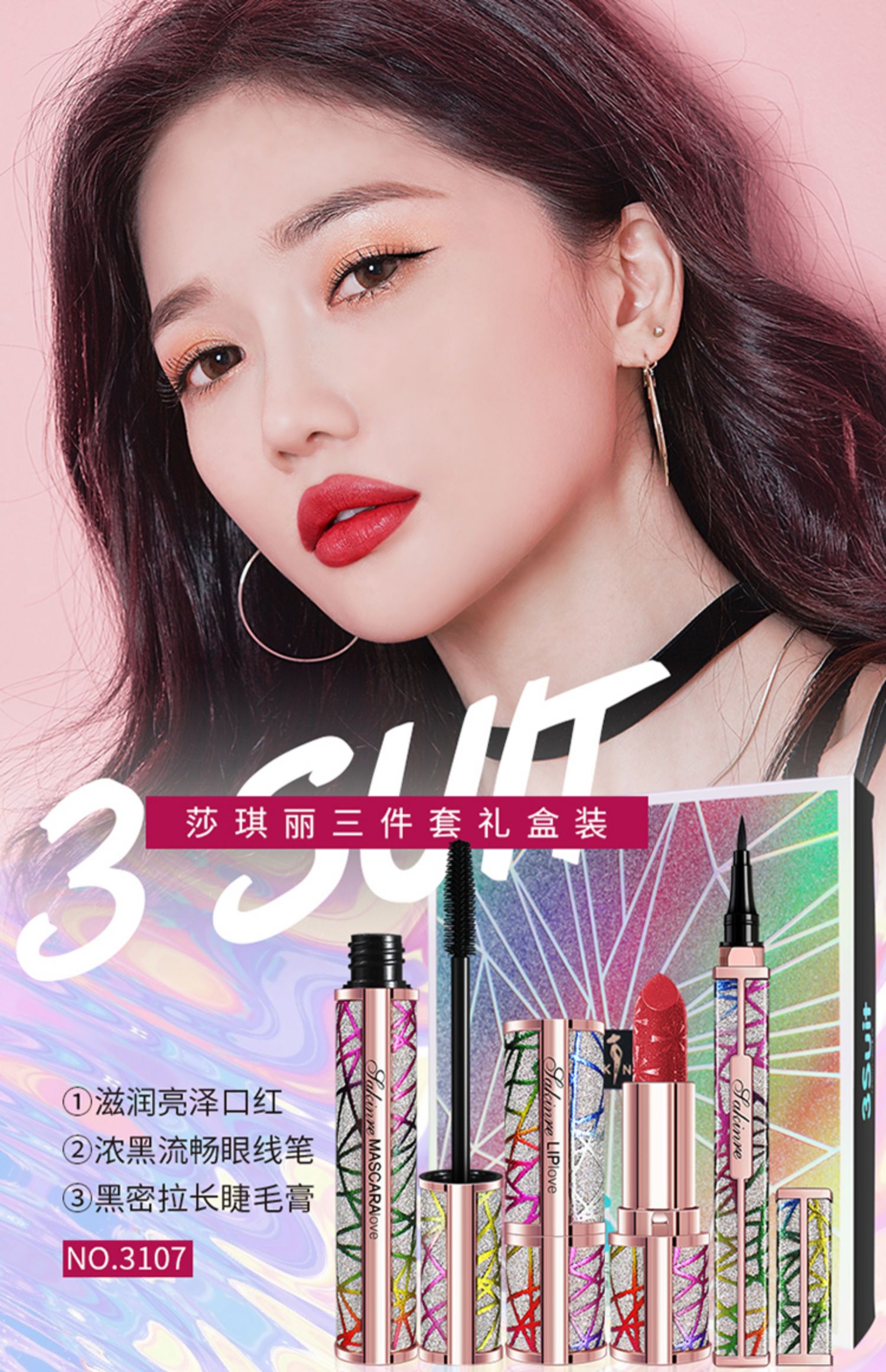 莎琪丽三件套装礼盒装,口红眼线笔睫毛膏,防水不晕染不易掉色,滋润亮泽口红,浓黑流畅眼线笔,黑密拉长睫毛膏,轻柔水润,显色饱满,精致妆容一触即发【赠运费险】