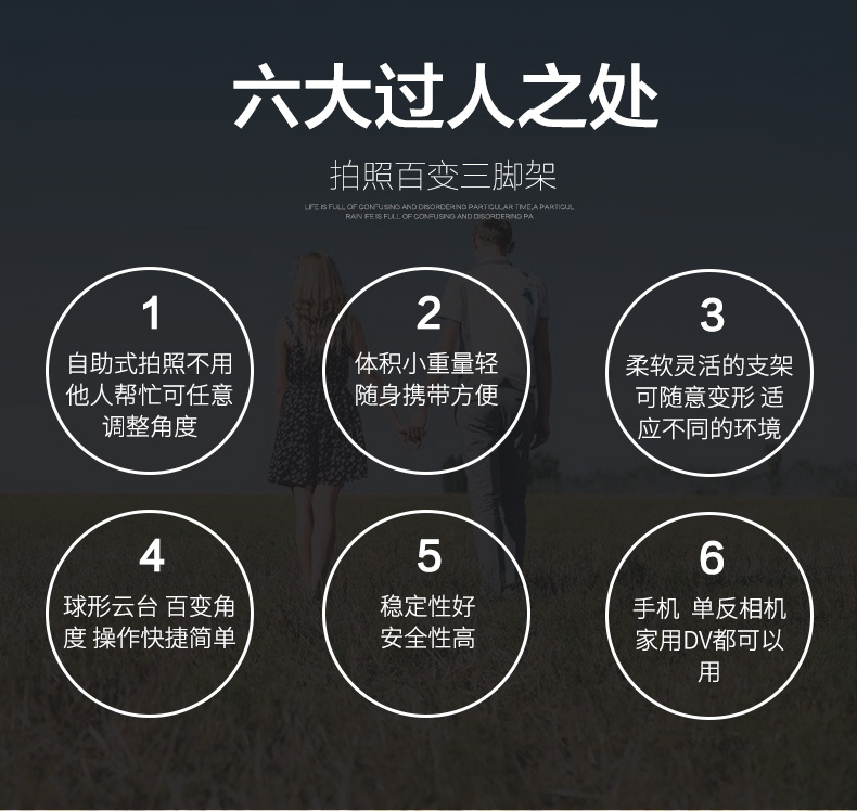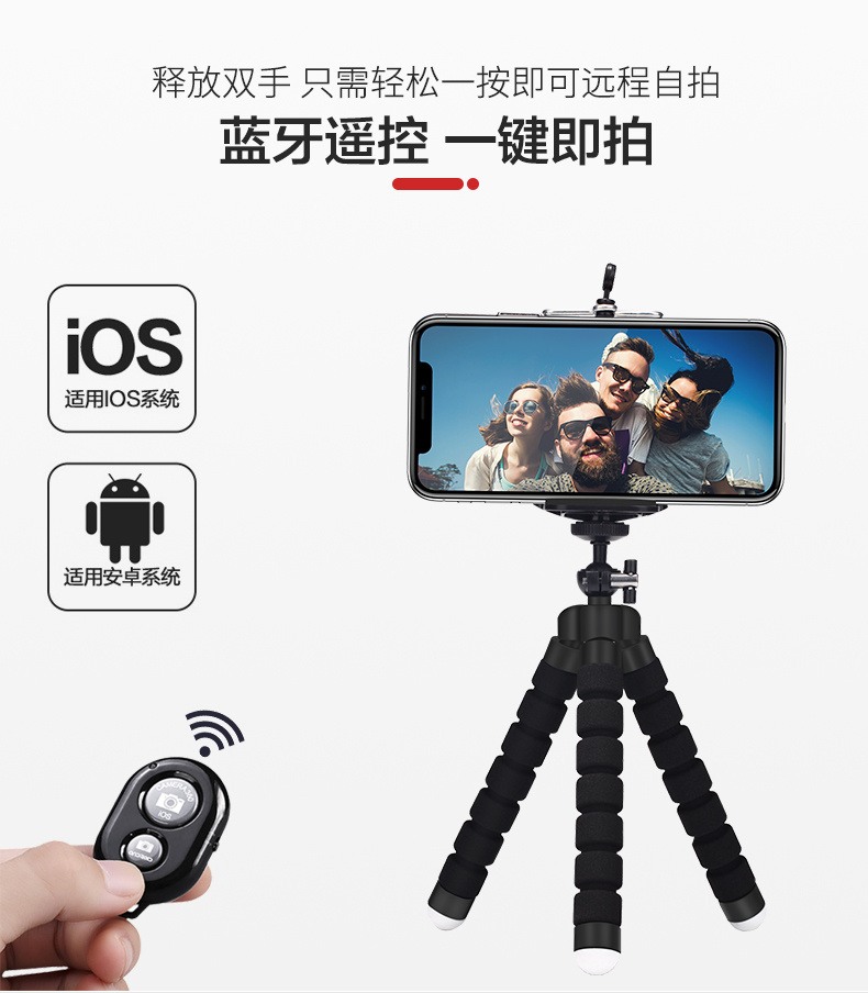 便携式多用途,单反手机平板,拍照直播追剧,统统都好使,蓝牙遥控,一键即拍,百变造型,适用广泛,怎么折腾都可以!
