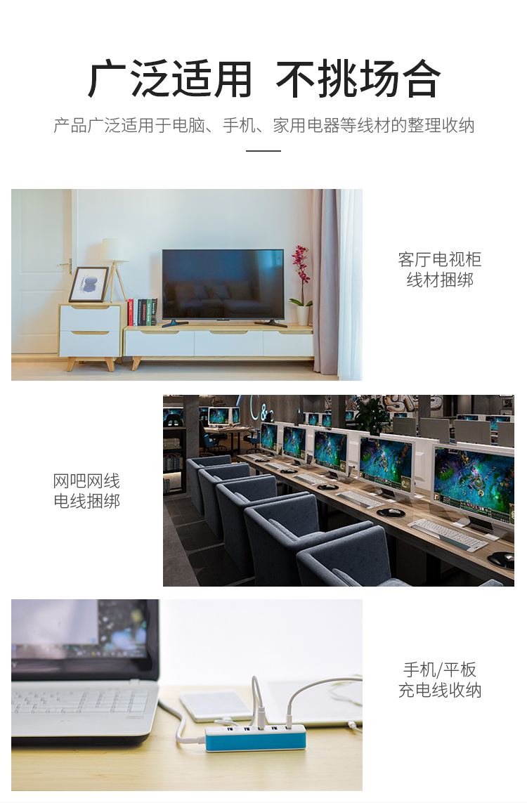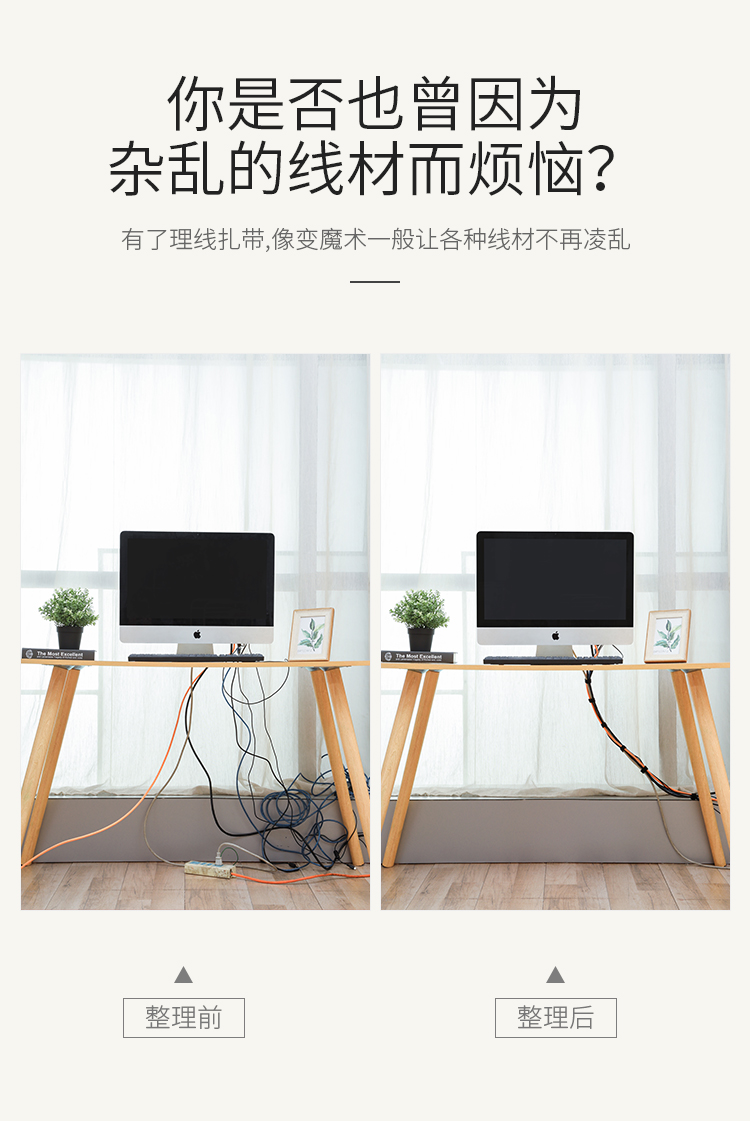 精细做工,不跳线,不错线,双层网袋,双层松紧带设计,内里绒面设计,手感舒适,自有裁剪,方便收纳,轻松搞定各类电线数据线杂乱,居家办公两用!