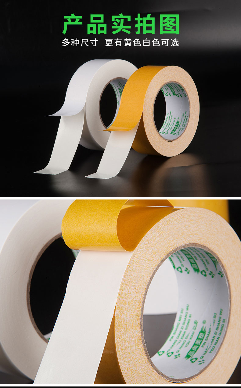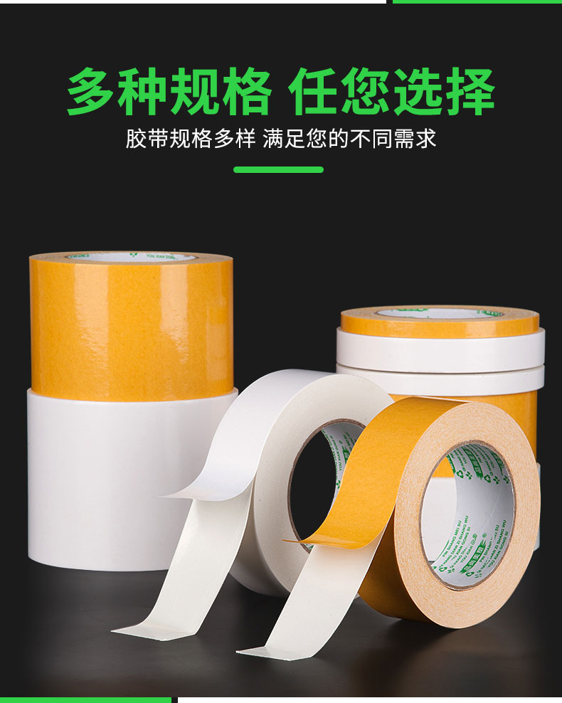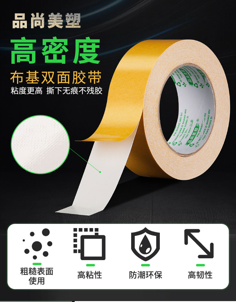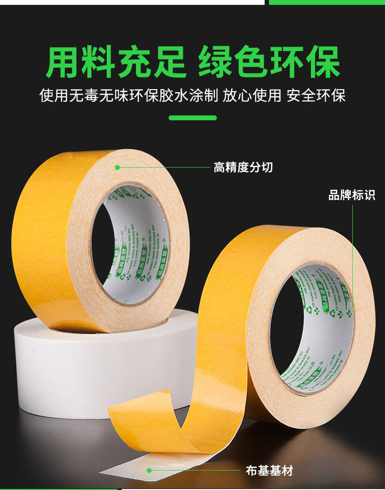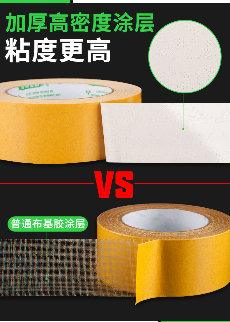 高密度布基双面胶带,粘度更高,撕下无痕不残胶,加厚密度涂层粘度更高,用料充足绿色环保,韧劲好,拉不断结实耐用,多种规格任您选择,胶带规格多样,满足您的不同需求。