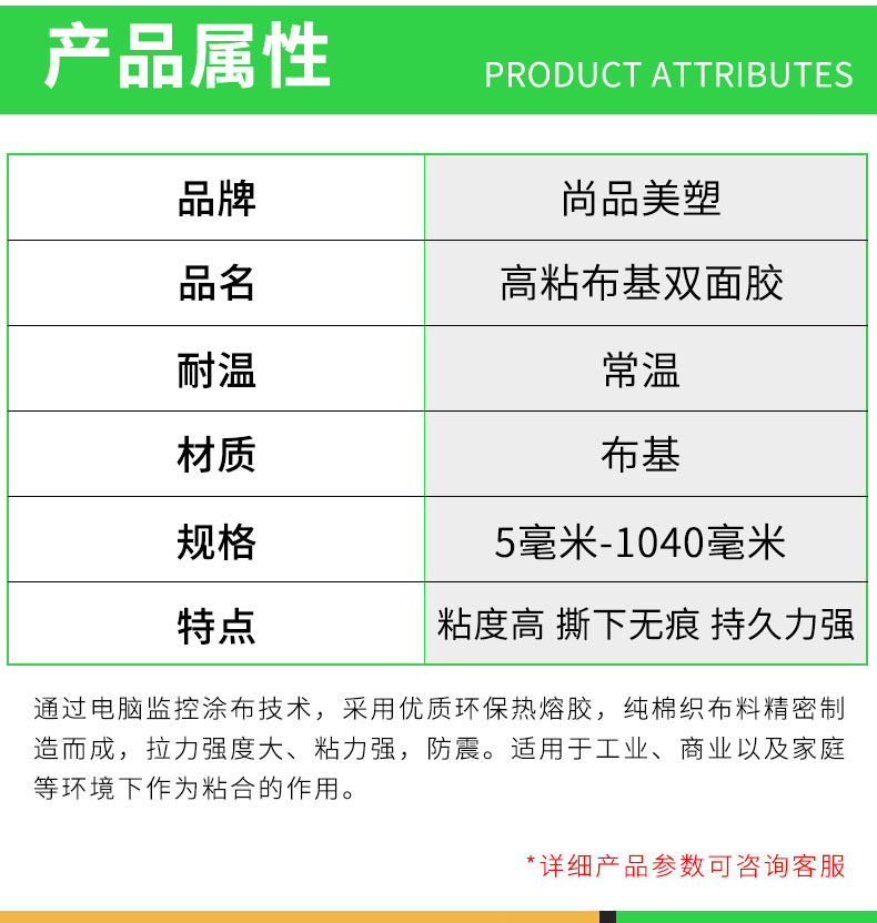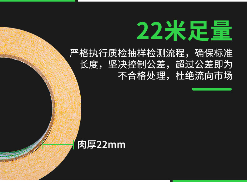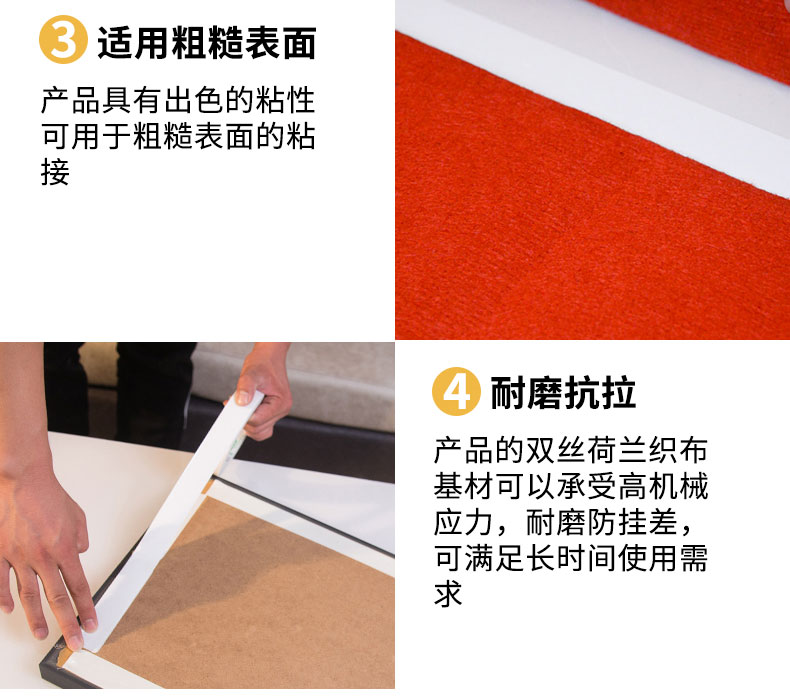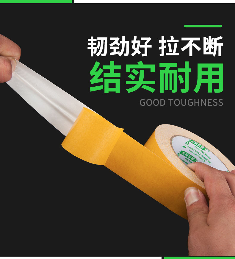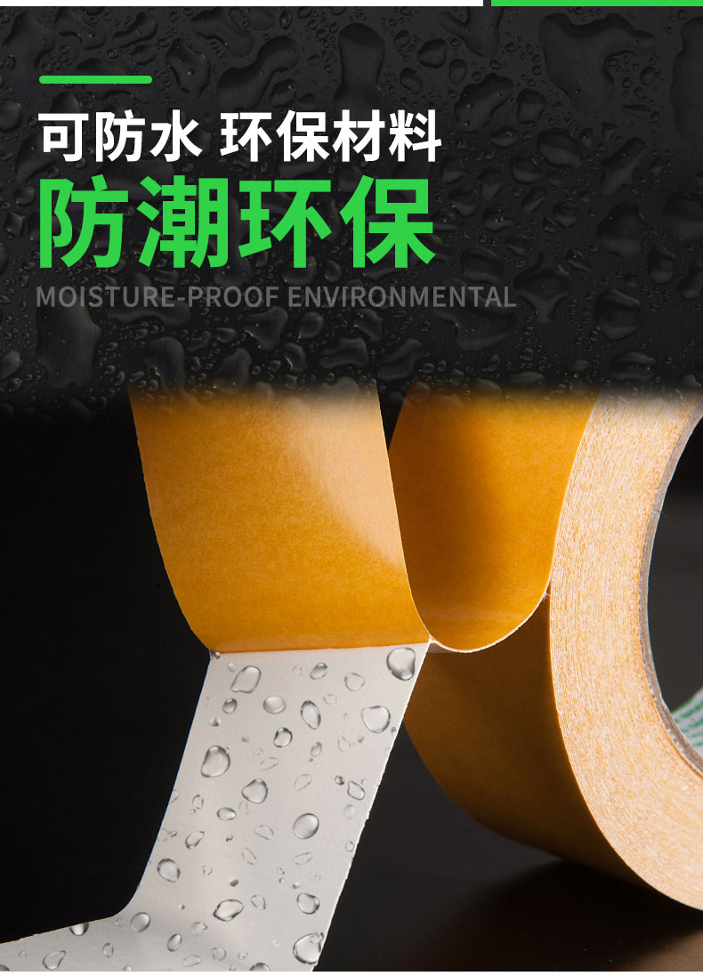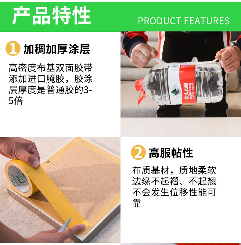 高密度布基双面胶带,粘度更高,撕下无痕不残胶,加厚密度涂层粘度更高,用料充足绿色环保,韧劲好,拉不断结实耐用,多种规格任您选择,胶带规格多样,满足您的不同需求。