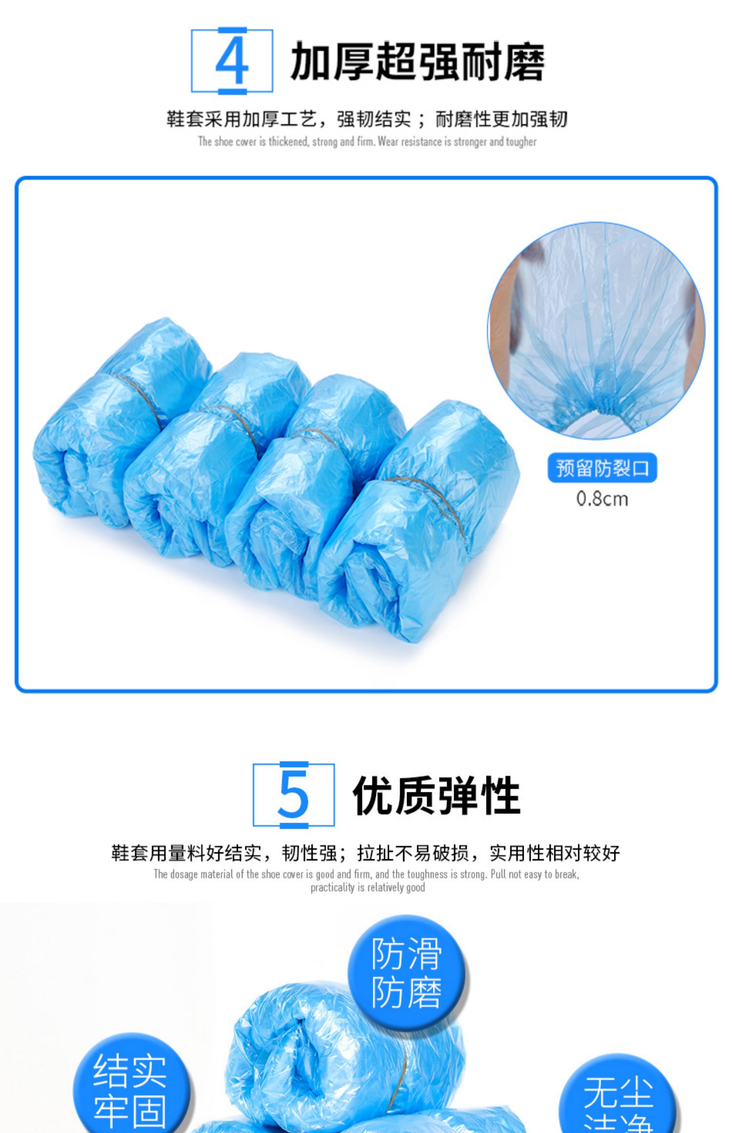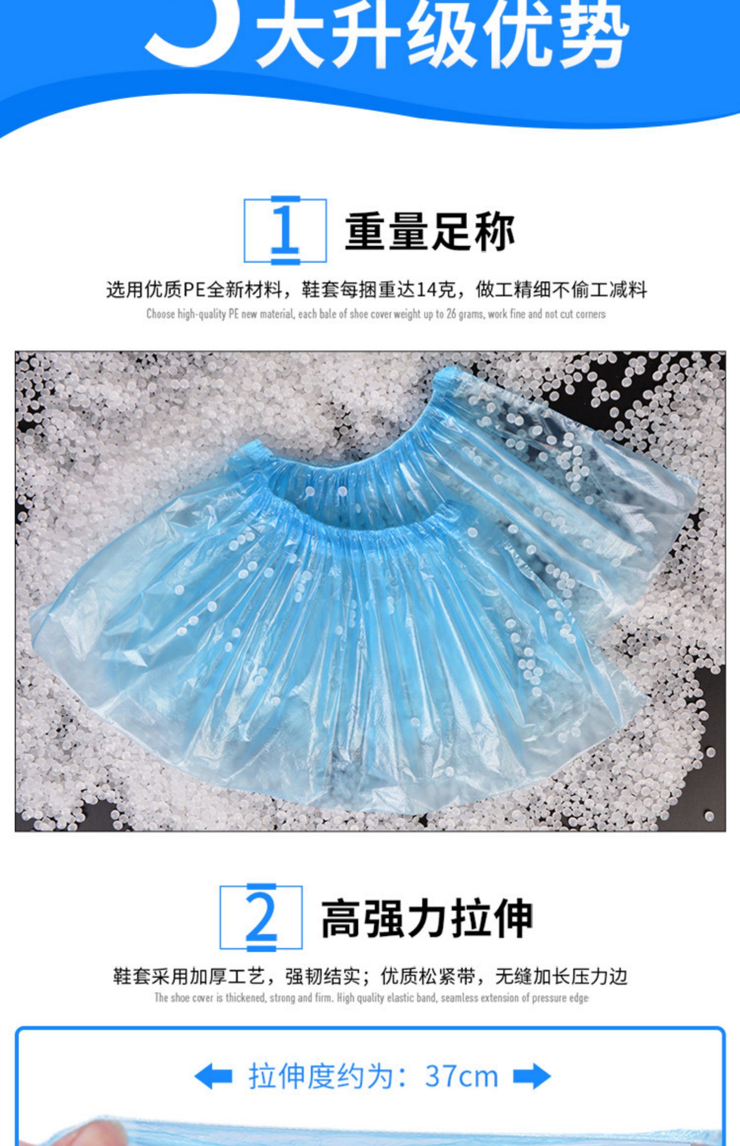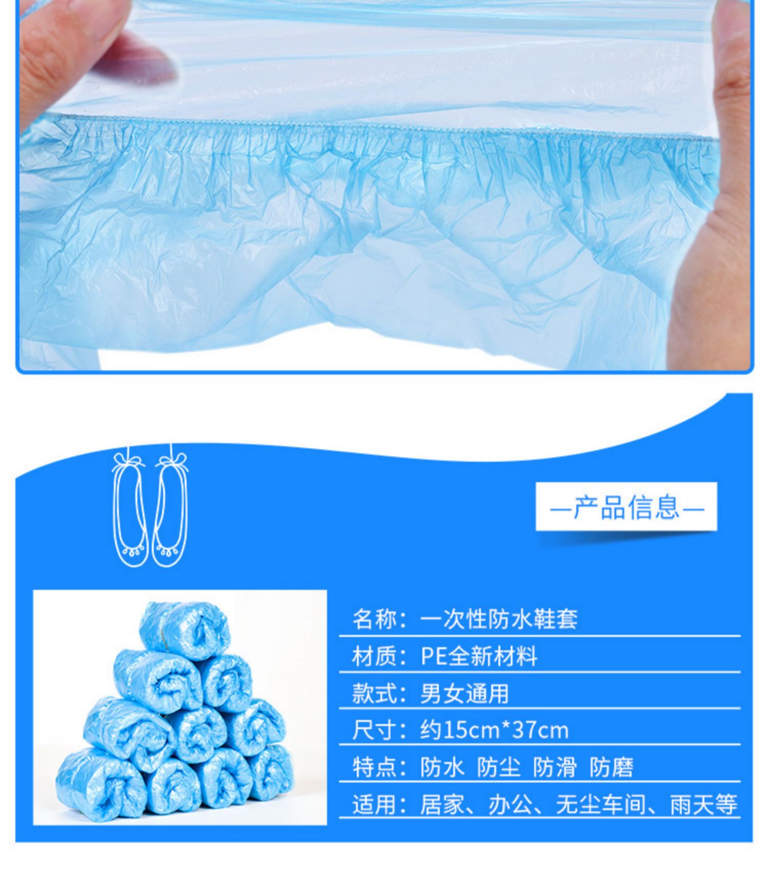 【100只加厚+防水+防尘+防滑+防磨】一次性防水鞋套,选用优质PE全新材料,高强力拉伸,加厚耐磨,强韧结实,不易破损,优质松紧带,下雨天外出不用担心鞋子弄脏打湿。【运费险】