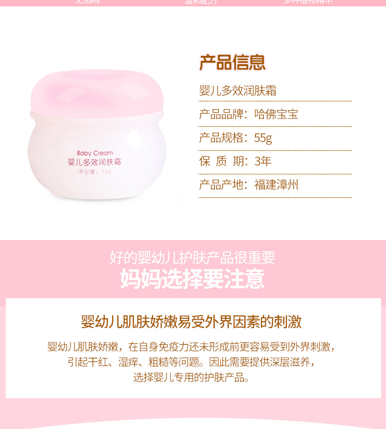 【拍两件更划算第二件0元赠运费险】,护肤要从娃娃抓起,宝宝肌肤柔嫩易敏,试试哈佛宝宝婴儿面霜,温和加倍滋润,有效提升宝宝肌肤免疫力。杜绝干红、湿痒、粗糙等问题。婴儿专用面霜速抢啦