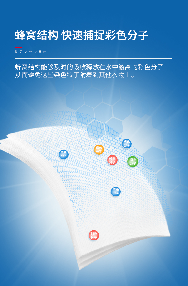 蜂窝网状结构,迅速吸收在清洗中产生的有机色素离子,和尘埃粒子,有效防止串色,有效吸附衣物上的荧光增白剂,使用方便,低碳节能,省时省力。【赠运费险】