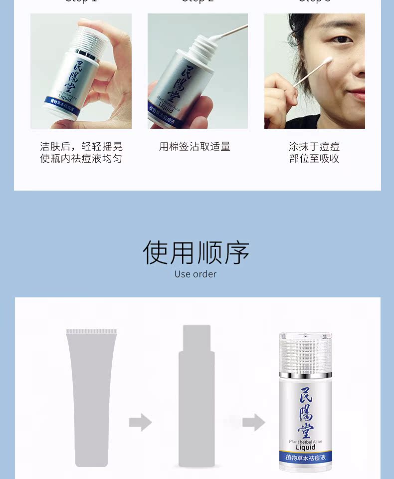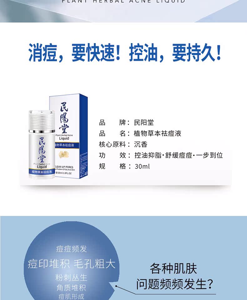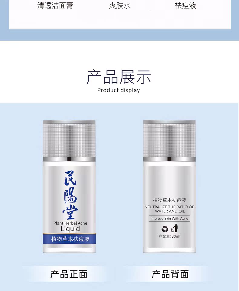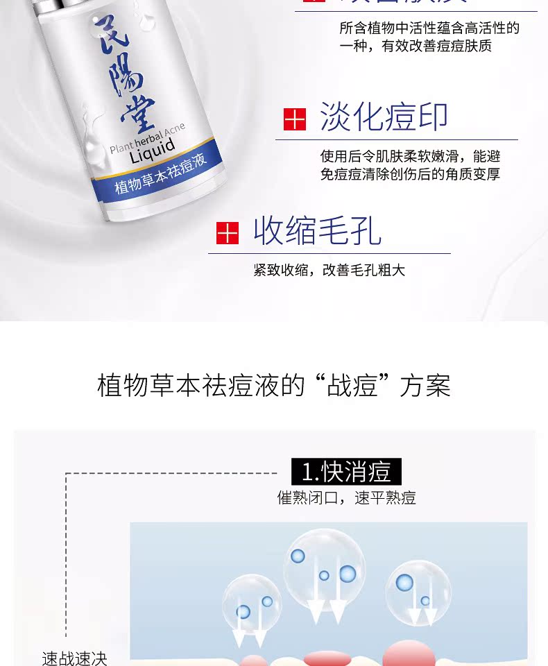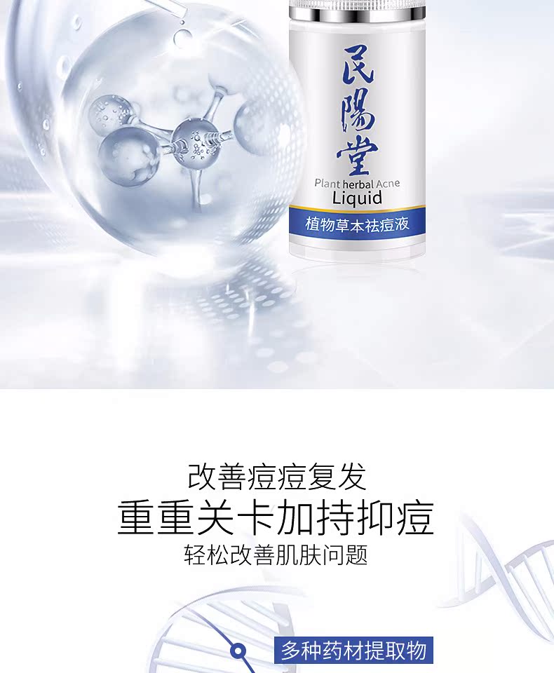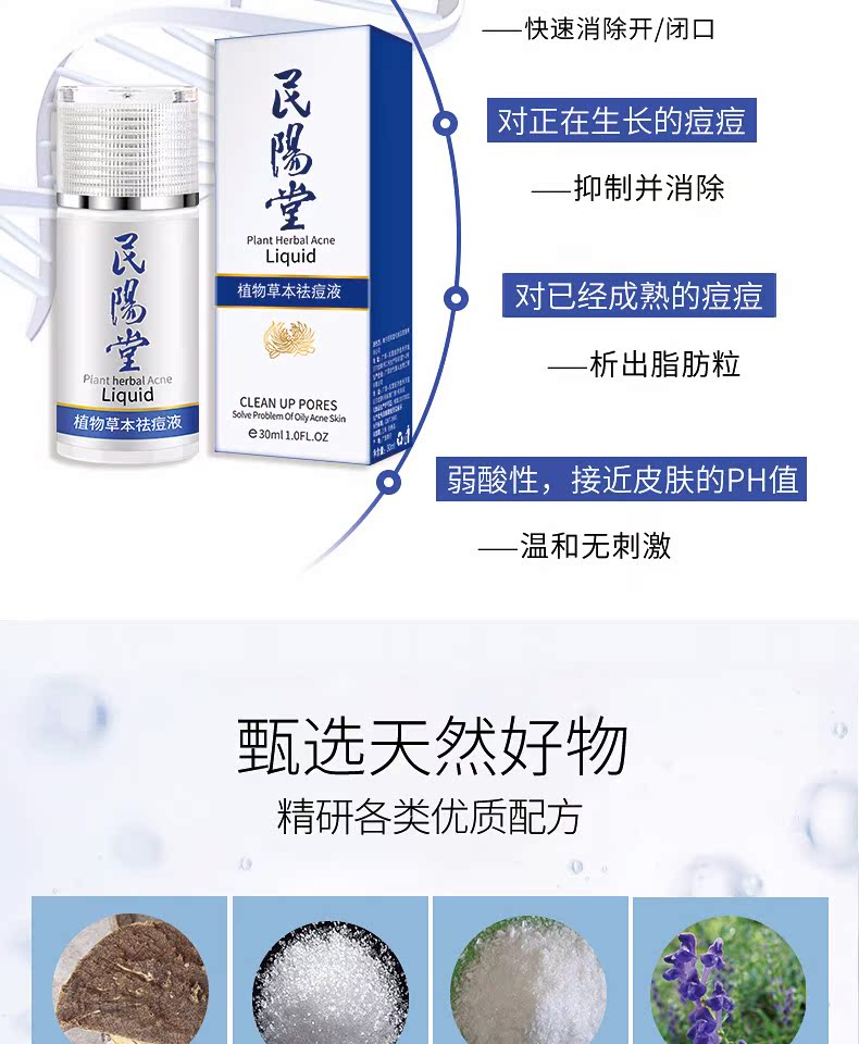 民阳堂植物草本祛痘液,一支祛痘,面膜修复,双层保障,效果明显!祛痘控油专利+抗敏舒缓专利,专注解决各类顽固痘痘,平衡水油,深层修护,祛痘淡印,收缩毛孔,战“痘”到底不留痕~