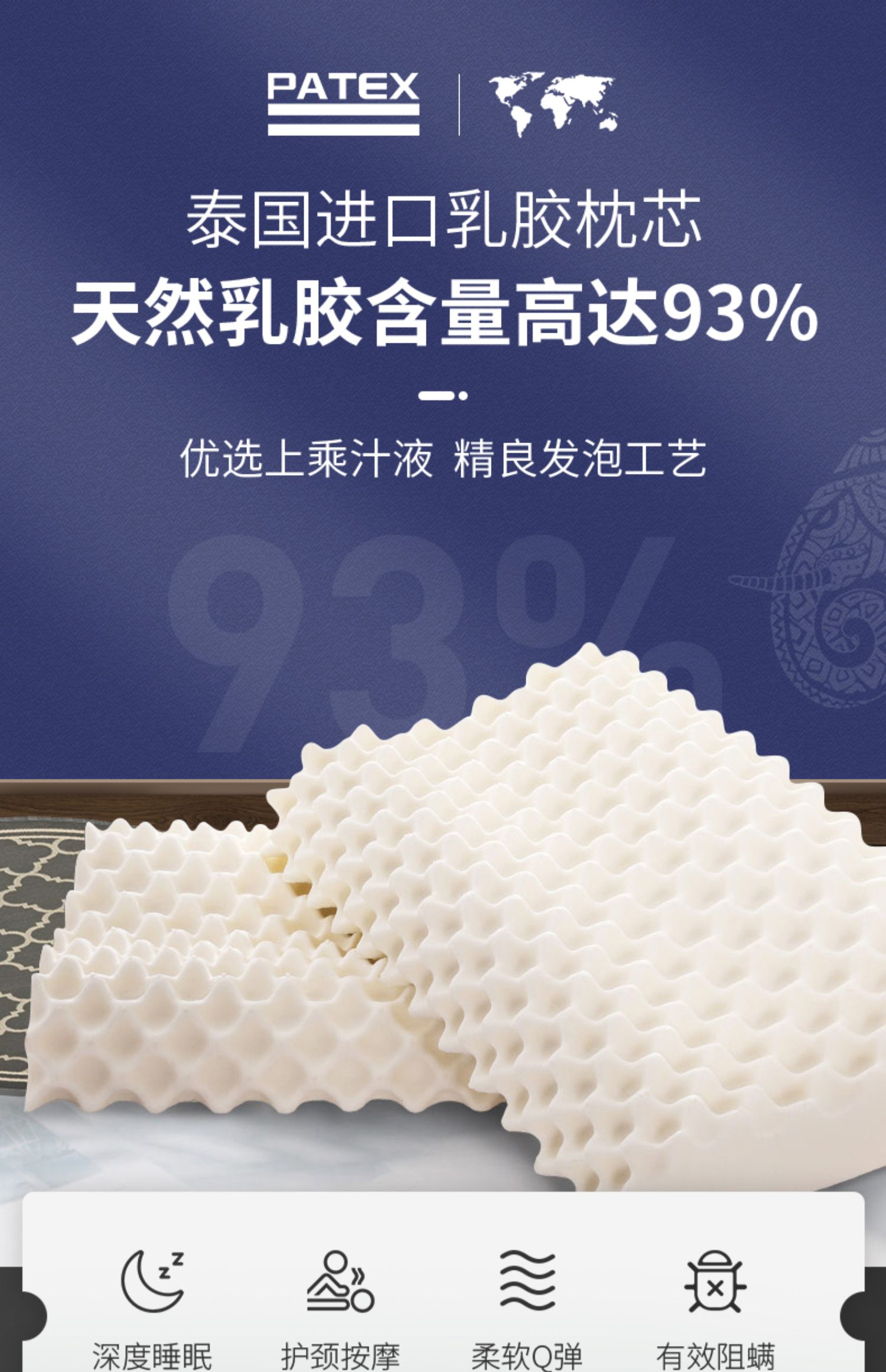 【PATEX】泰国进口天然乳胶枕头枕芯!全球知名乳胶品牌,泰国原装进口,材料取自黄金树龄的乳胶原液,无添加,天然无刺激。透气清爽,一秒回弹,附带按摩颗粒SPA级指腹按摩,给您一晚优质睡眠!