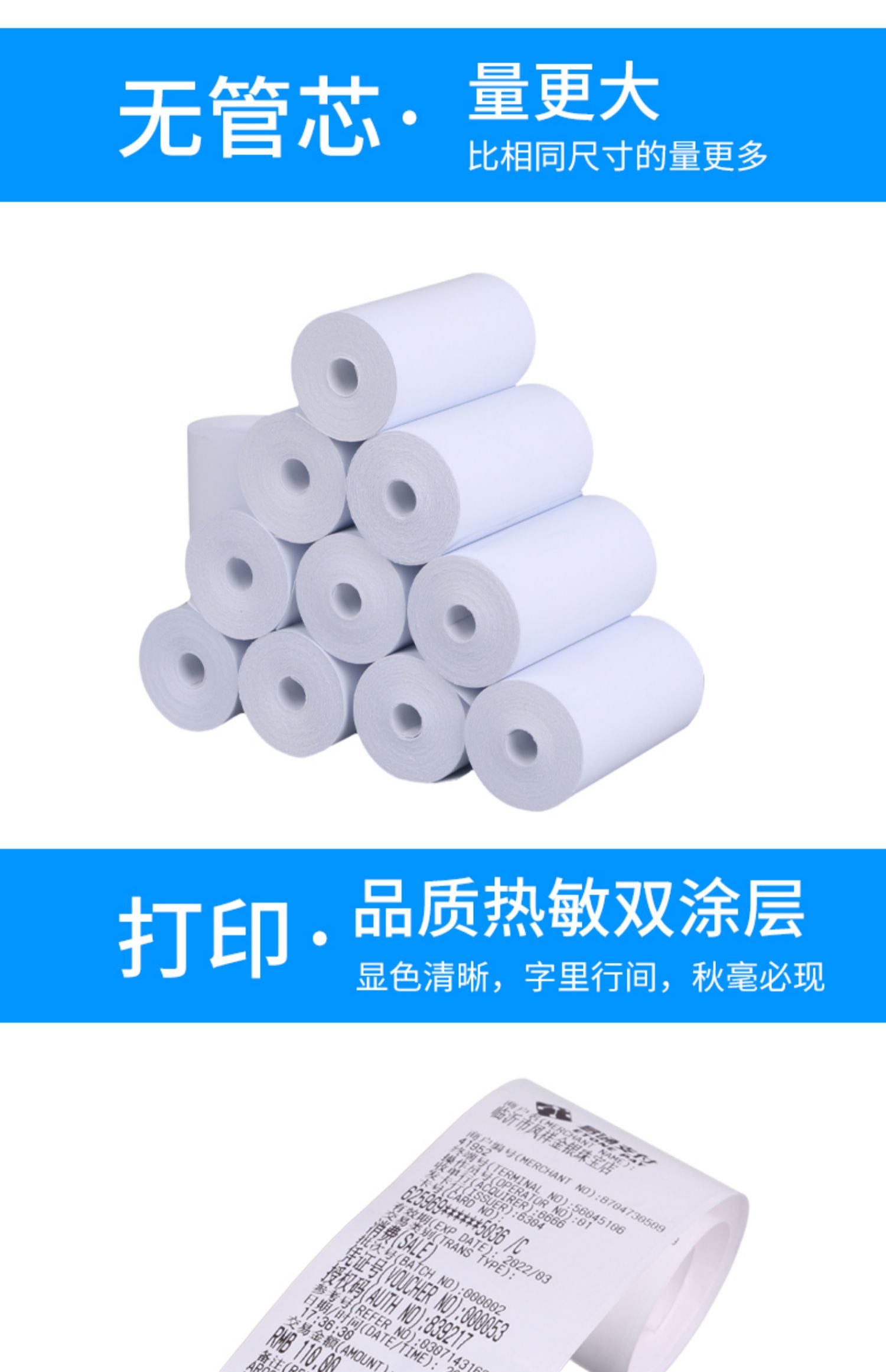 热敏打印纸,采用木浆原色,一卷顶两卷,足米足量不虚标,打印清晰不卡纸,满足各个行业需求,环保材料无异味,多种规格,超值选购。