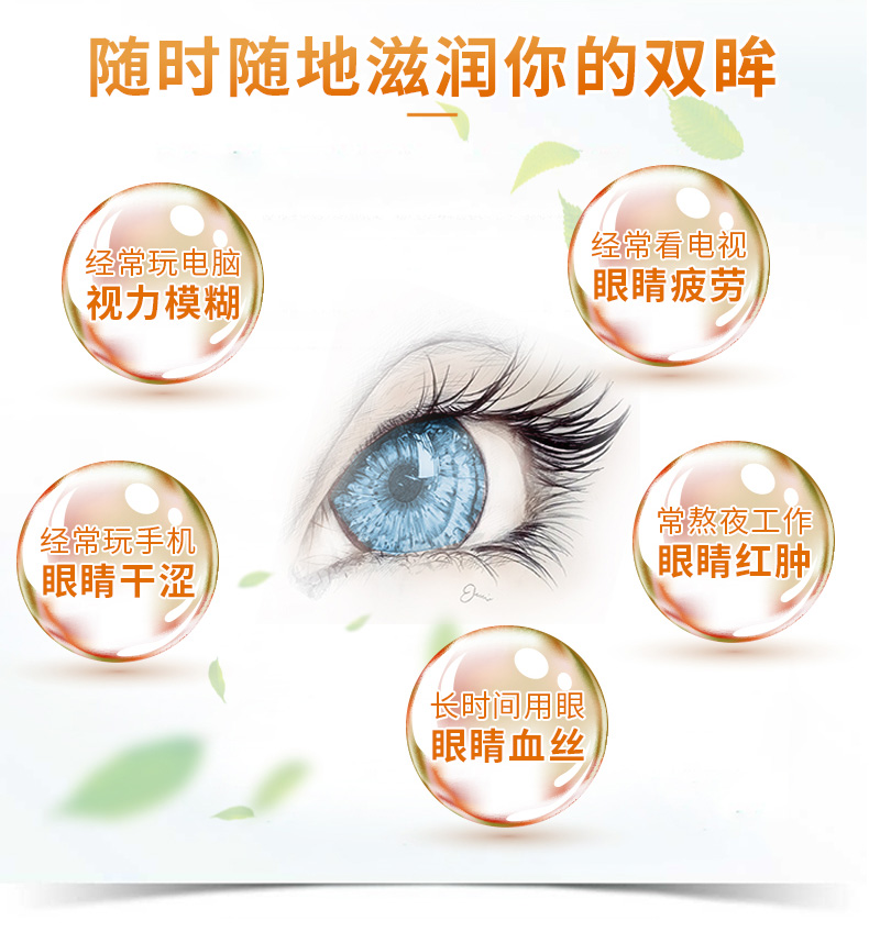 缓解眼肿痛干痒去红血丝,润眼护眼,手机控,电脑党,学生看书学习,游戏过度用眼必备良药,改善眼部微循环,促进眼组织修护。