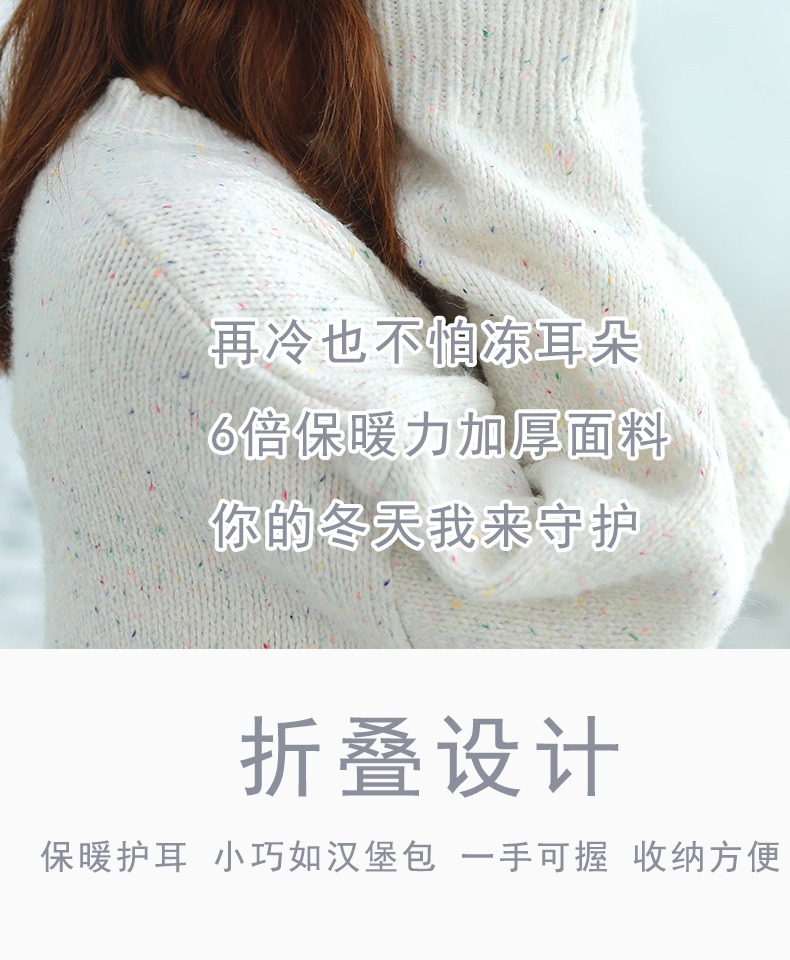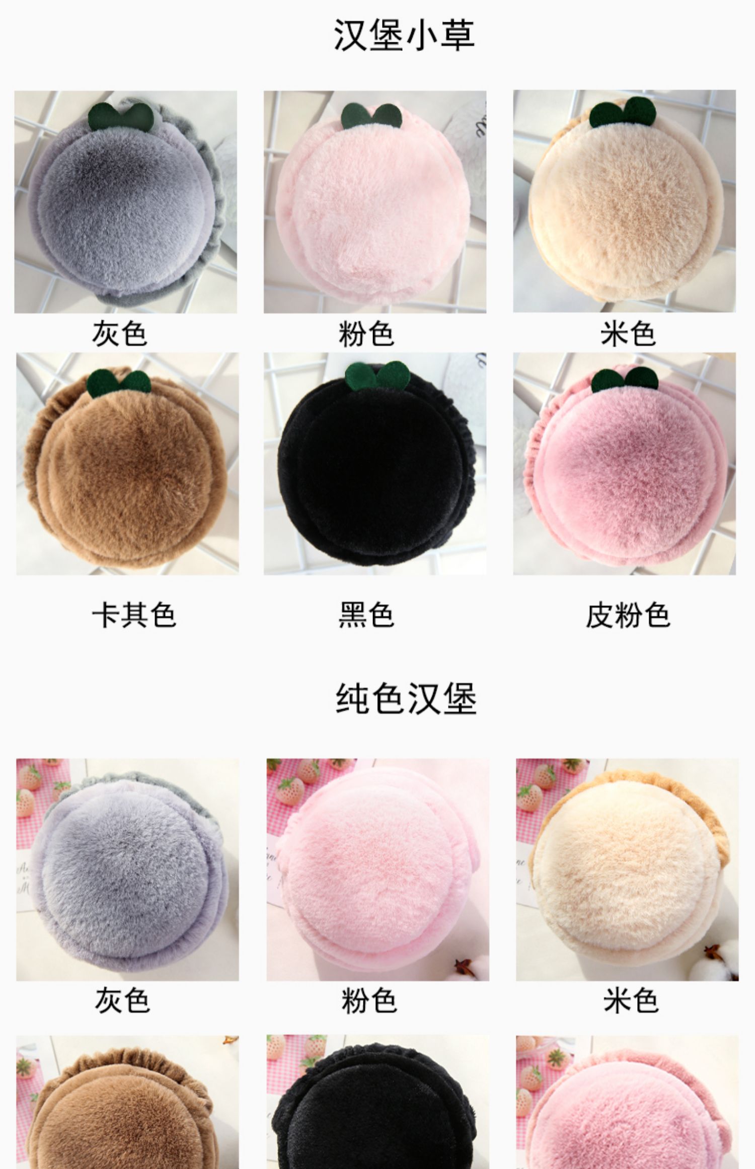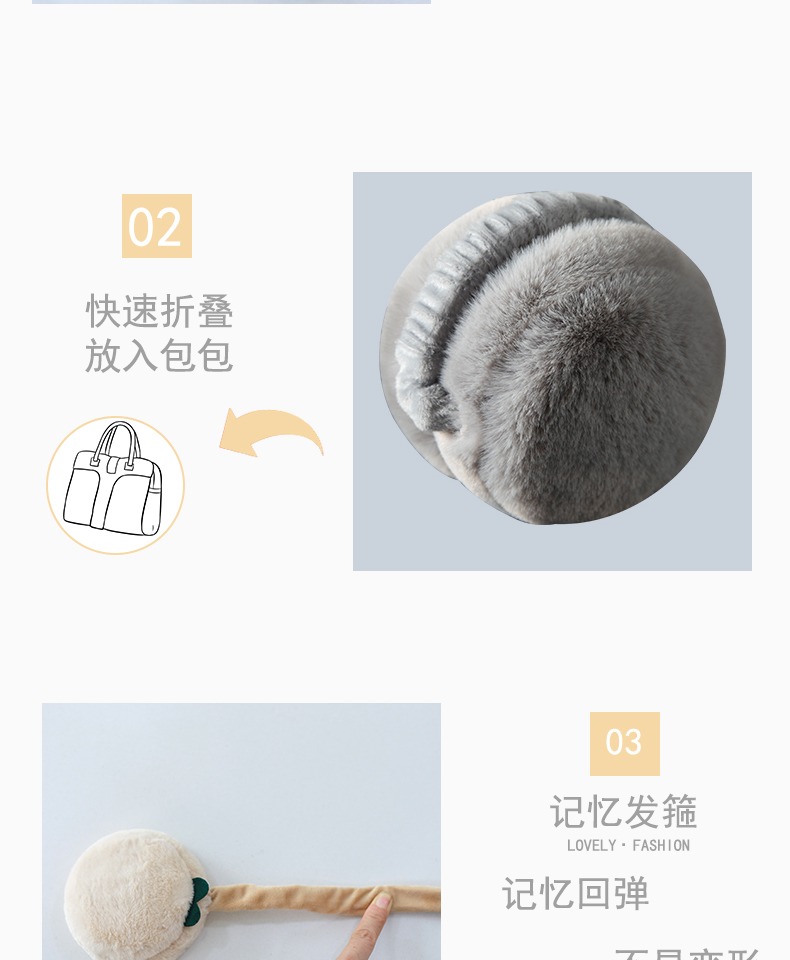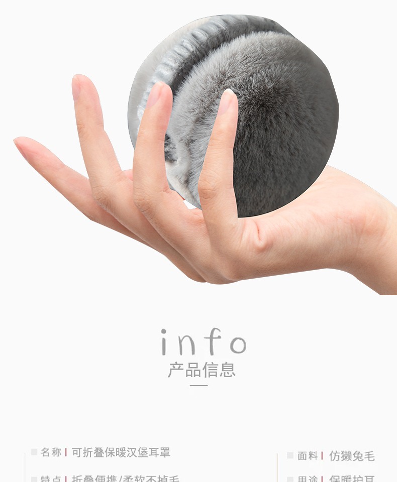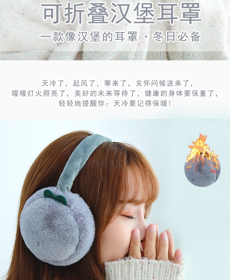 网红款出行必备神器,可折叠汉堡设计,一手可握,收纳方便,可上戴和后戴,选用上等贵妃绒毛料,亲肤又舒适,甜美可爱又护耳,记性回弹,不变形。