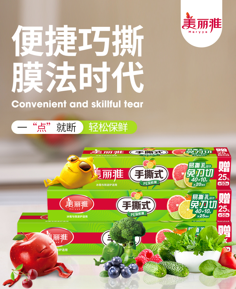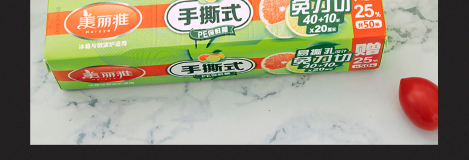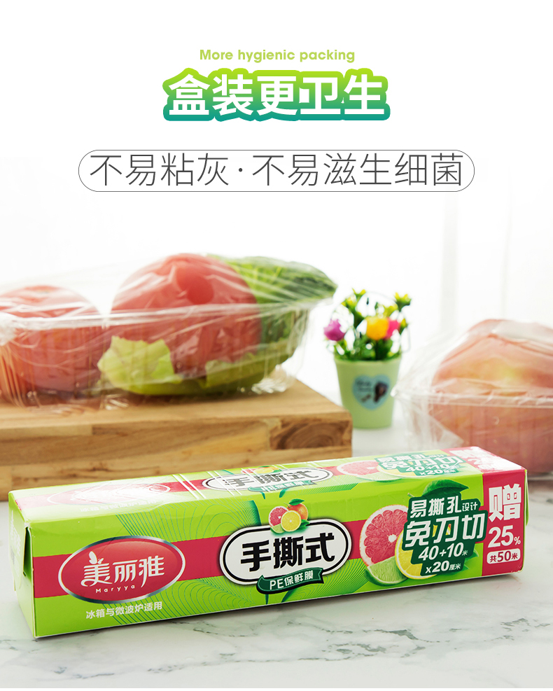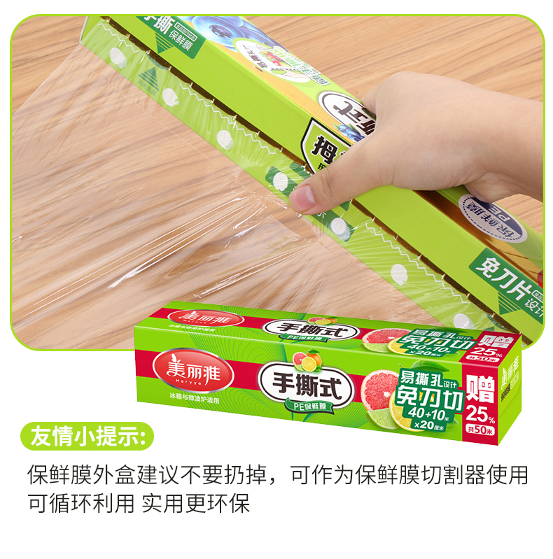 美丽雅家用多规格组合装保鲜膜,大型超市品牌,食品级PE材质,耐高温,好拉易撕,保湿保鲜,可微波加热,冰箱冷藏,使用方便,防止串味,居家必备安全健康。
